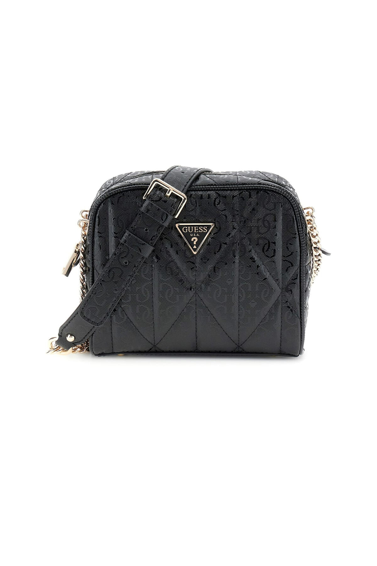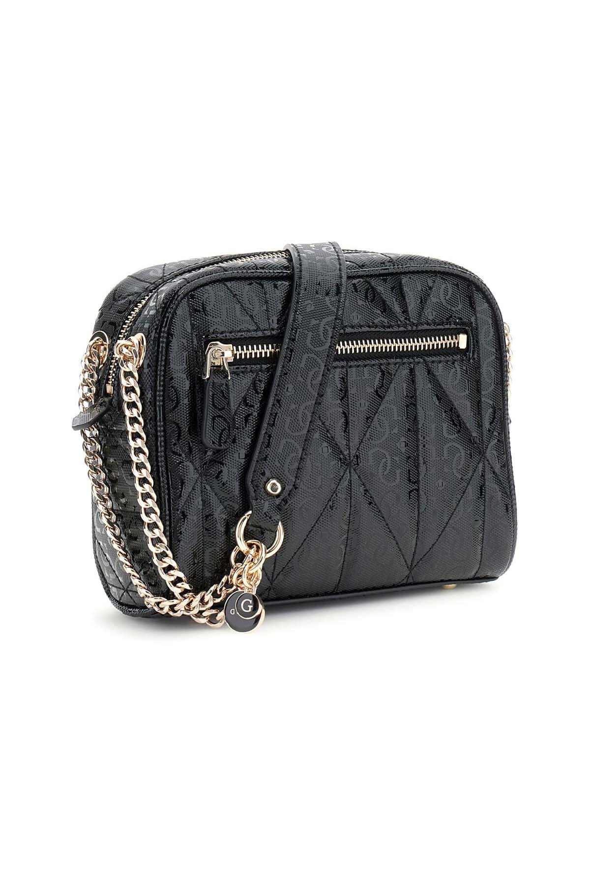 Modern ve kompakt bir tasarıma sahip bu çapraz askılı çanta, parlak rugan görünümlü yüzeyiyle göz alıcı bir şıklık sunar. Gövdeyi süsleyen kapitone dikişler ve kabartma monogram deseni, çantaya özgün ve sofistike bir doku kazandırır. Ayarlanabilir omuz askısındaki zincir detayı ve ön yüzündeki üçgen formlu metal aksesuar, çantanın modern çizgilerini tamamlar. Fermuarlı ana bölmesi ve arka yüzeyindeki ek fermuarlı cebi ile fonksiyonel bir kullanım sağlar.