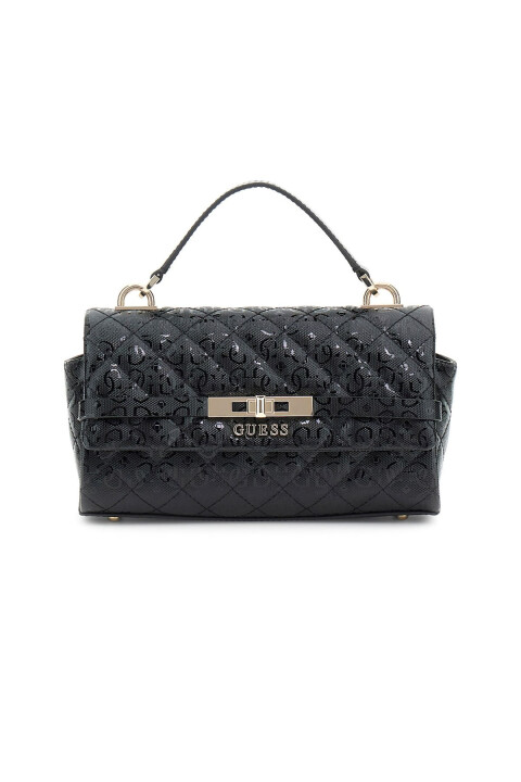 Zarif ve yapılandırılmış bir silüete sahip olan bu çanta, şıklığı ve fonksiyonelliği bir araya getirir. Parlak siyah rugan görünümlü yüzeyi, kapitone dikişler ve yüzeye işlenmiş kabartma monogram deseni ile zenginleştirilmiştir. Ön kapak üzerindeki yatay bant ve metal kilit detayı, tasarıma modern bir dokunuş katar. Çoklu bölmeli iç hacmi ve arkadaki fermuarlı cebi ile eşyalarınızı düzenlemek için geniş alan sunarken, şık üstten taşıma sapı klasik bir görünüm sağlar.
