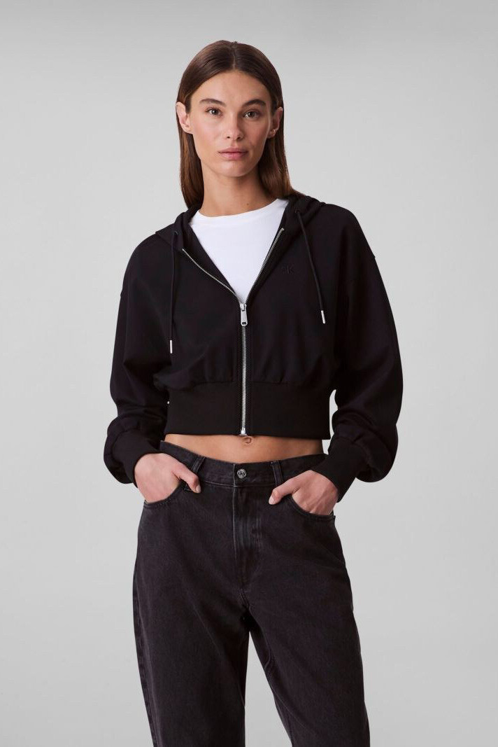 Modern ve şık bir silüet sunan bu kapüşonlu hırka, gündelik stilinize yeni bir yorum getiriyor. Pürüzsüz, dökümlü ve esnek 'Punto Milano' kumaşı, hem lüks bir his sunar hem de gün boyu konfor sağlar. Vücuda oturan kısa (cropped) kesimi, yüksek belli pantolon ve eteklerle mükemmel bir uyum yakalar. Tam boy fermuarı ve ayarlanabilir kapüşonu ile fonksiyonelliği ön planda tutarken, sırttaki zarif tonal logosu tasarıma incelikli bir imza atar.