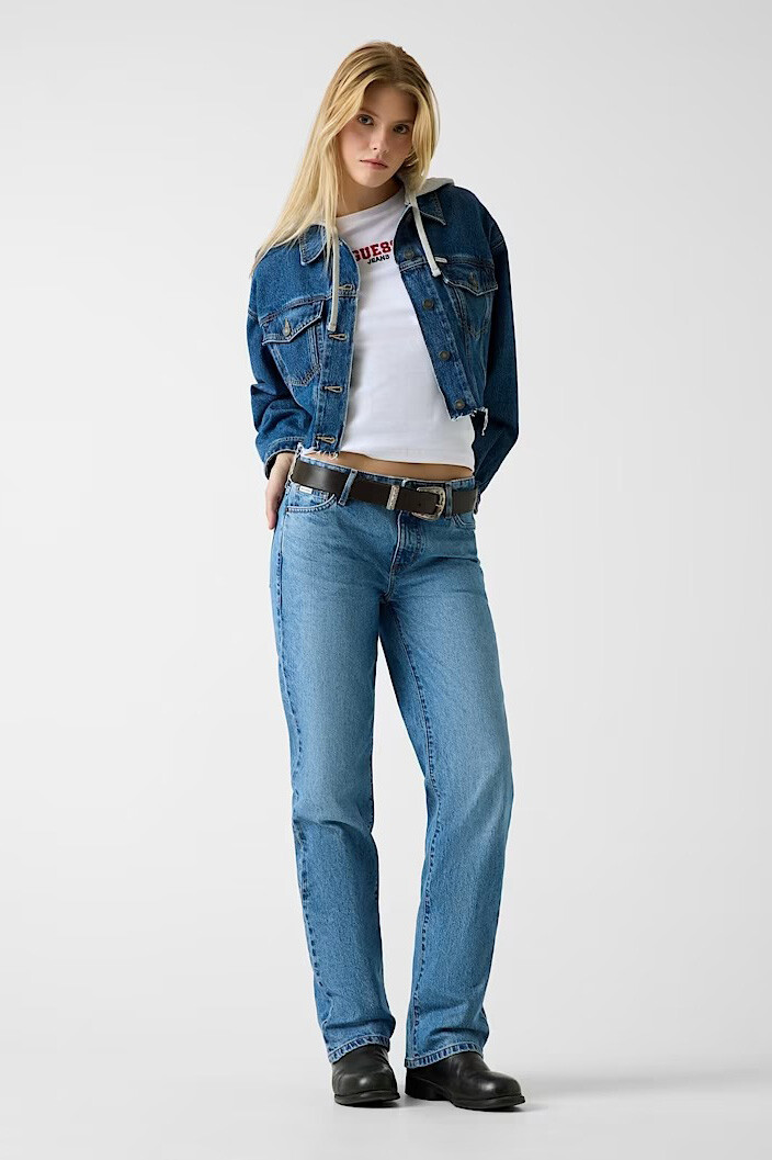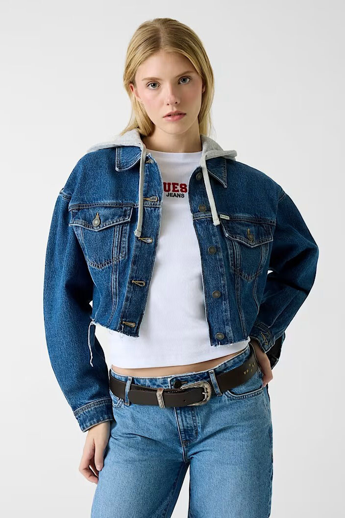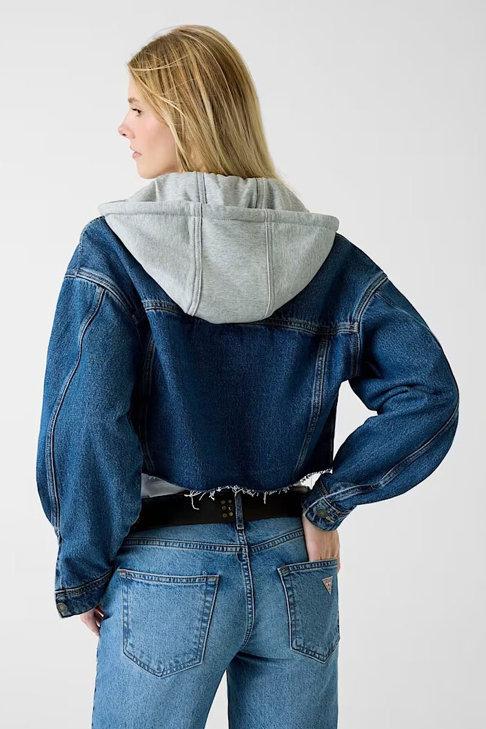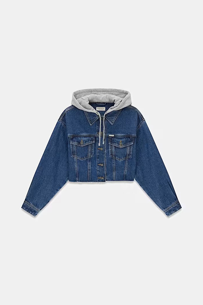 Mavi renginin zamansız mavi tonunu, gri renkli yumuşak kapüşon detayıyla birleştiren bu denim ceket, popüler katmanlı görünümü tek bir parçada sunuyor. %100 pamuklu dokusu, gerçek denim kumaşının tok duruşunu yansıtırken; 48 cm'lik modern cropped boyu ve püsküllü bırakılmış kesik etek ucu, tasarıma asi ve cool bir karakter katıyor. Düşük omuzlu rahat kalıbı, öndeki kapaklı göğüs cepleri ve metal düğme kapamasıyla sokak stilinin dinamik ruhunu yakalıyor.