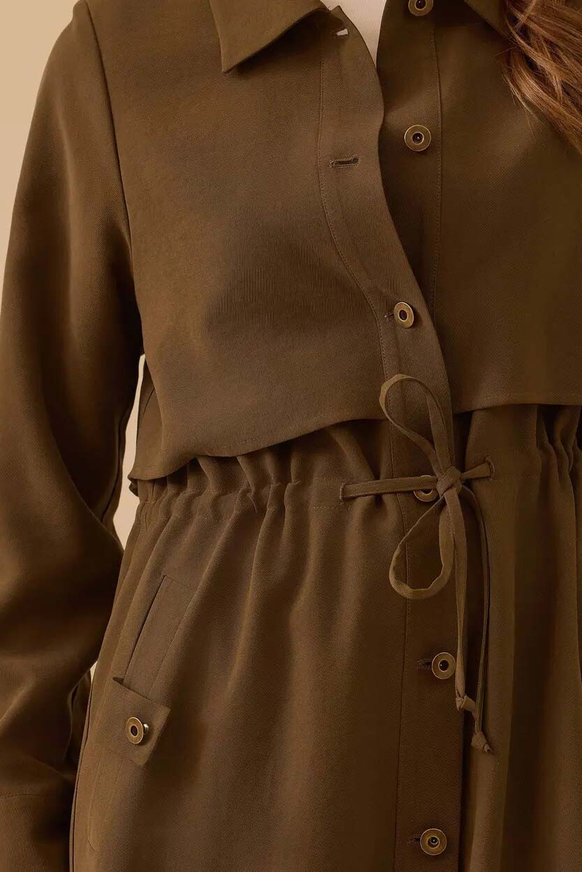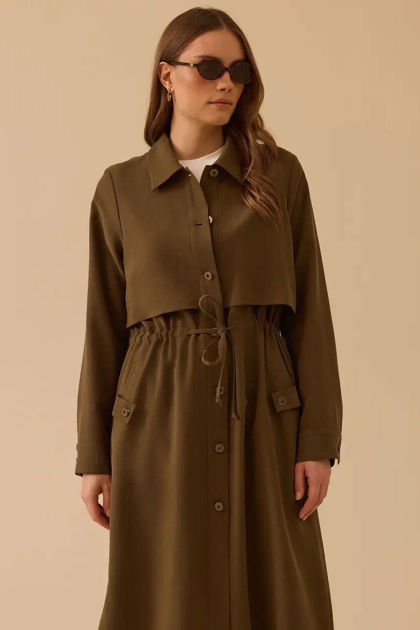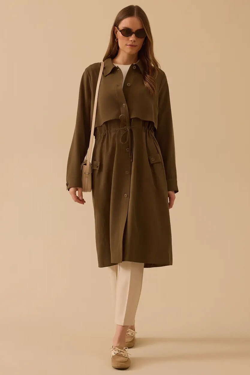 Modern şehir hayatının zarafetini taşıyan bu haki kap, katmanlı tasarımı ve ayarlanabilir bel detayıyla silüetinizi vurgularken stilinize lüks bir dokunuş katar.