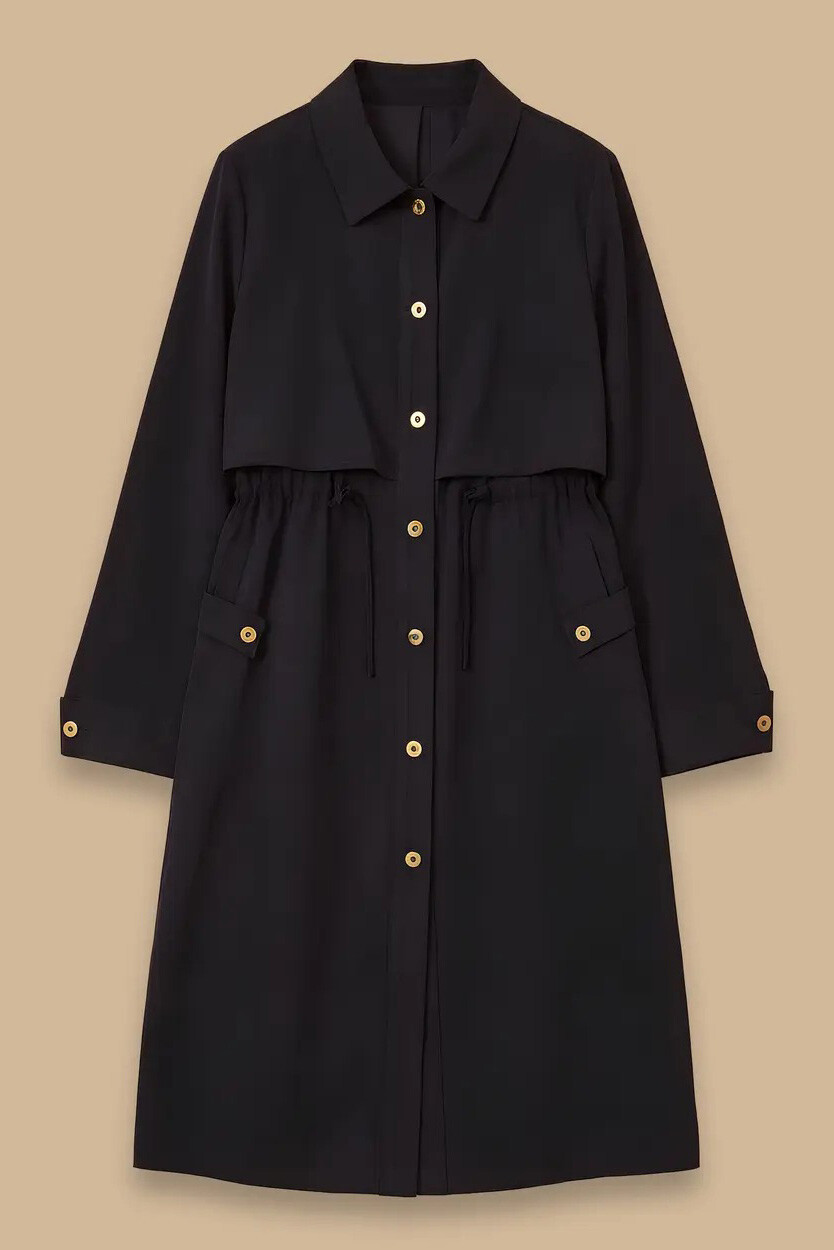 Modern şehir hayatının zarafetini taşıyan bu kap, katmanlı tasarımı ve ayarlanabilir bel detayıyla silüetinizi vurgularken stilinize lüks bir dokunuş katar.