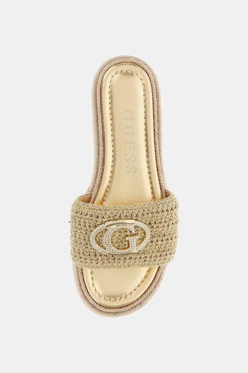 • Tasarım & Ekstra Detay: Yuvarlak burun yapısı, ön bantta parlak dore (altın renkli) metal G harfi marka logosu eklentisi, taban çevresinde hasır örgü (espadril) kaplaması, yeri kavrayan ve kaymayı önleyen kauçuk alt taban
