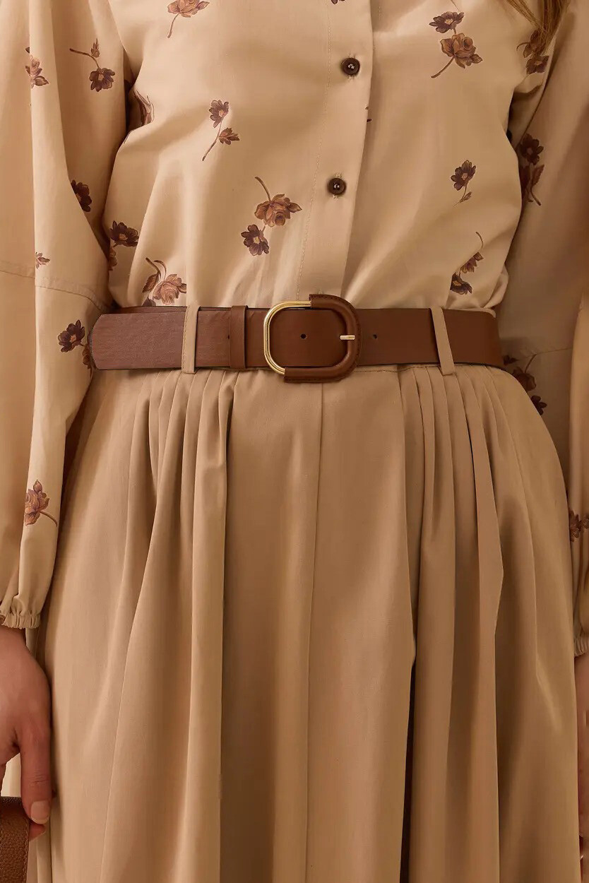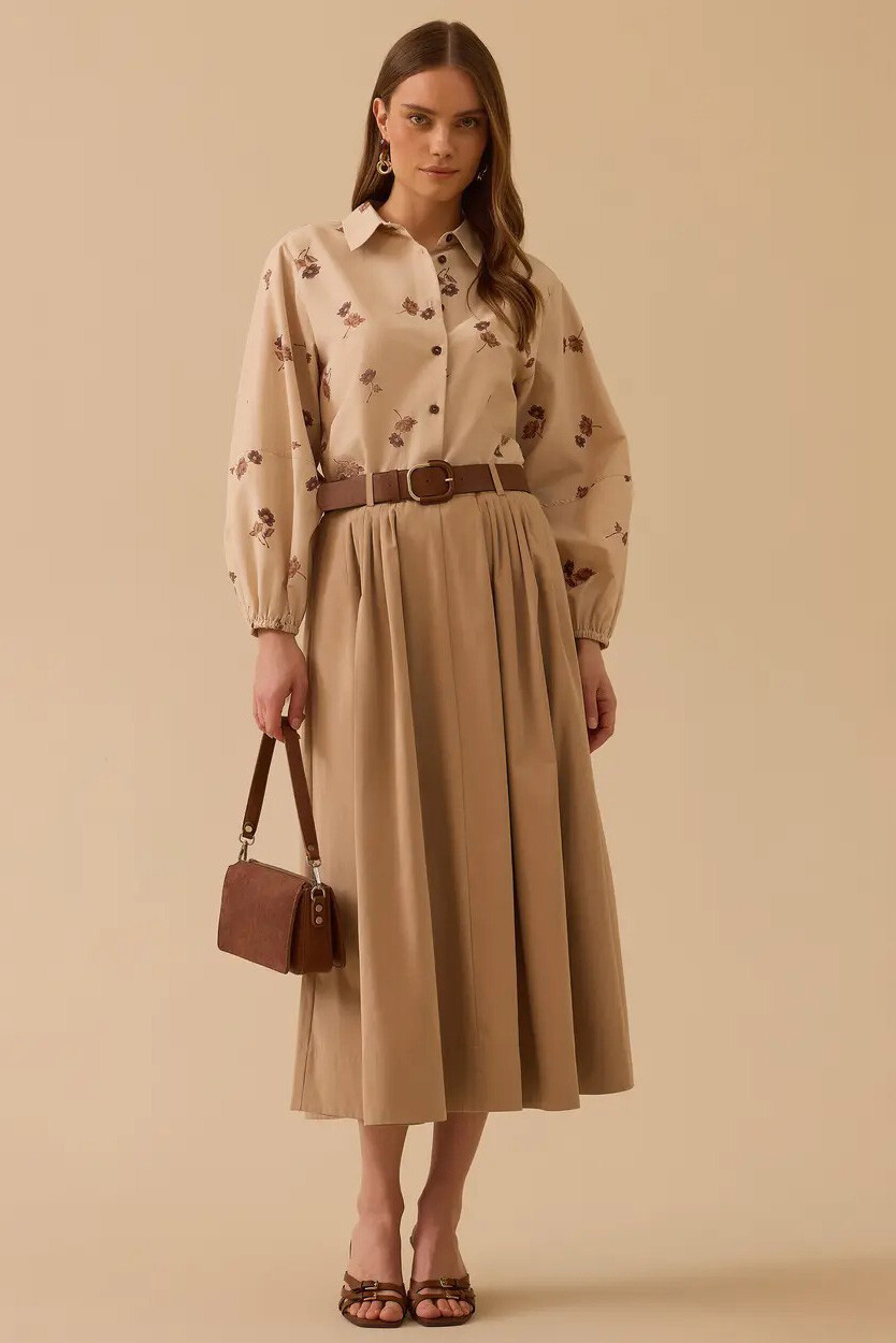Klasik zarafeti modern detaylarla buluşturan bu A kesim tasarım, silüetinizi kusursuzlaştırmak için özenle hazırlandı. Belinizi nazikçe saran ve formunu vurgulayan şık kemer detayı görünüme sofistike bir hava katarken; aşağı doğru süzülen dökümlü pileleri her hareketinizde asil bir duruş sergiler. Pratik yan cepleri ve tam kalıbıyla kullanım kolaylığı sunan bu parça, iş toplantılarından şık akşam yemeklerine kadar gardırobunuzun en zarif kurtarıcısı olmaya adaydır.