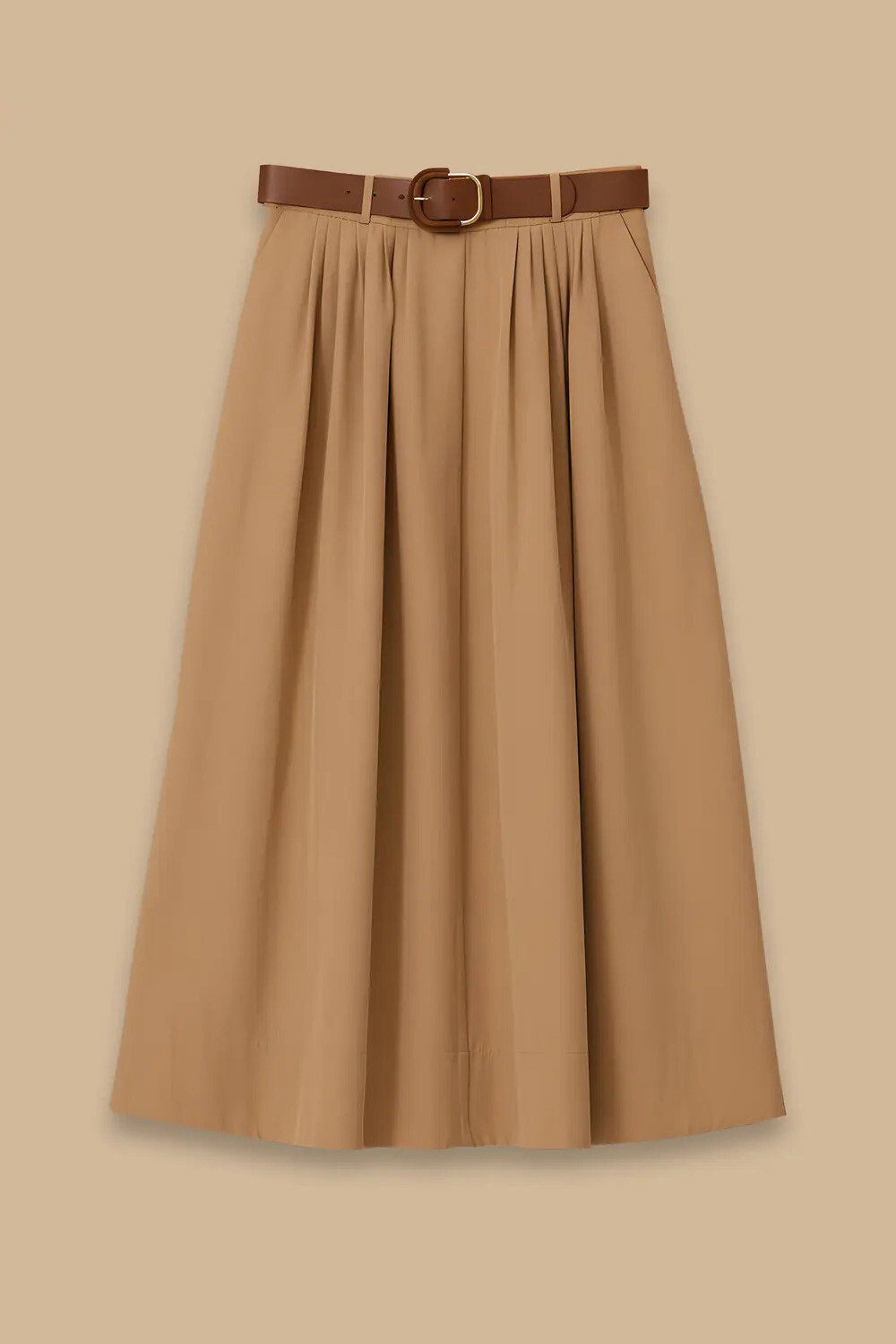 Tasarım: Bele oturan kemerli yapı, pileli dökümlü yüzey, pratik yan cepler ve fermuarlı kapama