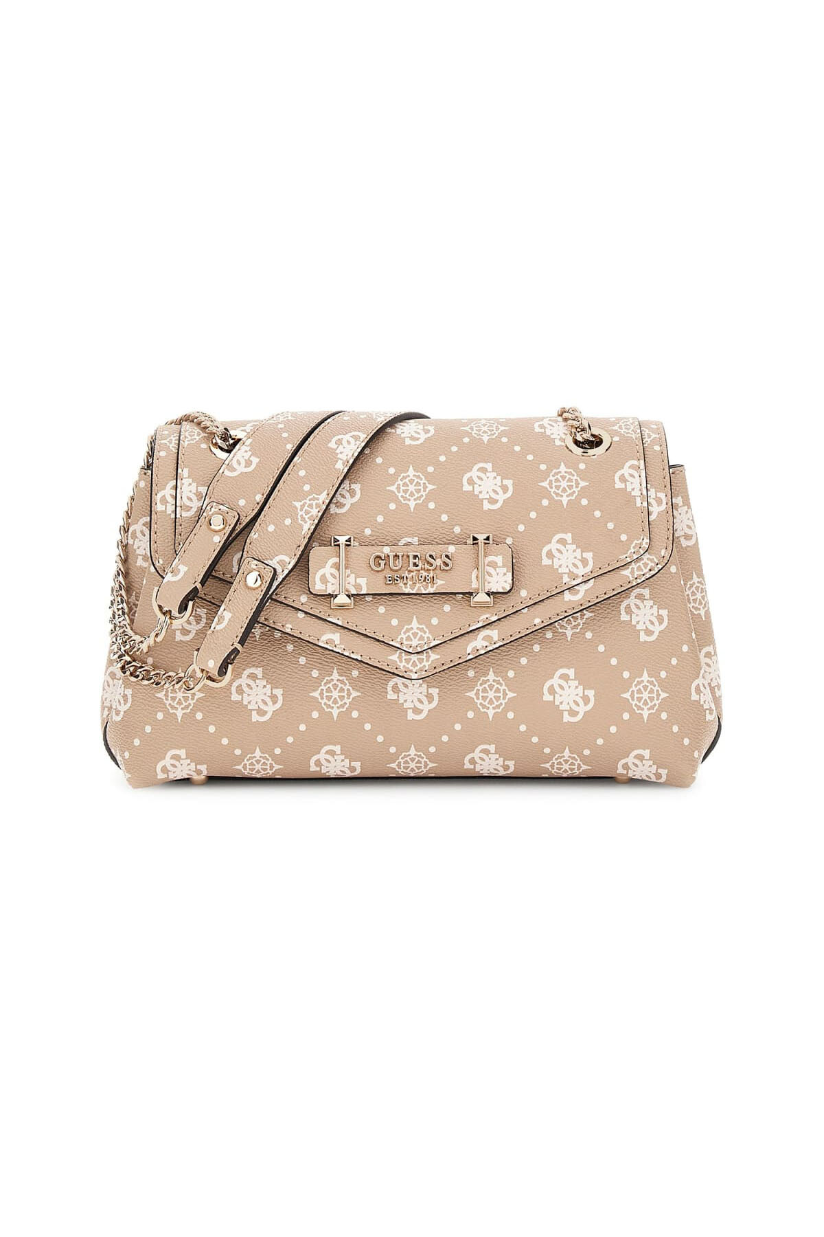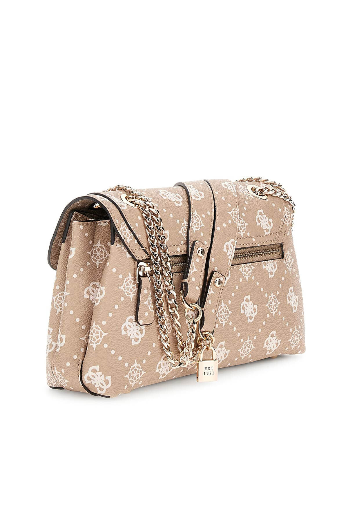 Klasik ve şık bir tasarıma sahip bu omuz çantası, tüm yüzeyini kaplayan monogram deseniyle dikkat çeker. Ön kapak üzerindeki yatay bant ve metal plaka detayı, çantaya modern bir dokunuş katarken, askıdan sarkan asma kilit formundaki charm aksesuar tasarıma özgün bir imza atar. Zincir detaylı omuz askısı şıklığı artırırken, arka yüzeydeki fermuarlı cep pratik bir kullanım sunar.