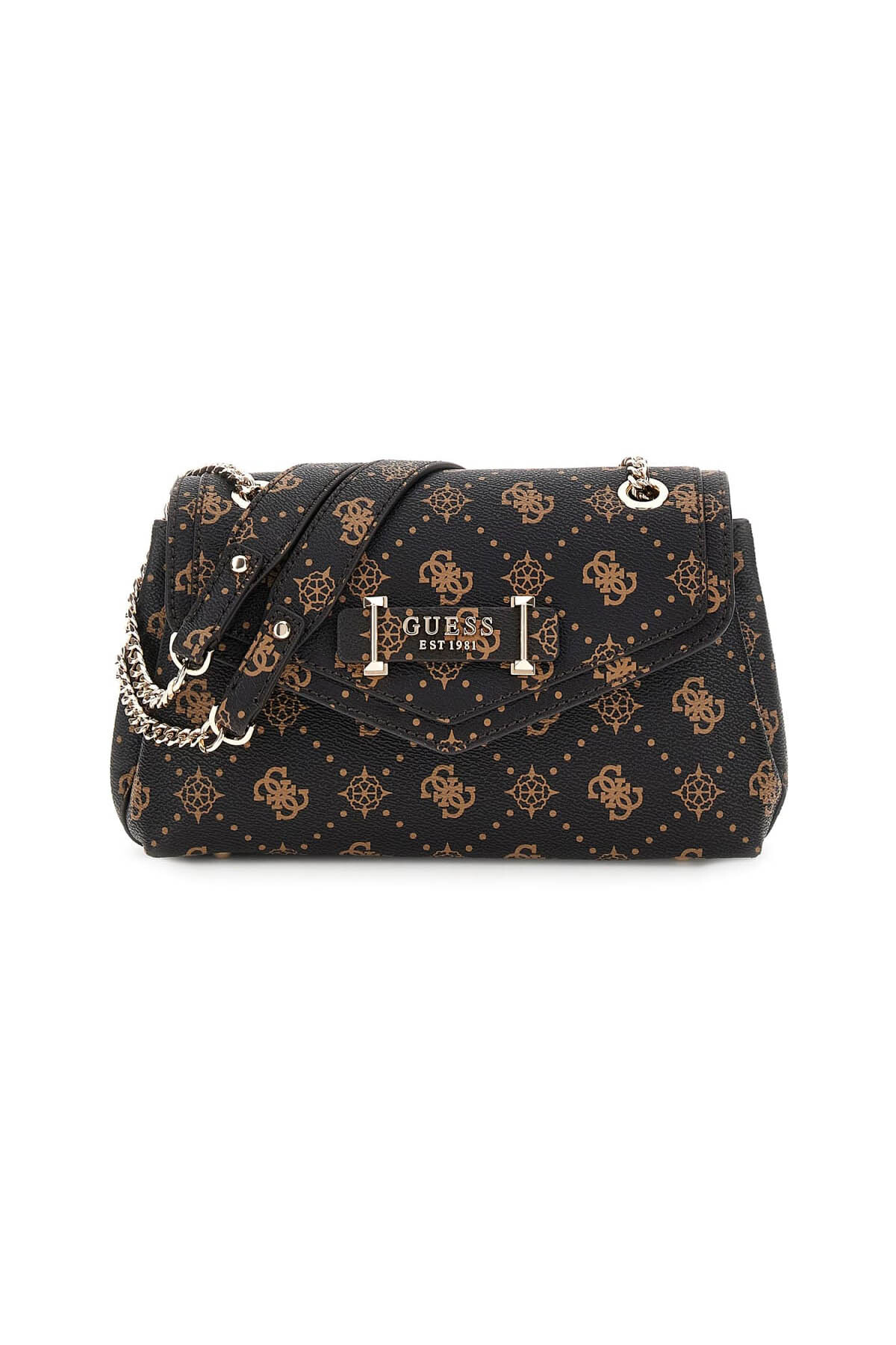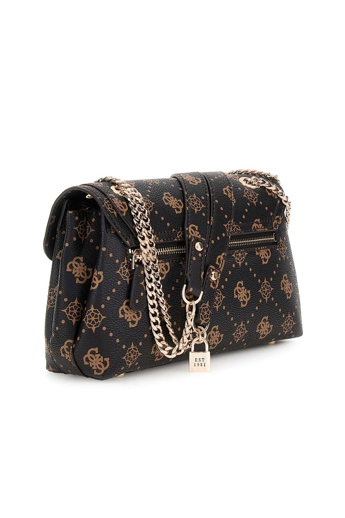 Klasik ve şık bir tasarıma sahip bu omuz çantası, tüm yüzeyini kaplayan monogram deseniyle dikkat çeker. Ön kapak üzerindeki yatay bant ve metal plaka detayı, çantaya modern bir dokunuş katarken, askıdan sarkan asma kilit formundaki charm aksesuar tasarıma özgün bir imza atar. Zincir detaylı omuz askısı şıklığı artırırken, arka yüzeydeki fermuarlı cep pratik bir kullanım sunar.