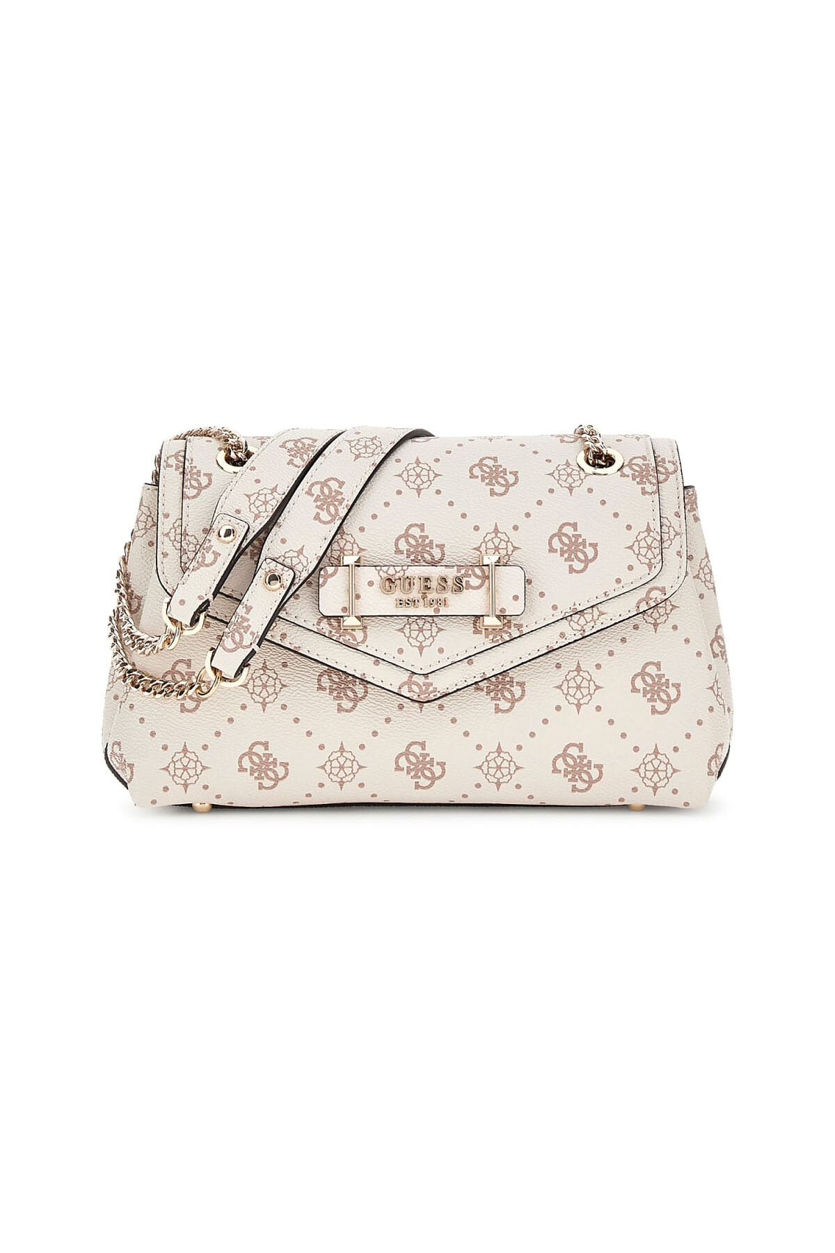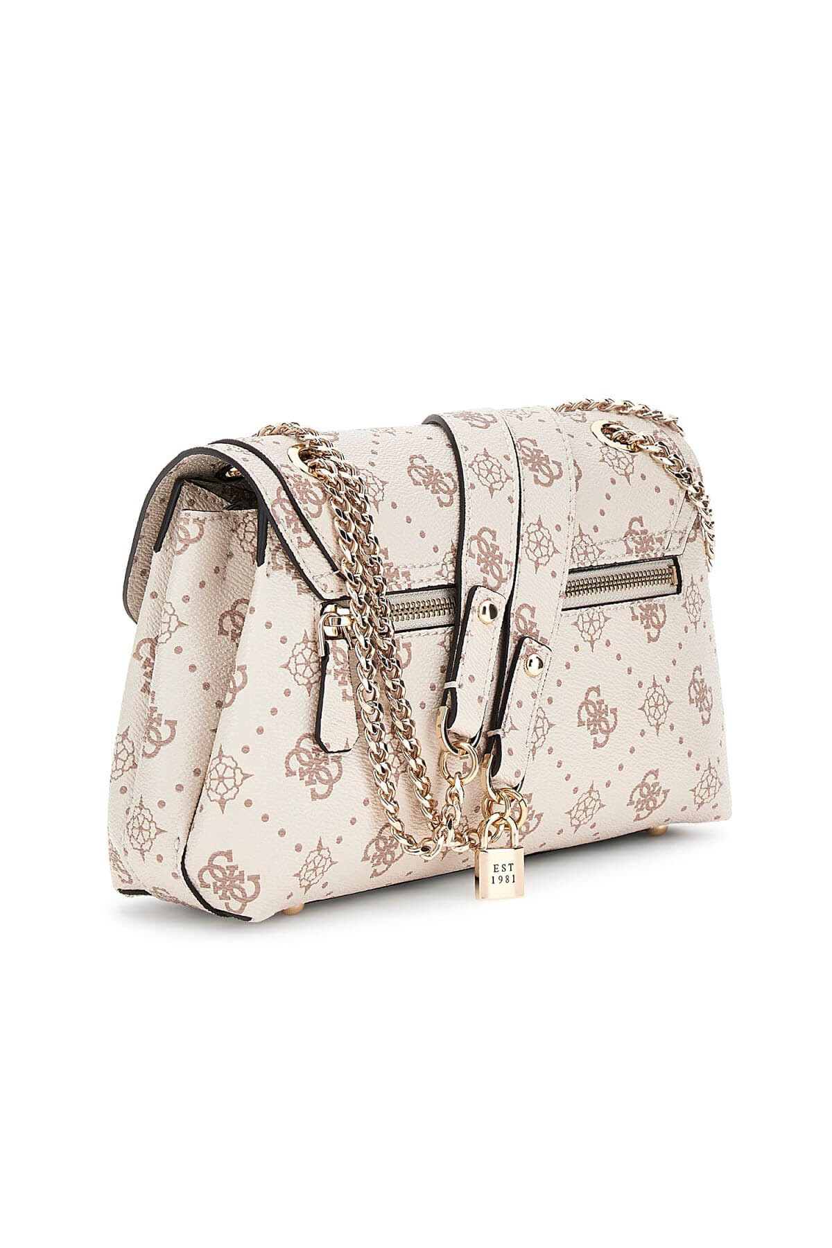 Klasik ve şık bir tasarıma sahip bu omuz çantası, tüm yüzeyini kaplayan monogram deseniyle dikkat çeker. Ön kapak üzerindeki yatay bant ve metal plaka detayı, çantaya modern bir dokunuş katarken, askıdan sarkan asma kilit formundaki charm aksesuar tasarıma özgün bir imza atar. Zincir detaylı omuz askısı şıklığı artırırken, arka yüzeydeki fermuarlı cep pratik bir kullanım sunar.