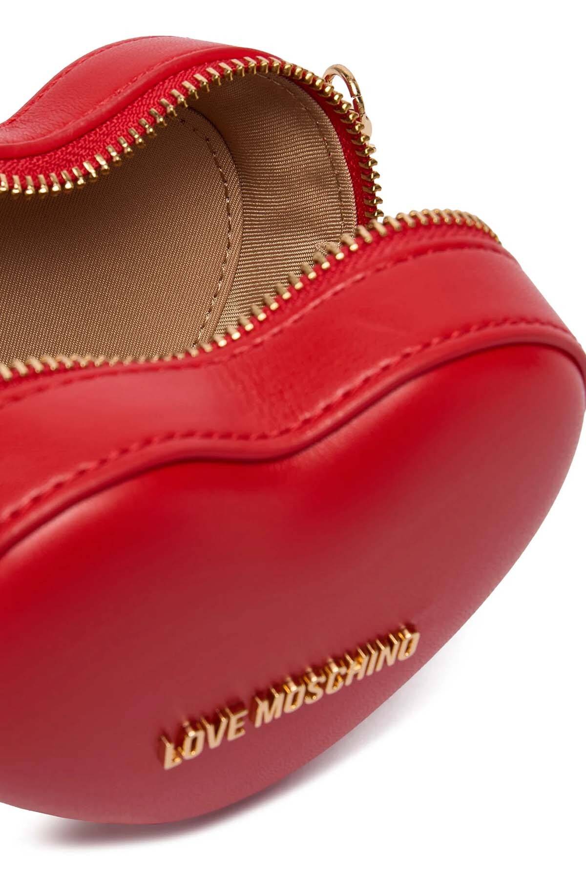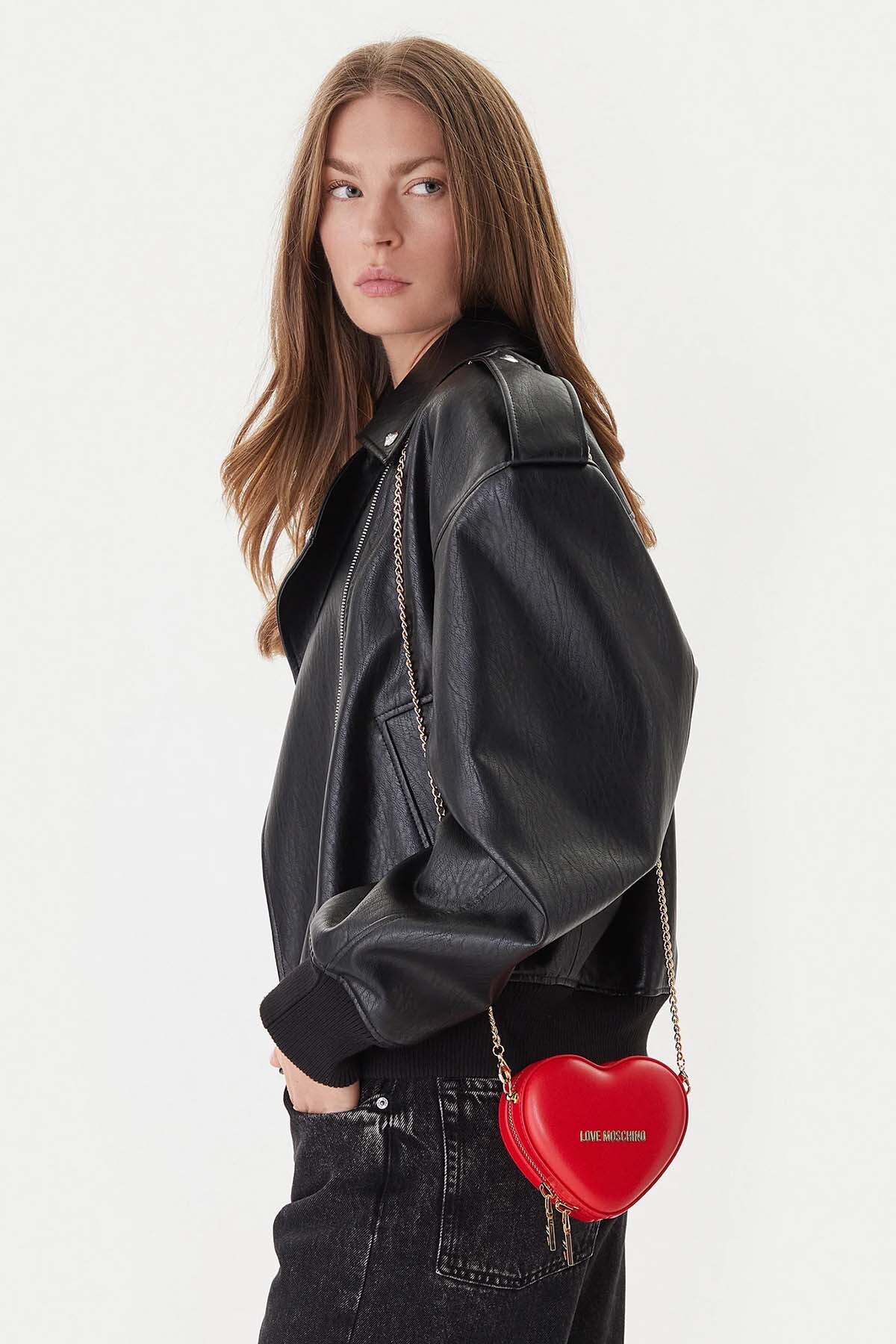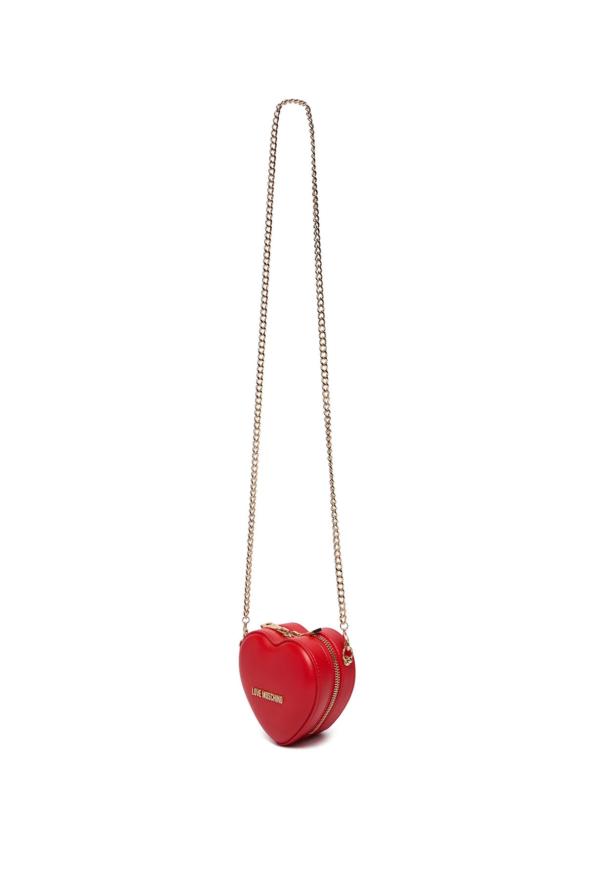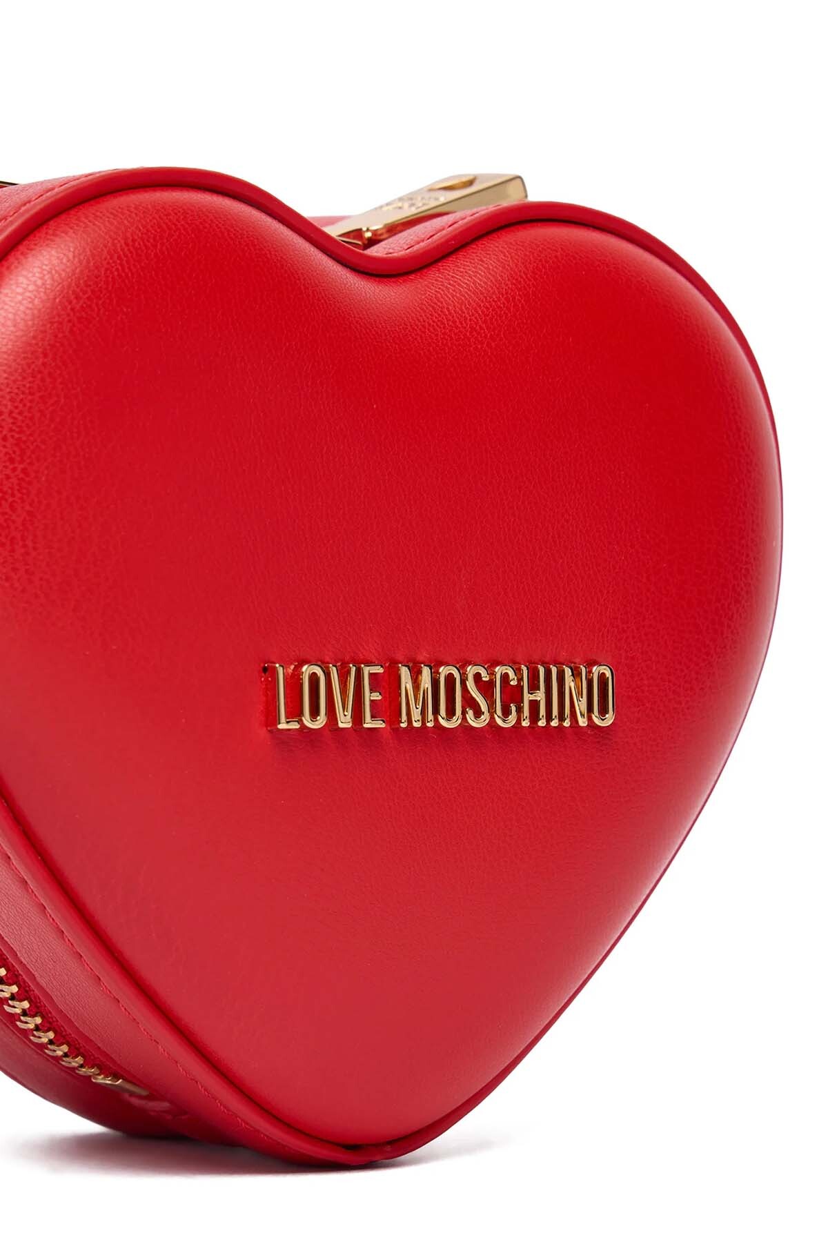 Love Moschino’nun ikonik kırmızı kalp formuna sahip mini omuz çantası, gold zincir askı detayıyla modern ve dikkat çekici bir görünüm sunar.