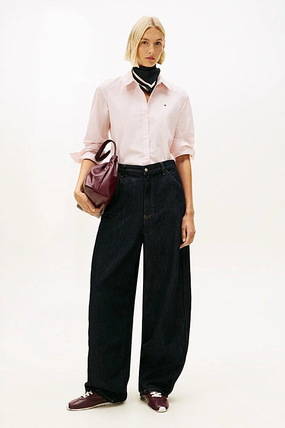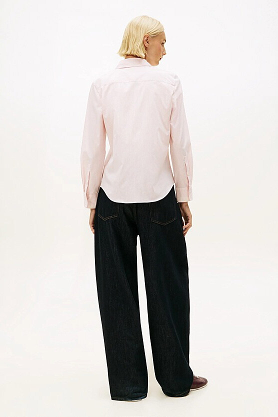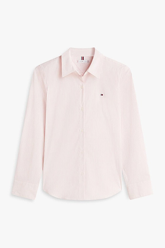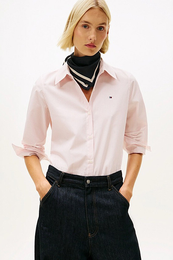 %97 pamuk ve %3 elastan içeren esnek poplin kumaşı sayesinde gün boyu hareket özgürlüğü ve nefes alabilen bir konfor sunar. Klasik dikey çizgi deseniyle zamansız bir şıklık yaratan bu tasarım, vücudu nazikçe saran ancak sıkmayan normal kesimiyle hem ofis hem de günlük stiliniz için ideal bir tercihtir. Sol göğüs üzerindeki ikonik küçük bayrak logosu, sade tasarıma zarif bir detay kazandırır. Gömlek yaka ve uzun kollu yapısı, her mevsim kullanılabilecek çok yönlü bir parça olmasını sağlar.