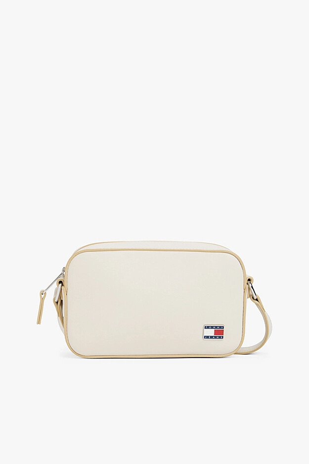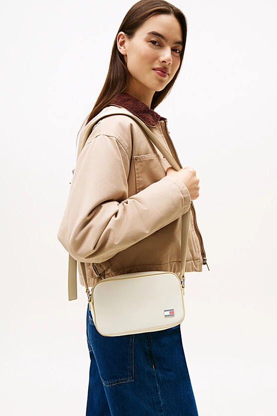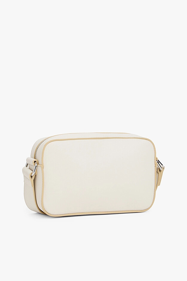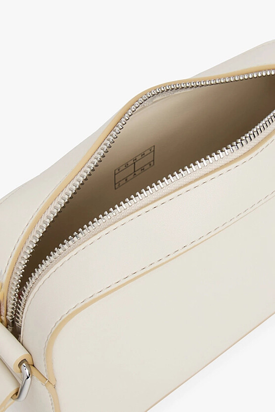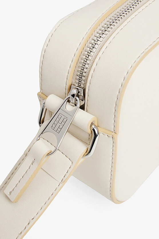 Hareketli günler için tasarlanmış bu çok yönlü kamera çantası, zarif hatları ve sofistike kontrast detayıyla öne çıkıyor. Pürüzsüz poliüretan malzemeden üretilen çantanın kırık beyaz rengi, bej renkli biyelerle şık bir şekilde çerçevelenmiştir. Fermuarlı ana bölmesi günlük ihtiyaçlarınız için güvenli bir alan sunar. Ayarlanabilir çapraz askısı, kişiye özel bir uyum ve gün boyu konforlu, eller serbest bir kullanım kolaylığı sağlar. Ön yüzündeki küçük metal amblem plakası, tasarıma rafine bir son dokunuş yapar.