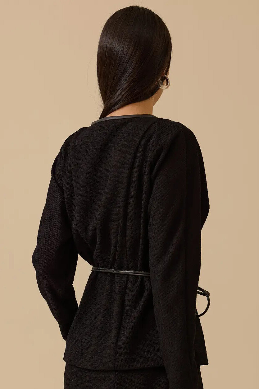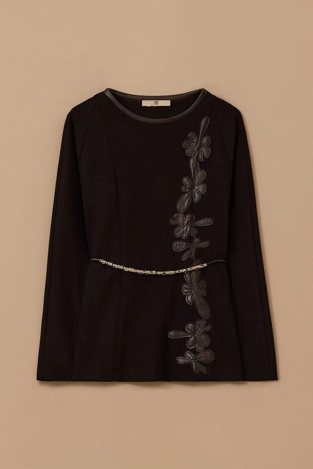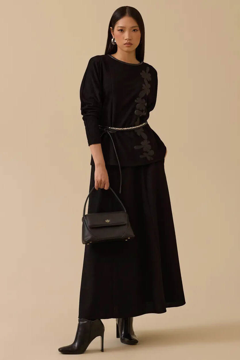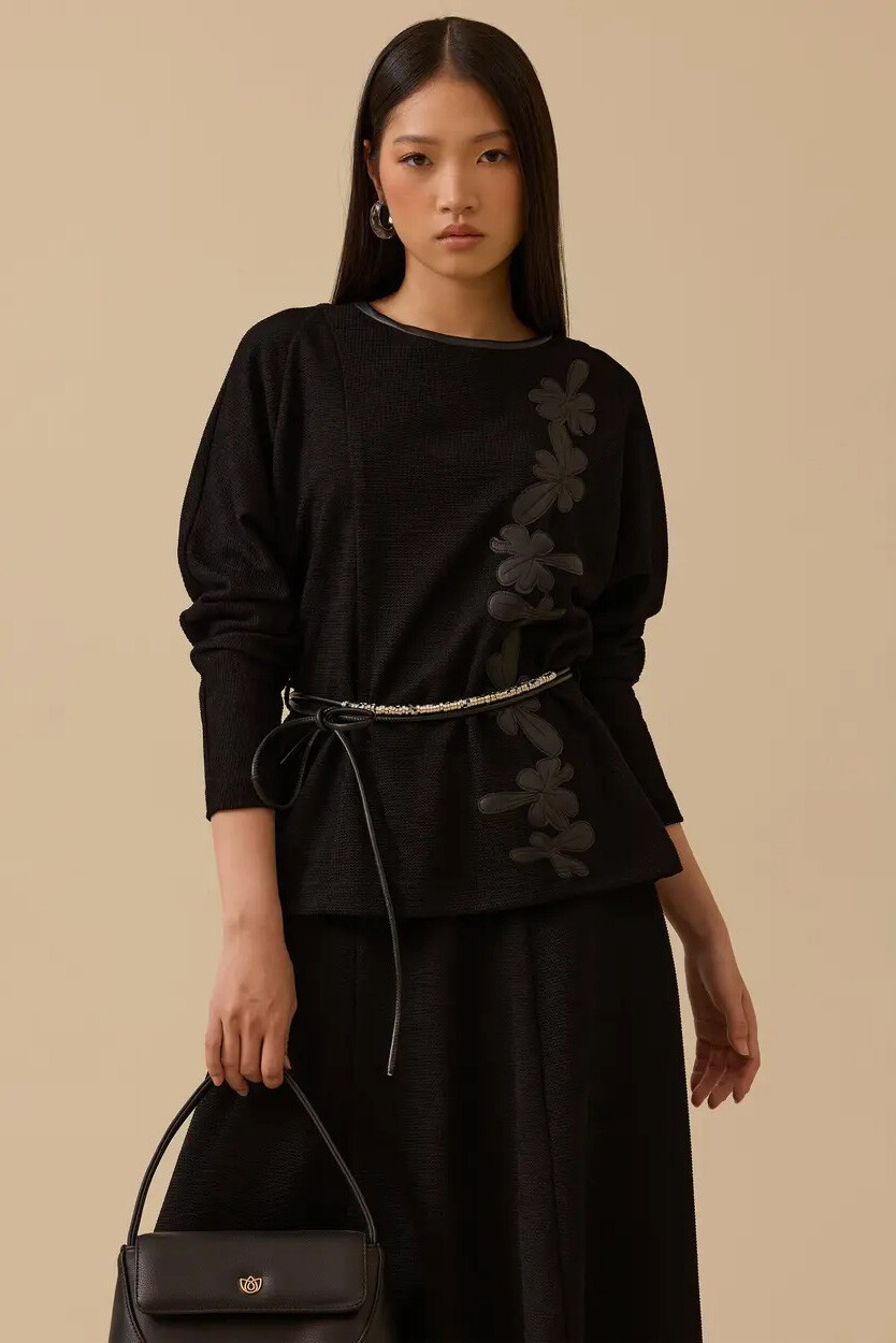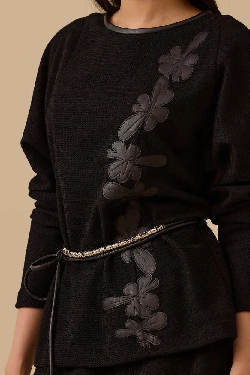 Tüvit dokumanın asil duruşunu suni deri nakışların modern sanatıyla buluşturan bu bluz, gardırobunuzun en iddialı ve sofistike parçalarından biri olmaya aday. Bedeninizi nazikçe saran kalıbı ve ön yüzeyi boyunca uzanan göz alıcı deri çiçek aplikeleri, her ortamda sarsılmaz bir özgüven ve prestijli bir silüet sergilemenizi sağlar. Zarif ince kuşağı ile bel hattınızı estetik bir şekilde vurgularken; yuvarlak yakası ve reglan kol kesimi sayesinde ofis stilinizden seçkin akşam davetlerine kadar çabasız bir lüks deneyimi vadeder.