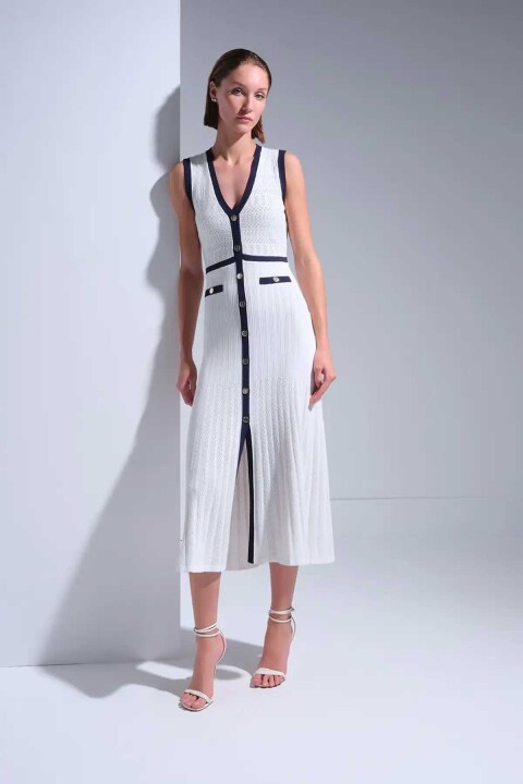 Kadın Lacivert Şerit Detaylı Midi Elbise - Beyaz