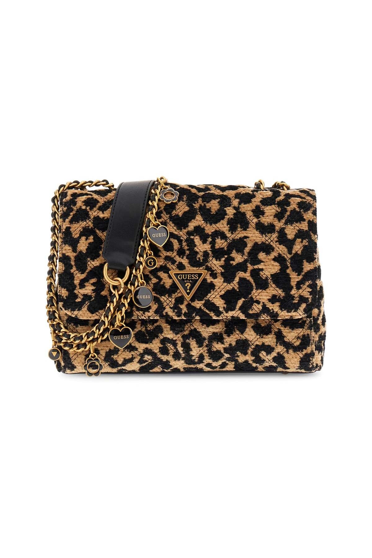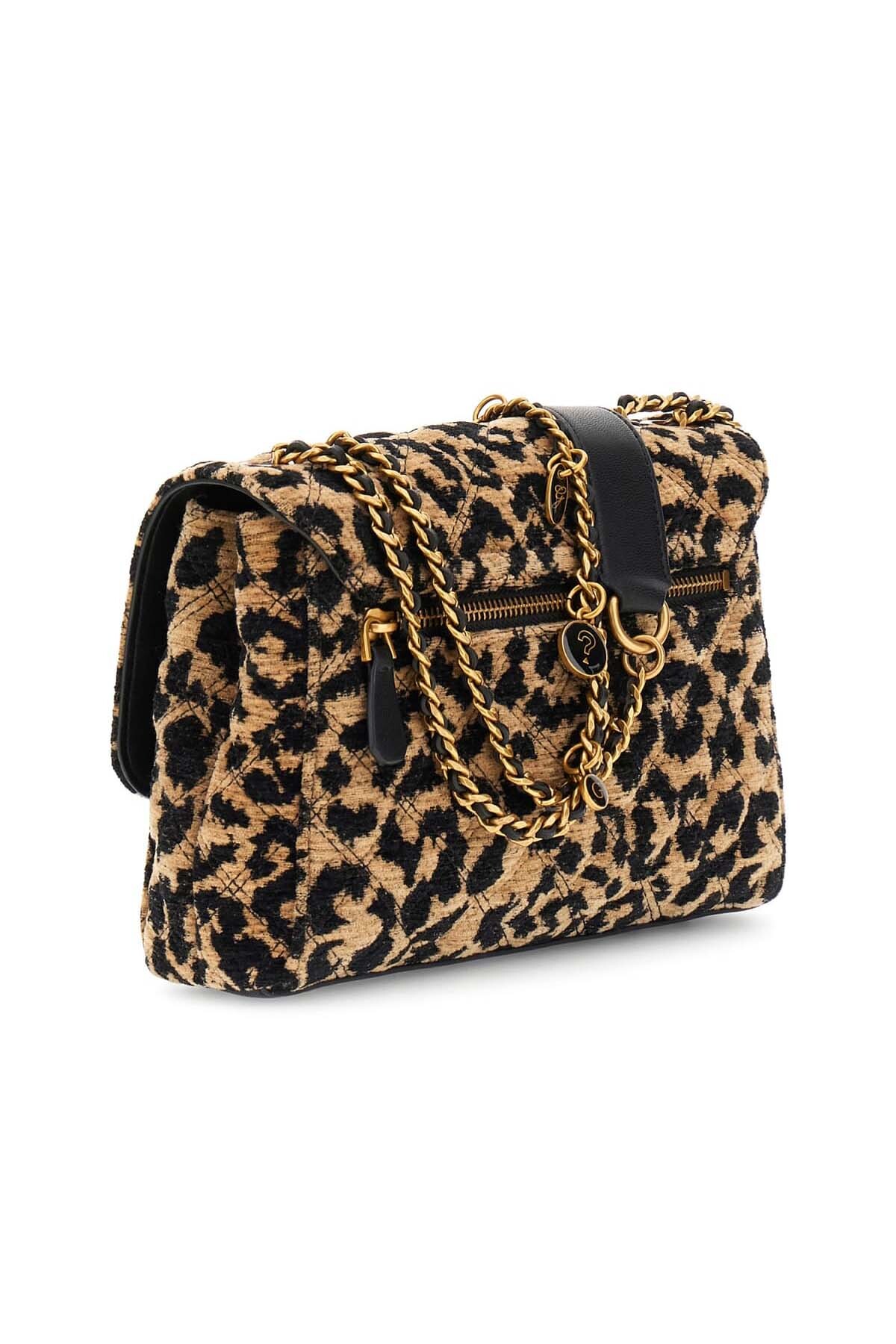 Zengin dokulu jakarlı kumaşı ve göz alıcı leopar deseniyle bu omuz çantası, stilinize iddialı bir karakter katar. Kumaş üzerine işlenmiş zarif kapitone dikişler, tasarıma derinlik kazandırır. Parlak zincir askısı ve askıya takılı dekoratif metal charm'lar, çantanın lüks ve eğlenceli ruhunu yansıtır. Ön kapaktaki üçgen formlu metal aksesuar şık bir son dokunuş yaparken, arka kısmındaki fermuarlı cep pratik bir kullanım sunar.