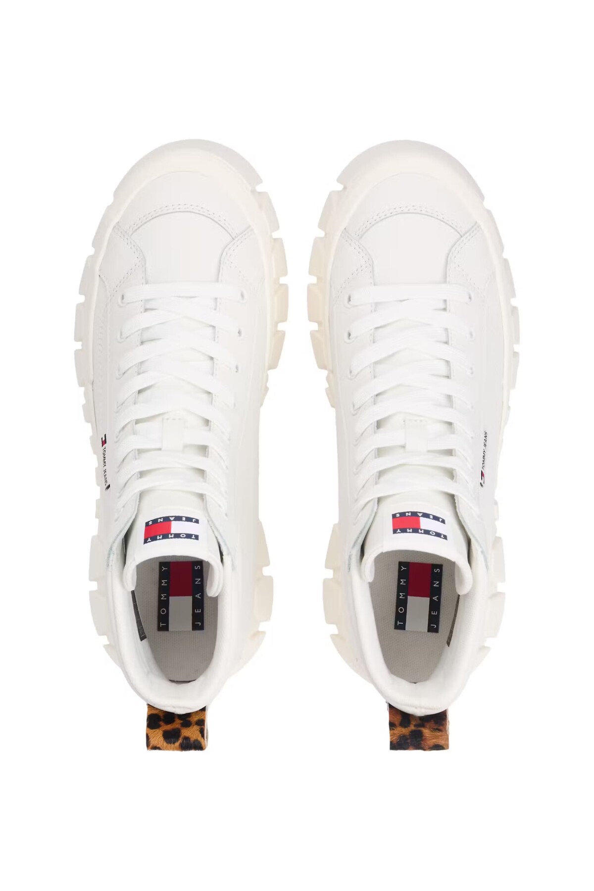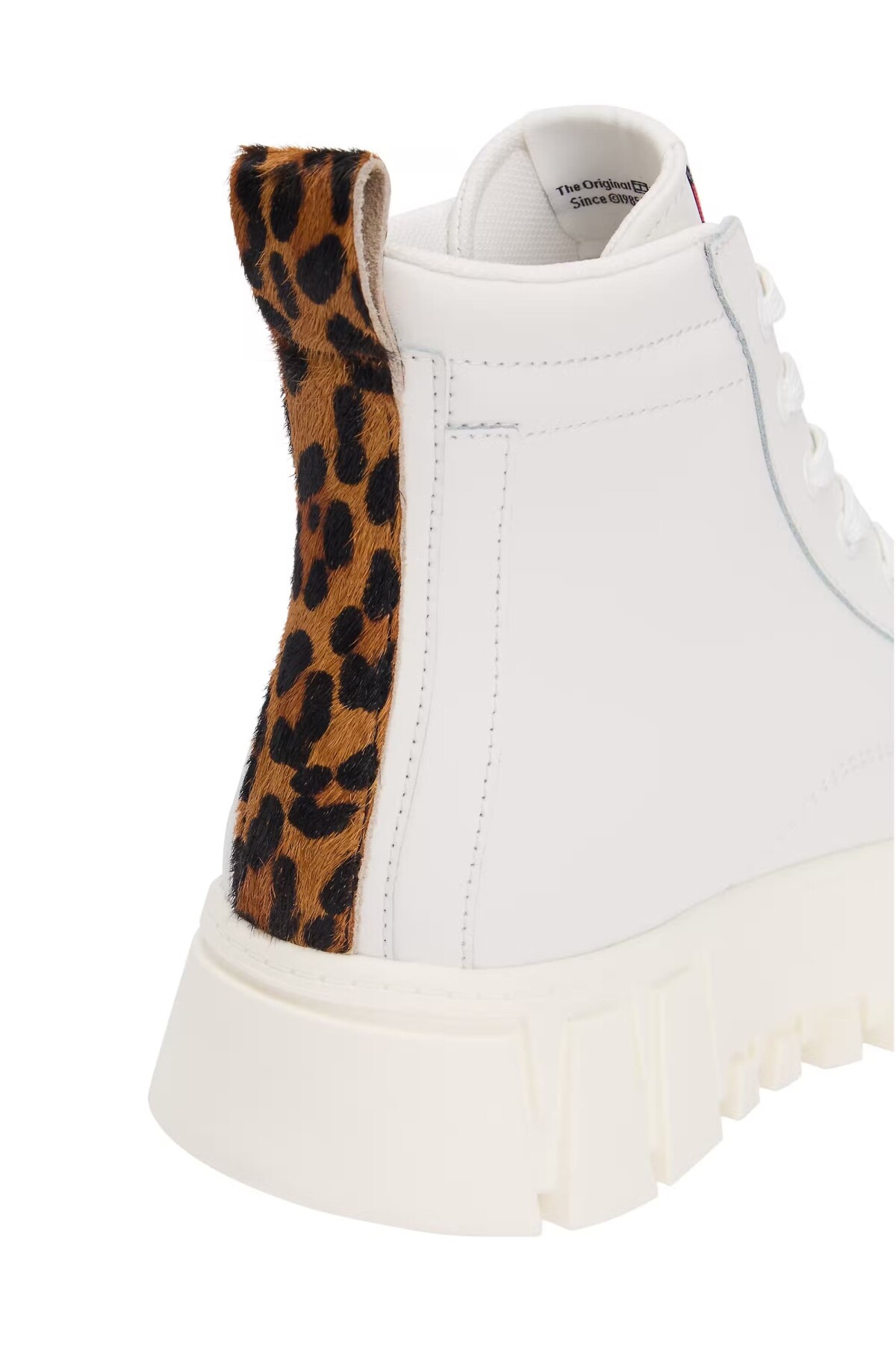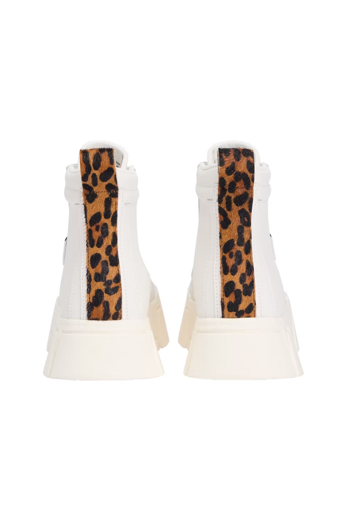 Klasik bilekli sneaker modelini, iddialı detaylarla yeniden yorumlayan bu ayakkabı, stilinize modern bir dokunuş katıyor. Kalın ve tırtıklı platform tabanı, hem güncel trendleri yakalıyor hem de boyunuza yükseklik katıyor. Tasarımın en dikkat çekici unsuru olan topuktaki leopar desenli panel, sade beyaz silüete vahşi ve eğlenceli bir karakter kazandırır. Her türlü jean, etek ve elbiseyle kombinleyerek stilinize imza atın.