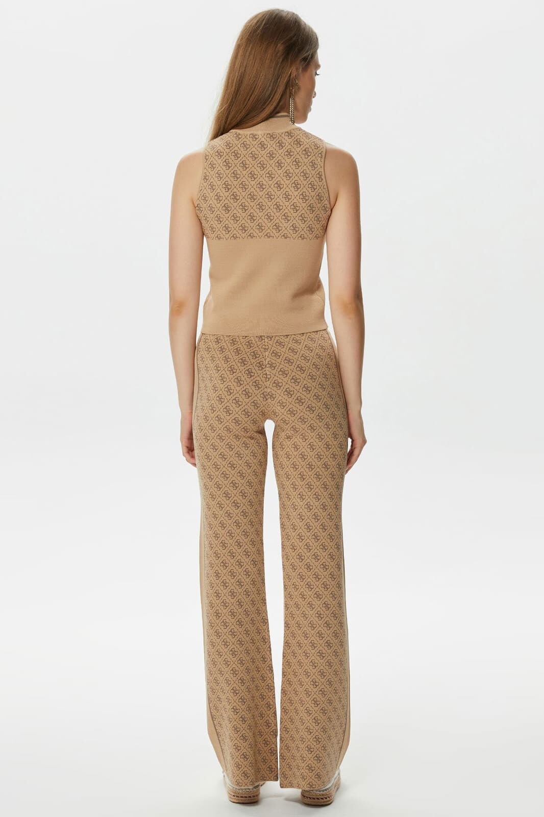 Sofistike ve modern bir stil sunan bu kolsuz triko top, gardırobunuza zarif bir dokunuş katıyor. Vücudu saran esnek ve yumuşak triko kumaşı, konforlu bir kullanım sağlarken şık bir silüet yaratır. Göğüs kısmını süsleyen göz alıcı jakarlı monogram deseni ve yakasındaki ince kontrast şerit detayı, tasarıma lüks bir hava katar. Tek başına pantolon veya eteklerle kullanılabileceği gibi, uyumlu eteği ile bir araya getirilerek dikkat çekici bir takım görünümü de oluşturulabilir.