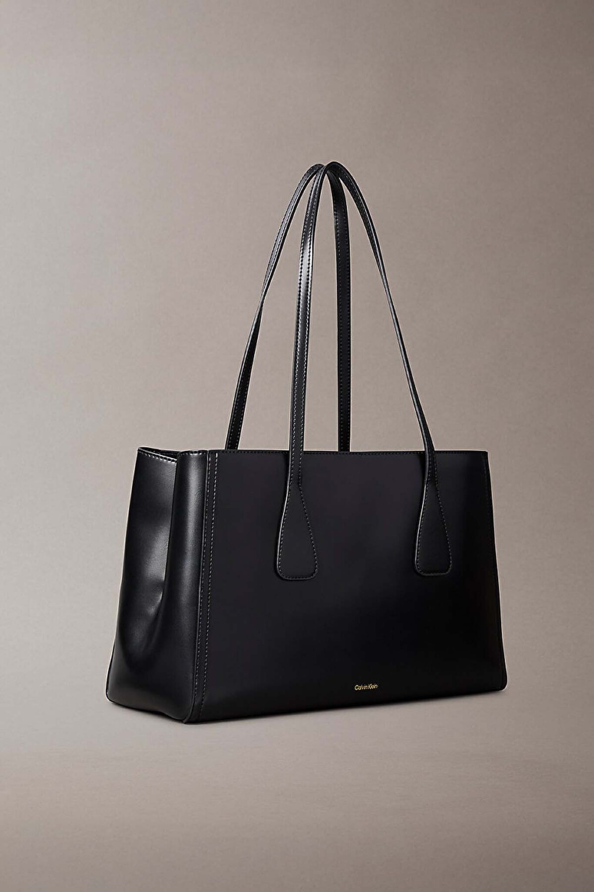 Modern yaşamın temposuna uyum sağlamak için tasarlanan bu tote çanta, yapılandırılmış formu ve fonksiyonel detaylarıyla stilinize profesyonel bir dokunuş katar. %51 polyester ve %49 poliüretan karışımından oluşan dayanıklı dış yüzeyi, pürüzsüz dokusuyla zarif bir görünüm sunar. Ön panelde yer alan dore renkli ikonik monogram logo plakası, siyah zemin üzerinde şık bir kontrast oluşturarak tasarıma lüks bir imza kazandırır. Çift saplı tasarımı ve 25 cm’lik sap yüksekliği ile hem elde hem de omuzda gün boyu konforlu bir taşıma deneyimi sağlar.