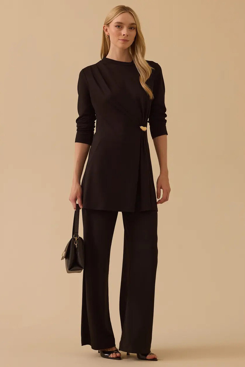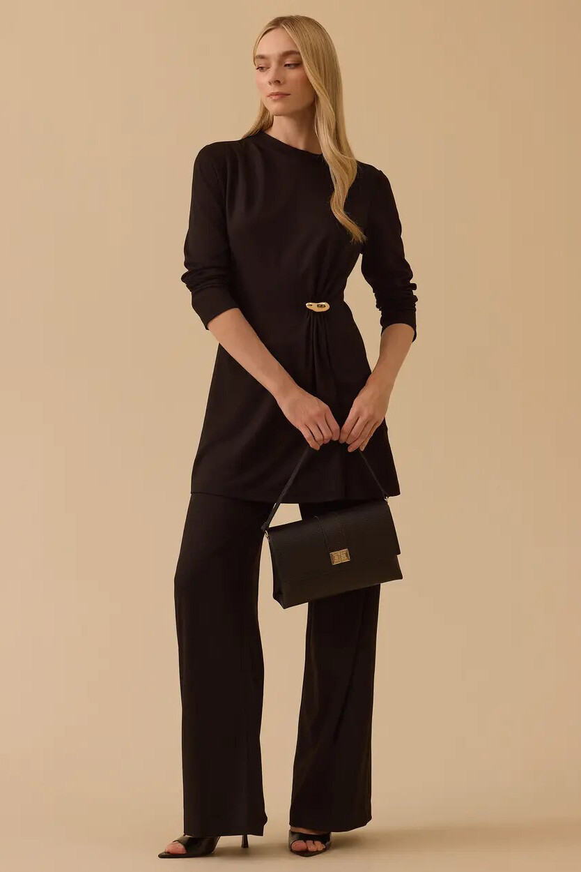 Tasarım: Yuvarlak yaka, metal aksesuar detaylı tunik ve normal bel pantolon