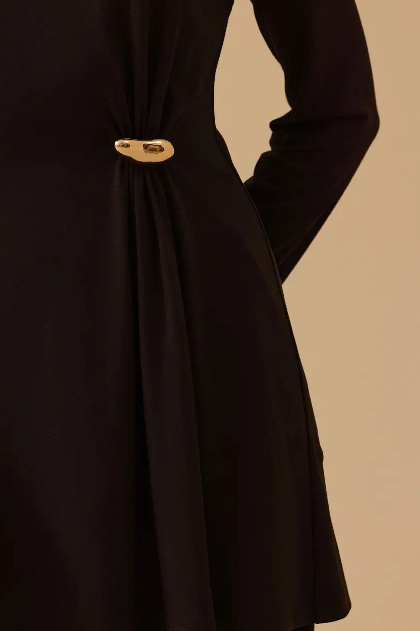 Zahmetsiz şıklığı modern detaylarla birleştiren bu takım, bel kısmındaki gold metal aksesuarı ve dökümlü duruşuyla sofistike bir stil sunar.