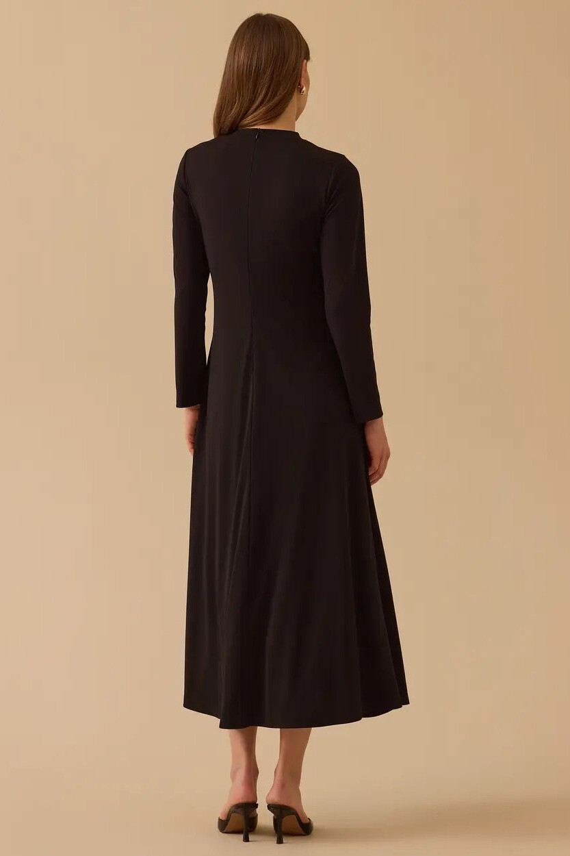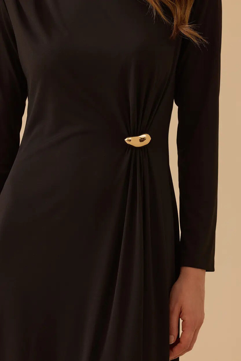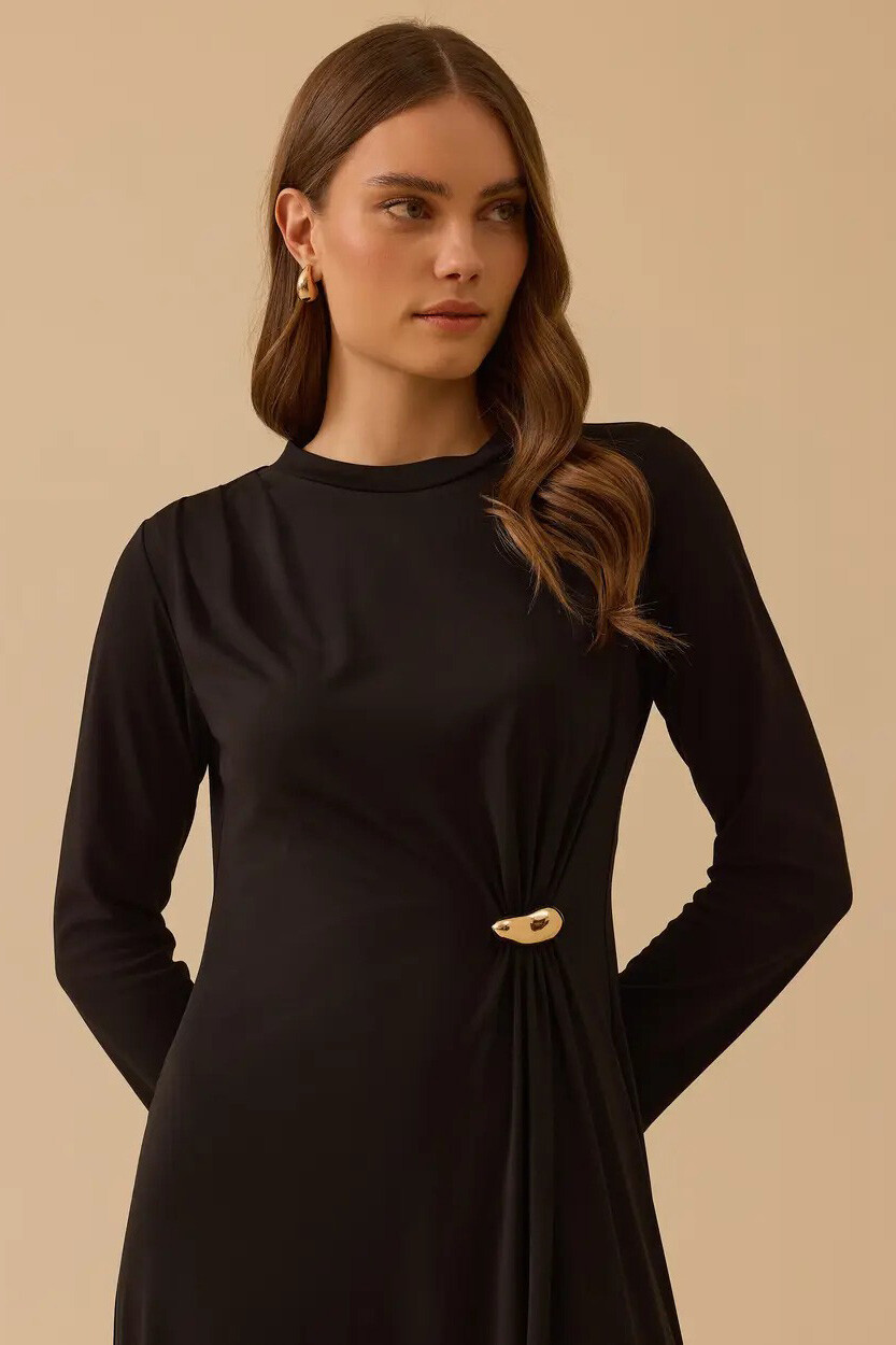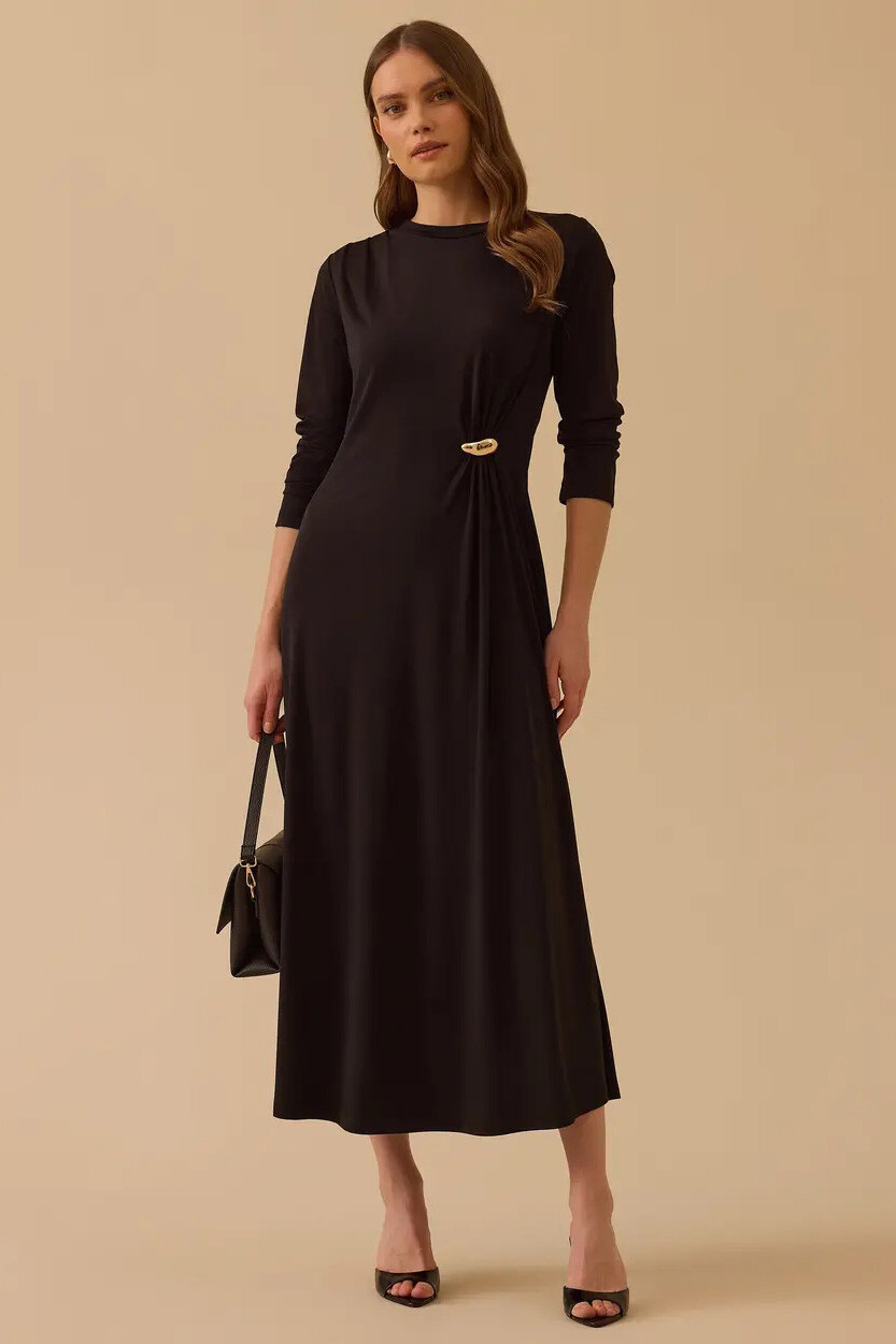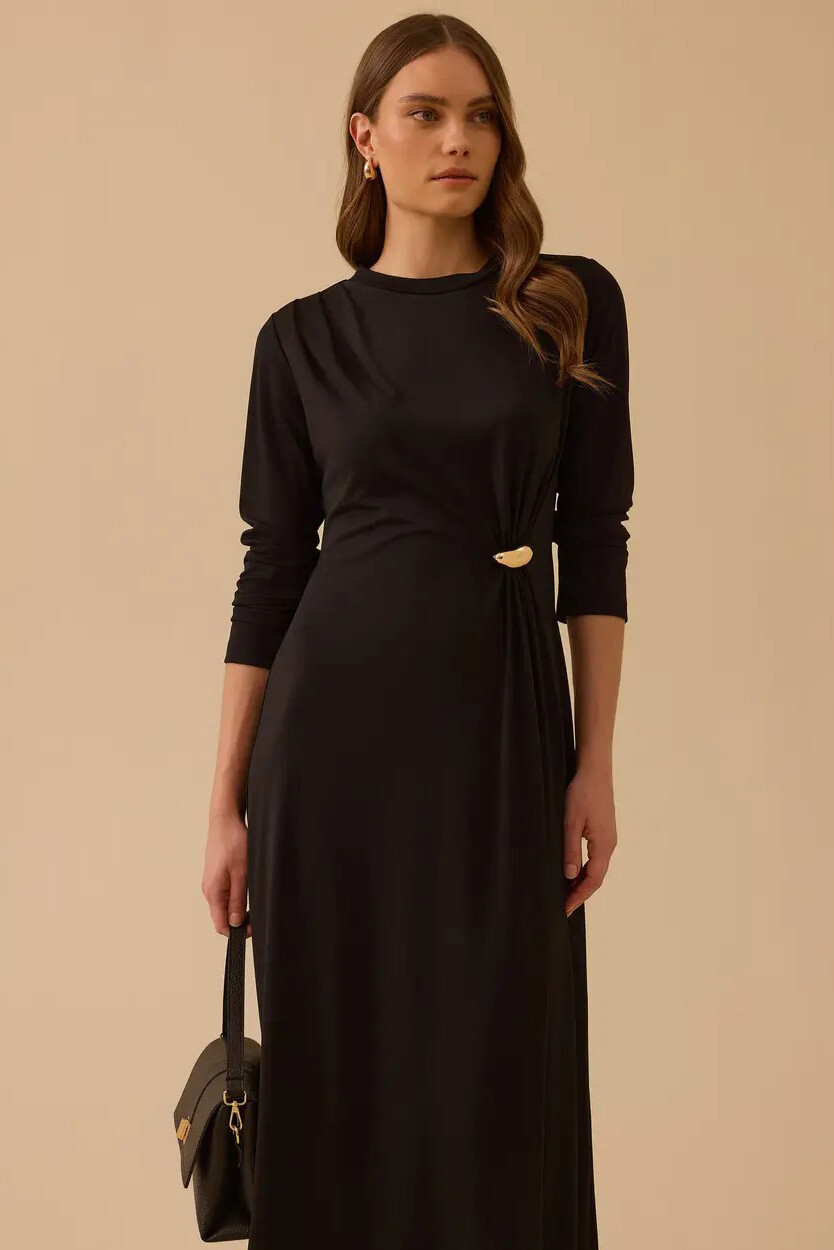 Sadelikten gelen gücü stilinize yansıtan bu siyah maksi elbise, yan bel kısmındaki altın tonlu metal aksesuarlı büzgü detayıyla modern ve heykelsi bir silüet yaratır. Zarif drapeleri ve bele oturan formu sayesinde hem günlük stilinize sofistike bir dokunuş katar hem de akşam davetlerinde çabasız bir şıklık sunar.