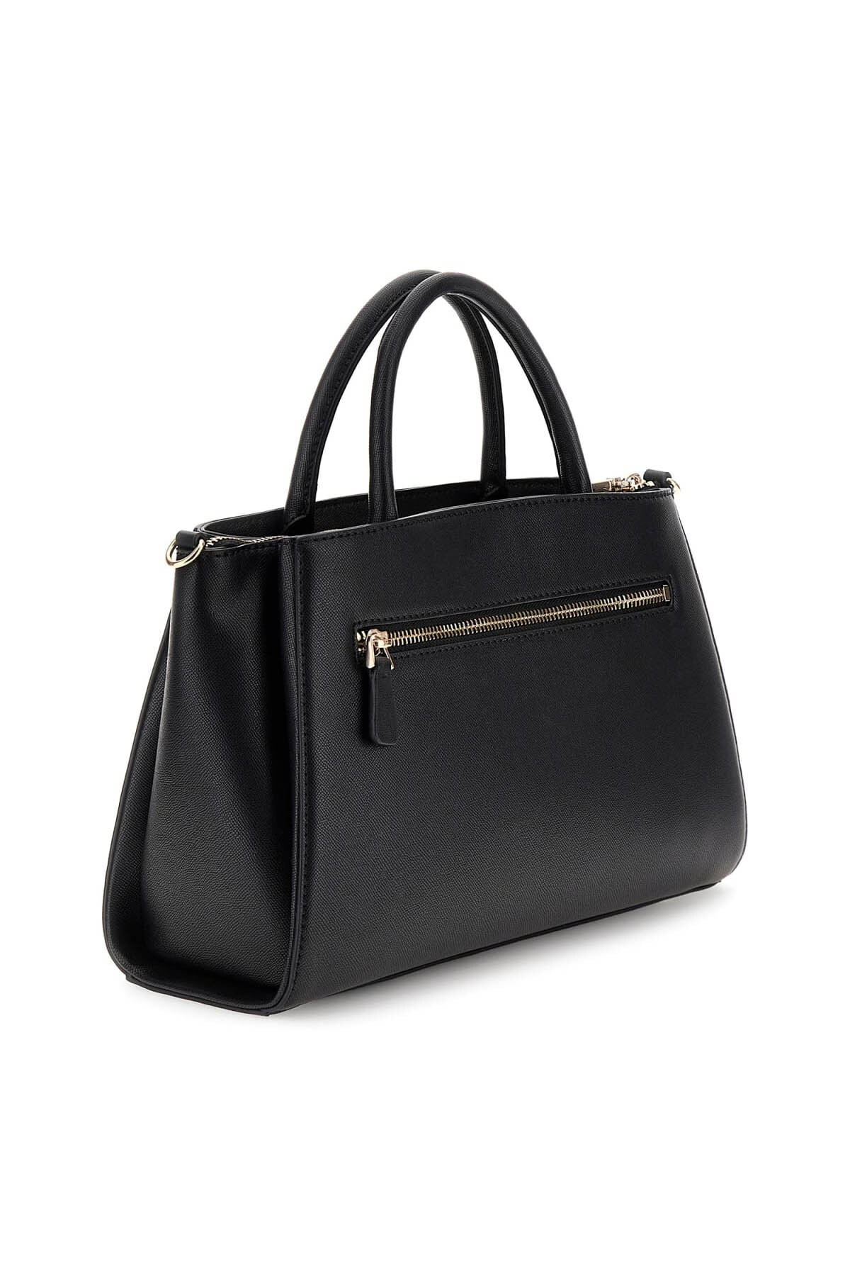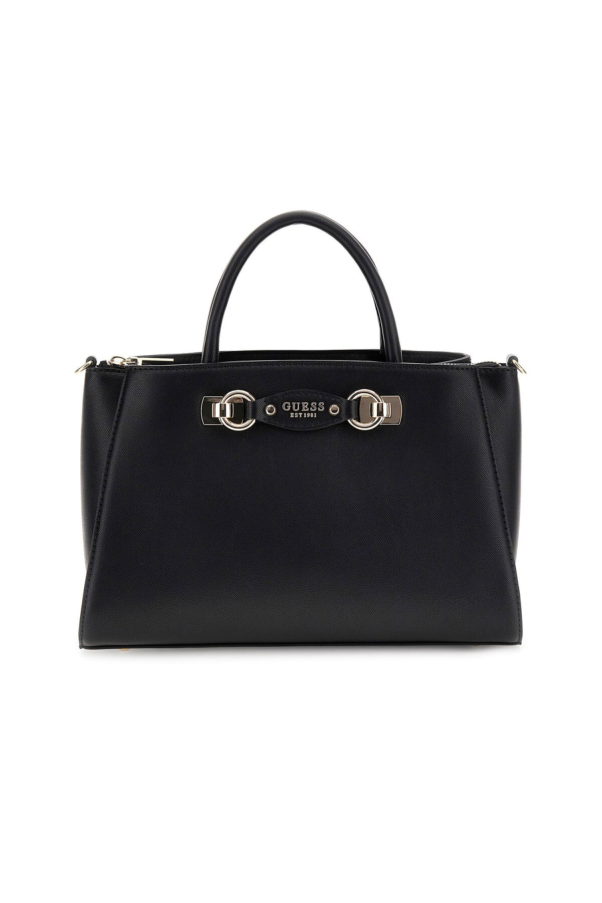 Klasik ve zarif bir tasarıma sahip bu yapılandırılmış el çantası, her türlü kombinle uyum sağlayan zamansız bir parçadır. Pürüzsüz siyah yüzeyi ve ön yüzdeki parlak metal halka detayları, sofistike bir bütünlük oluşturur. Çift taşıma sapı konforlu bir kullanım sunarken, arka kısmındaki fermuarlı cep, sık kullandığınız eşyalarınız için pratik bir erişim sağlar.
