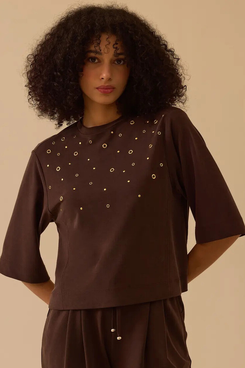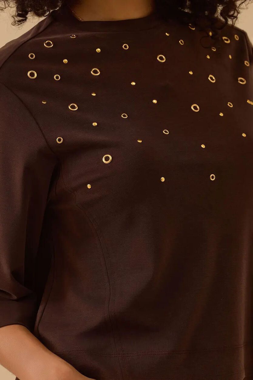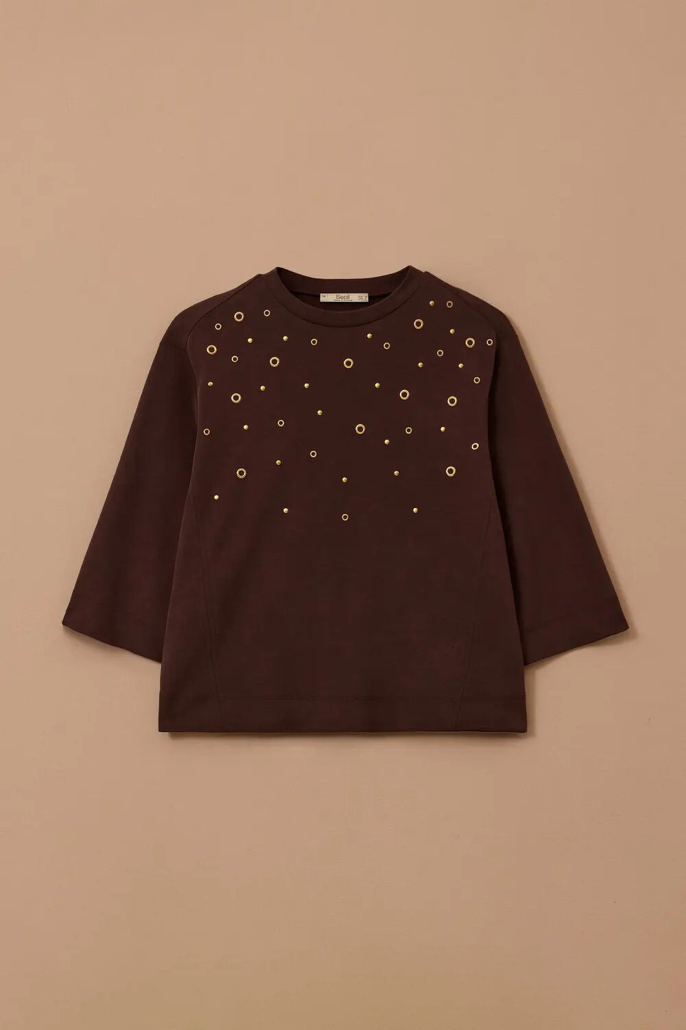 Modern halka aksesuarları ve dökümlü duruşuyla bu kahverengi sweatshirt, günlük stilinize hem dinamik hem de sofistike bir dokunuş katar. Üst göğüs ve omuz bölgesindeki metal detaylar, sade tasarımı bir adım öne çıkararak dikkat çekici ve güçlü bir görünüm elde etmenizi sağlar.