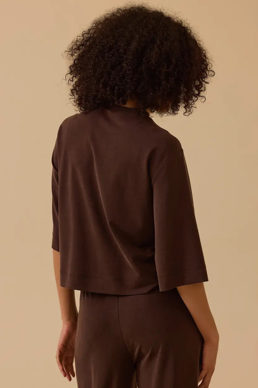 Yarım kol boyu ve düşük omuz kesimiyle mevsim geçişlerinde ideal bir konfor sunan bu parça, pamuk ve viskoz karışımlı dokusuyla cildinize nefes aldırır. Rahat (Relax Fit) kalıbı sayesinde gün boyu hareket özgürlüğü sunarken, modern silüetiyle çabasız bir şıklık yakalamanıza yardımcı olur.