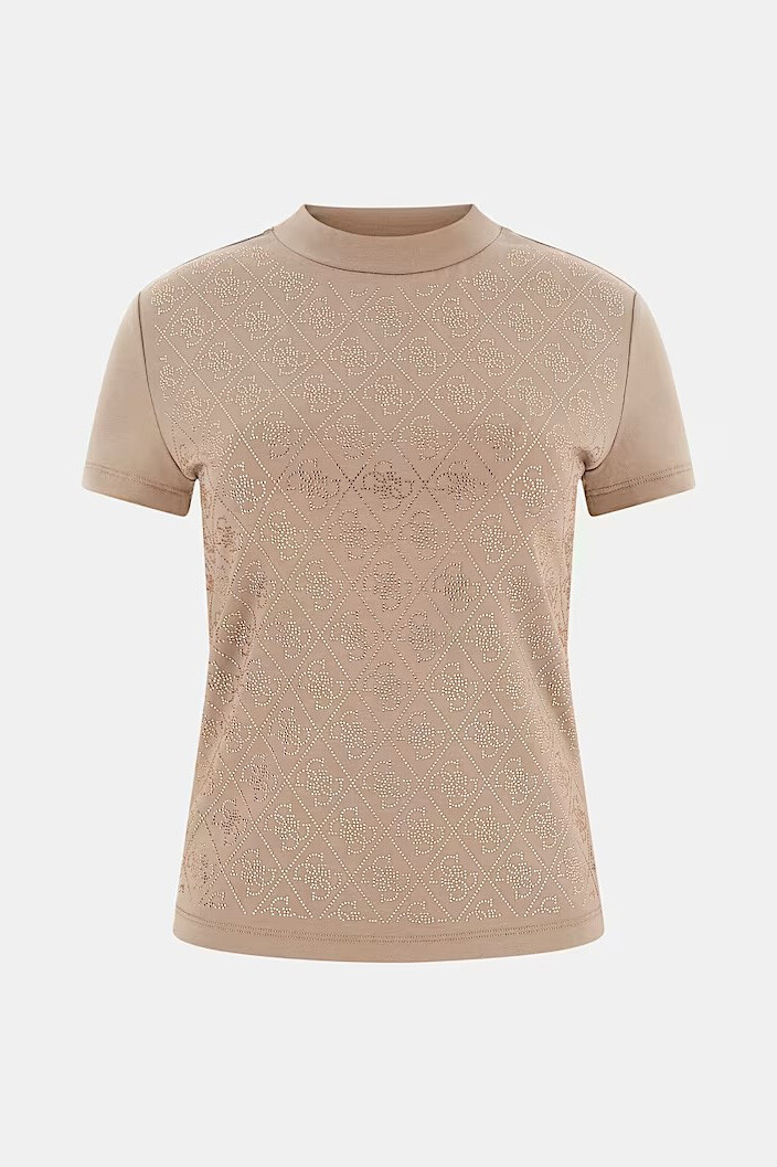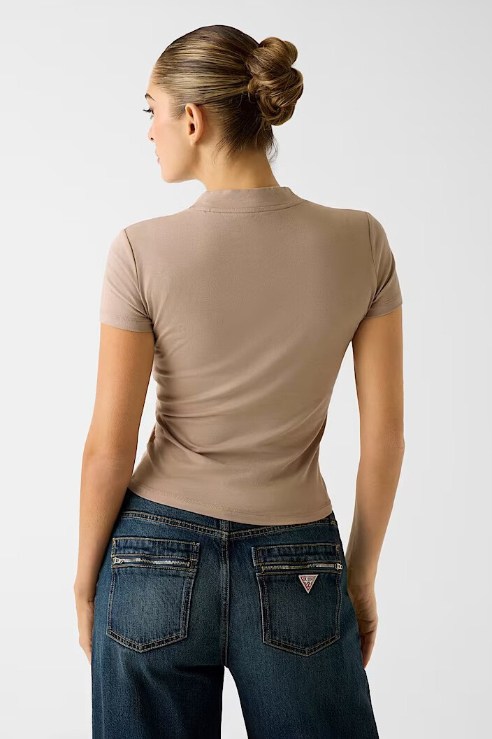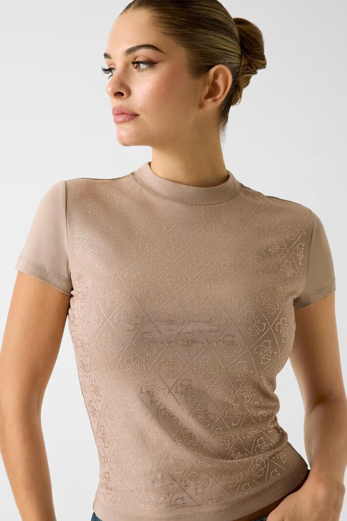 %95 pamuk ve %5 elastan karışımlı esnek dokunun sunduğu gün boyu konforu, zarif yarım balıkçı yaka tasarımıyla buluşturan bu tişört, stilinize ışıltılı ve sofistike bir dokunuş katar. Yumuşak bej rengin sakinliği, ön panelde yer alan ve geometrik bir desen oluşturan parlak taş işlemeleriyle zenginleştirilerek tasarıma lüks bir derinlik kazandırılmıştır. Vücudu nazikçe saran slim fit kesimi ve modern crop boyu, bel hattını vurgulayarak hem günlük hem de şık kombinlerde feminen bir silüet sunar.