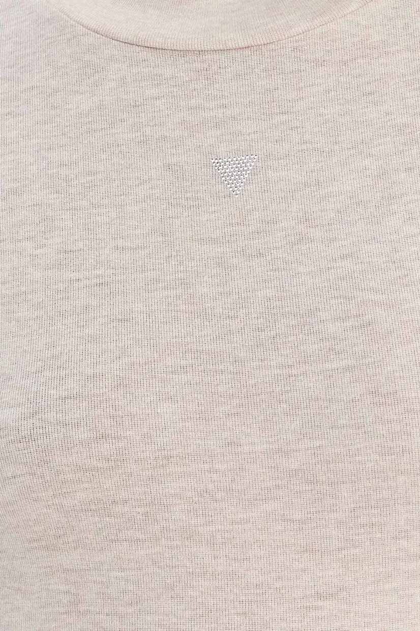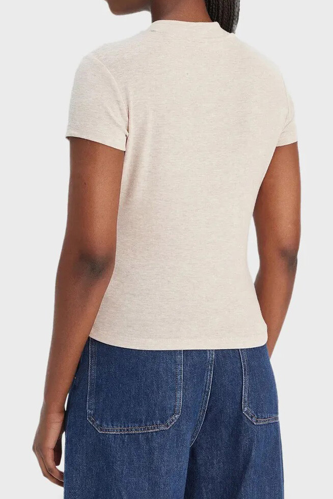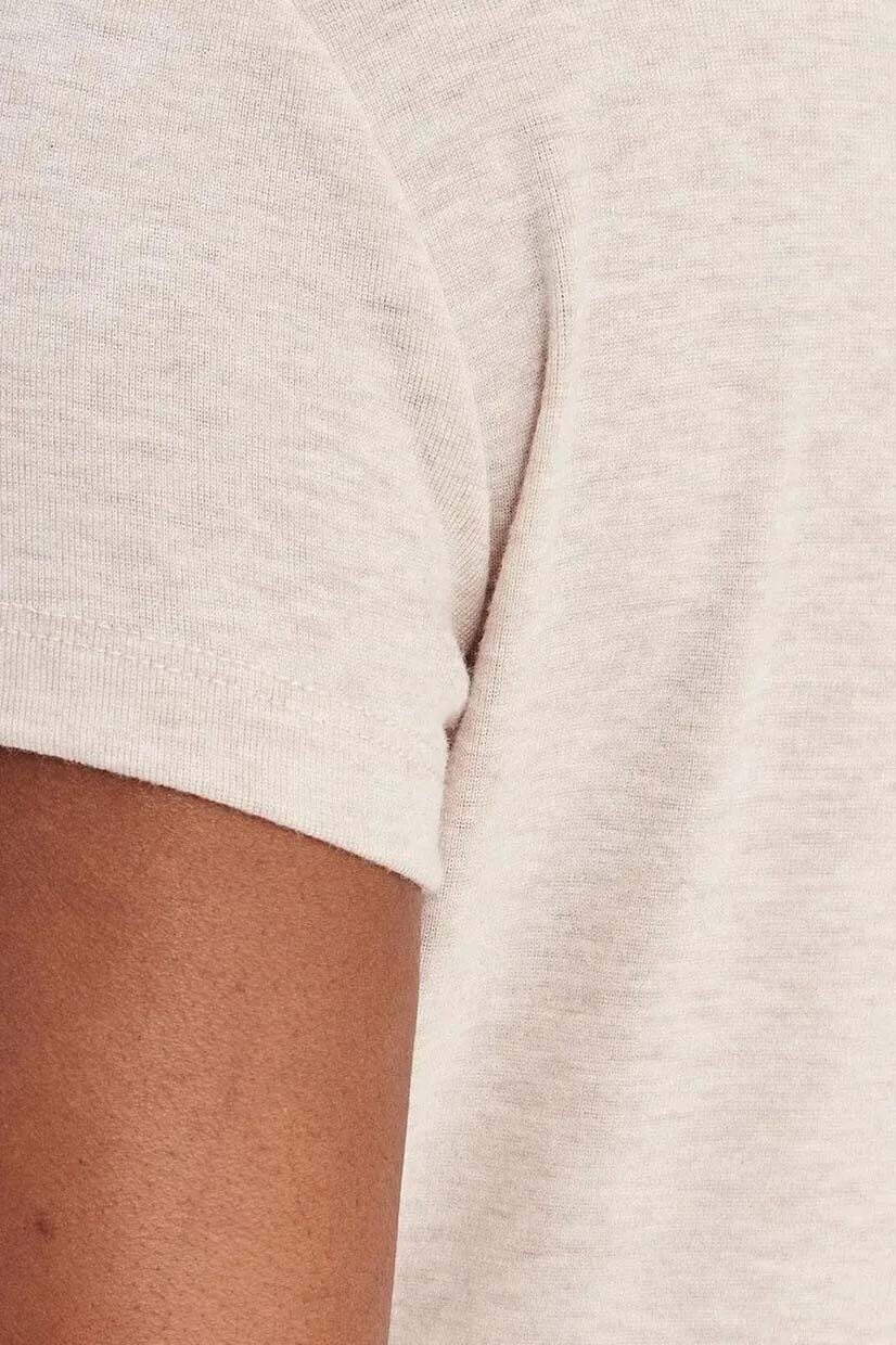 Açık bej tonunu, ipek ve yün karışımlı kumaşın sofistike dokusuyla buluşturan bu t-shirt, minimalist şıklığı lüks bir dokunuşla sunuyor. %4 ipek ve %3 yün içeren özel kumaş karışımı, cilde nefes aldıran yumuşak bir tuşe kazandırırken; viskoz ve polyester içeriği dayanıklılığı artırarak tok bir duruş sağlıyor. Yarım balıkçı yaka kesimi ve kısa kollu tasarımıyla modern bir silüet çizen model, esnek yapısı sayesinde vücudu nazikçe sararak feminen hatları vurguluyor. Göğüs kısmının tam ortasında yer alan minimal taşlı logo detayı, melanj görünümlü bej zemin üzerinde zarif bir ışıltı yaratıyor.