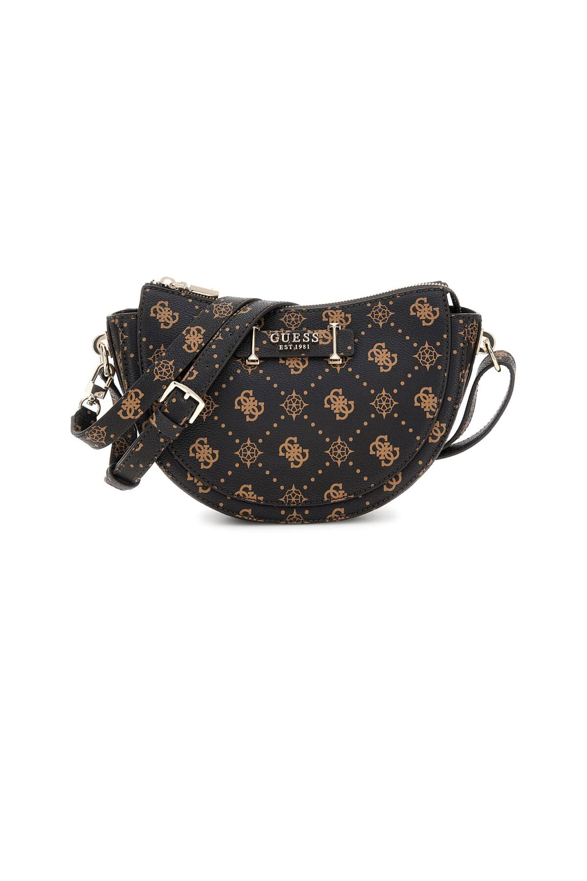 Dinamik ve modern bir tasarıma sahip bu omuz çantası, popüler yarım ay formuyla dikkat çeker. Tüm yüzeyini kaplayan monogram deseni, çantanın karakteristik stilini oluşturur. Çoklu fermuarlı bölmeleri sayesinde eşyalarınızı kolayca organize etme imkanı sunan model, fonksiyonelliği ön planda tutar. Çantanın ön yüzeyindeki zımba detaylı şerit ve ayarlanabilir omuz askısı, tasarıma özgün bir dokunuş katar.