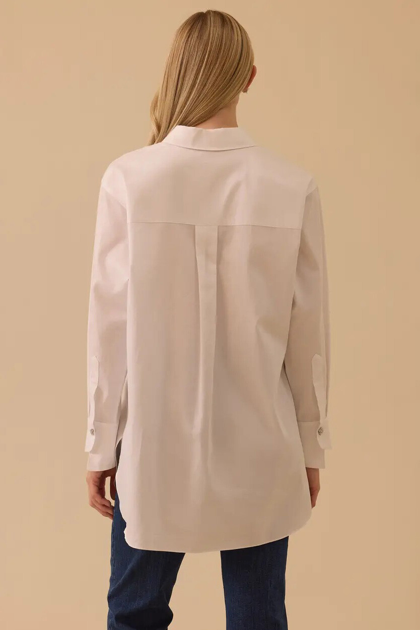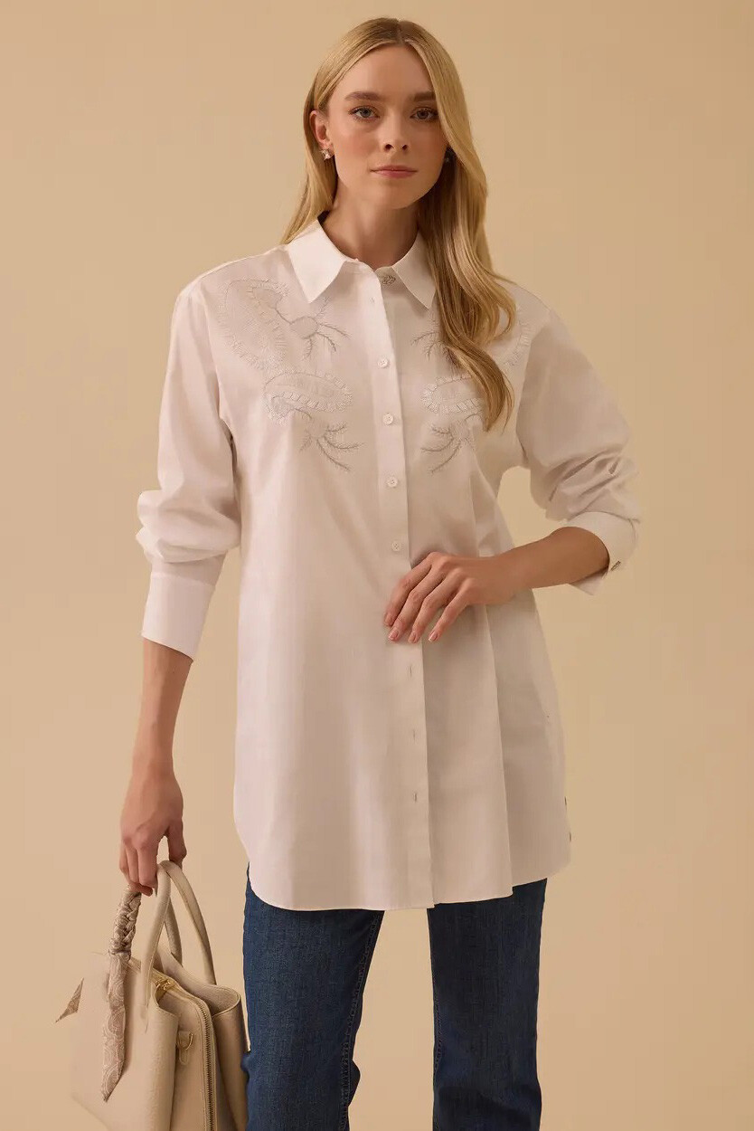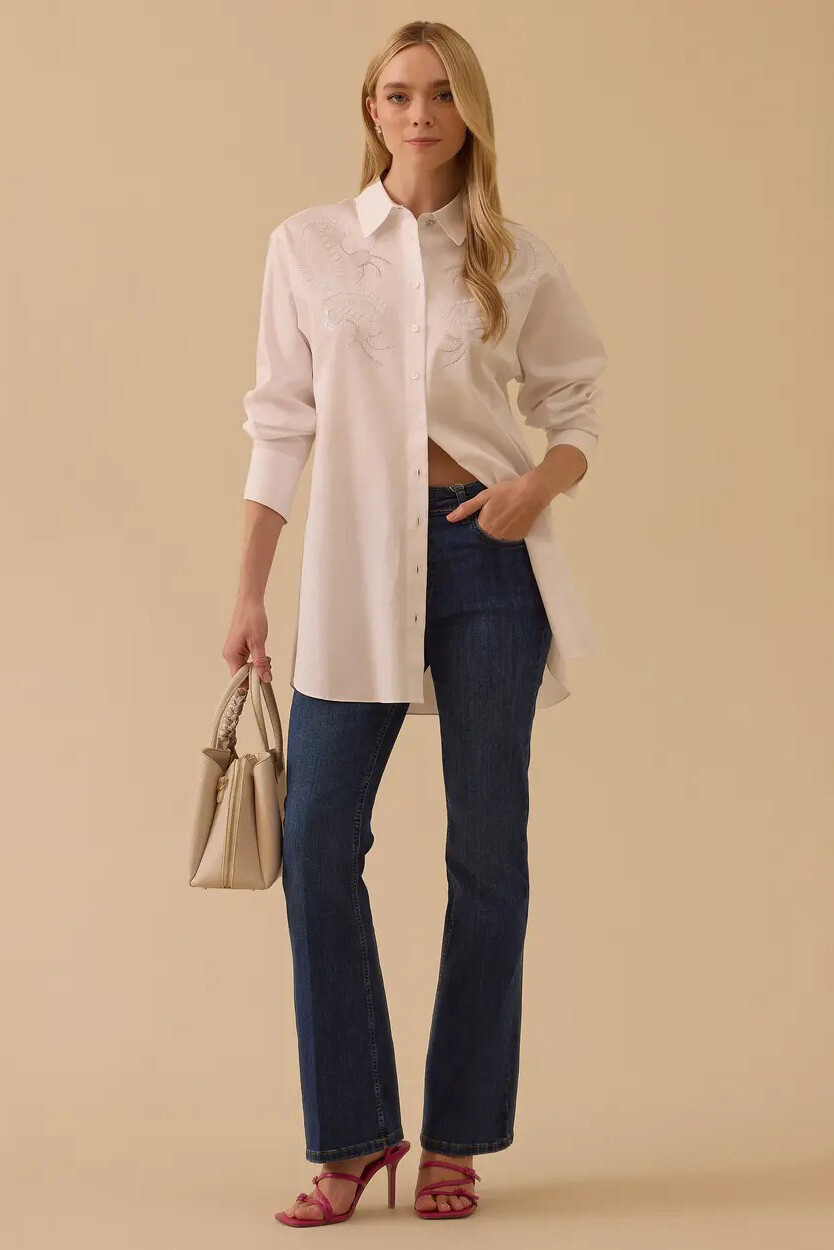 Beyazın ferahlatıcı ve taze ruhunu usta işi detaylarla buluşturan bu tasarım, gardırobunuza zarif bir hareket katmak için özenle hazırlandı. Göğüs hizasından omuzlara doğru süzülen ince işçilikli floral (çiçeksi) nakış detayları, klasik gömlek formuna sanatsal bir zenginlik kazandırır. Ön yüzeydeki gizli patlı düğme kapaması, tasarımın bütünlüğünü koruyarak minimal ve pürüzsüz bir görünüm sunarken; sırtta yer alan usta işi roba ve pile detayı kalıbı rahatlatarak gün boyu ekstra hareket özgürlüğü sağlar. %100 pamuklu nefes alabilen dokusu ve basen altına inen dökümlü boyuyla, hem jean pantolonlarla günlük stilinizde hem de kumaş pantolonlarla ofis zarafetinizde başrolü üstlenecek kurtarıcı bir parçadır.