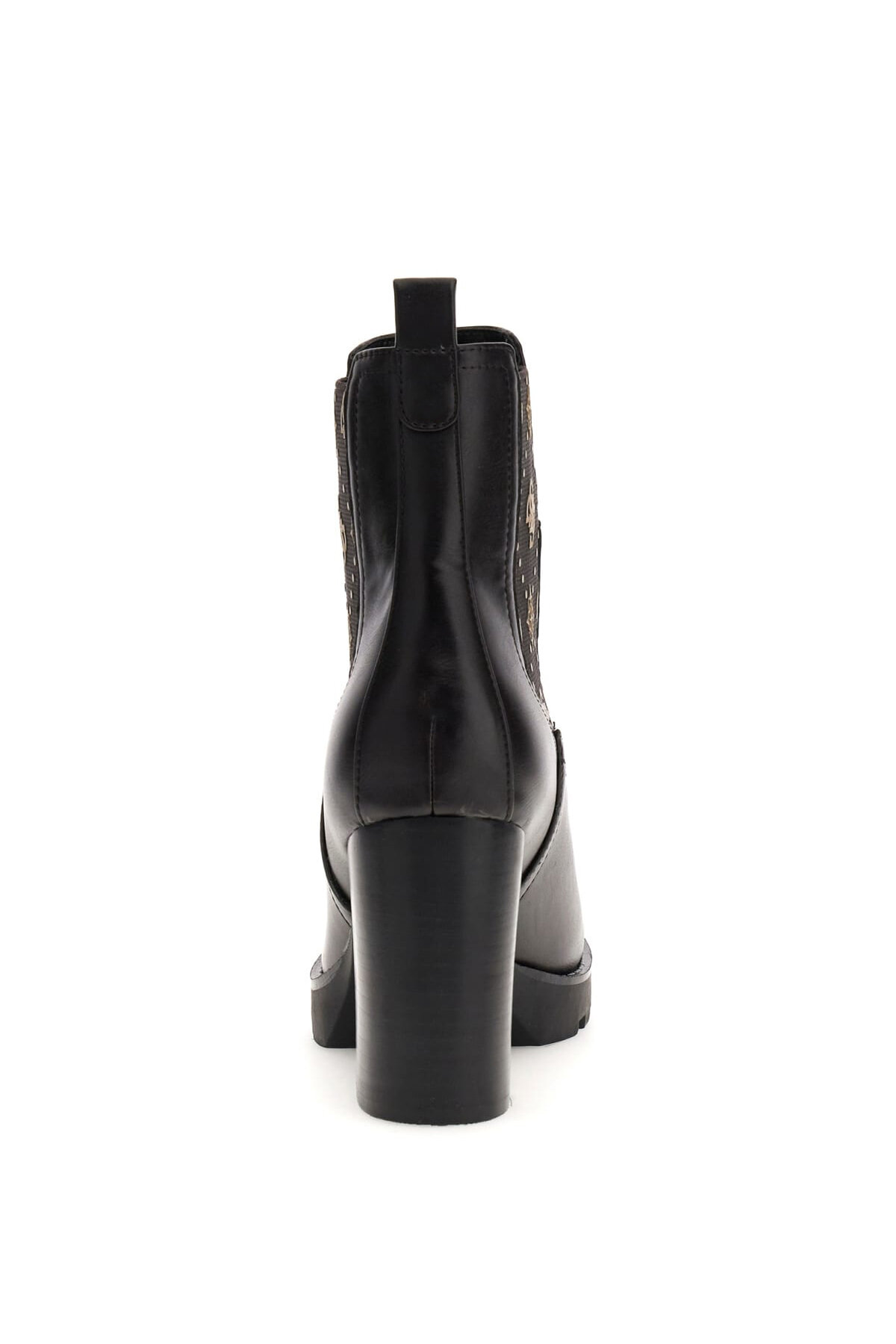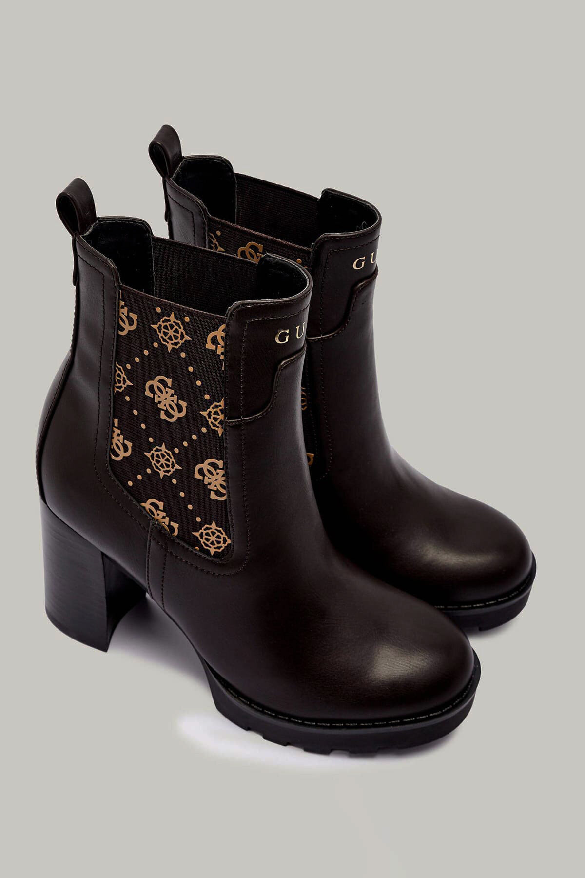 Klasik Chelsea bot stiline modern ve güçlü bir yorum getiren bu model, iddialı silüetiyle öne çıkar. Pürüzsüz kahverengi suni deri gövde, yanlarda yer alan monogram desenli elastik panellerle birleşerek hem şık bir görünüm hem de giyim kolaylığı sunar. Yüksek blok topuğu ve platform tabanı, boyu zarifçe yükseltirken dengeli bir yürüyüş sağlar. Arkasındaki çekme halkası ve küçük metal logo gibi incelikli detaylar, botun sofistike estetiğini tamamlar.