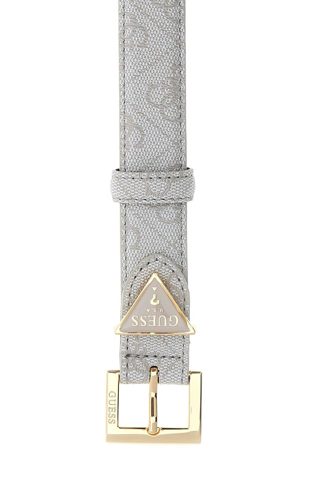 Tasarımın en dikkat çekici detayı olan altın rengi metalik toka, üzerinde yer alan Guess yazısıyla prestijli bir imza niteliğindedir. Tokanın hemen yanında konumlandırılan ikonik üçgen logo ucu, kemerin rafine tasarımını tamamlayarak her detayda kaliteyi ön plana çıkarır. Ayarlanabilir delikli yapısı sayesinde vücudunuza göre tam uyum sağlayan bu aksesuar, gardırobunuzun en işlevsel ve stil sahibi parçalarından biri olacak.
