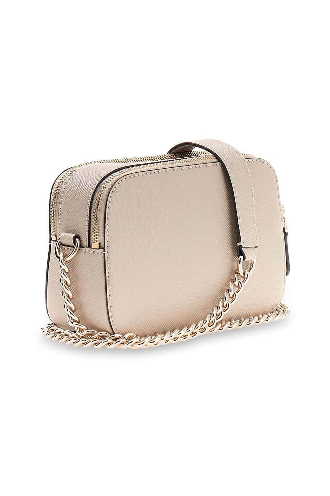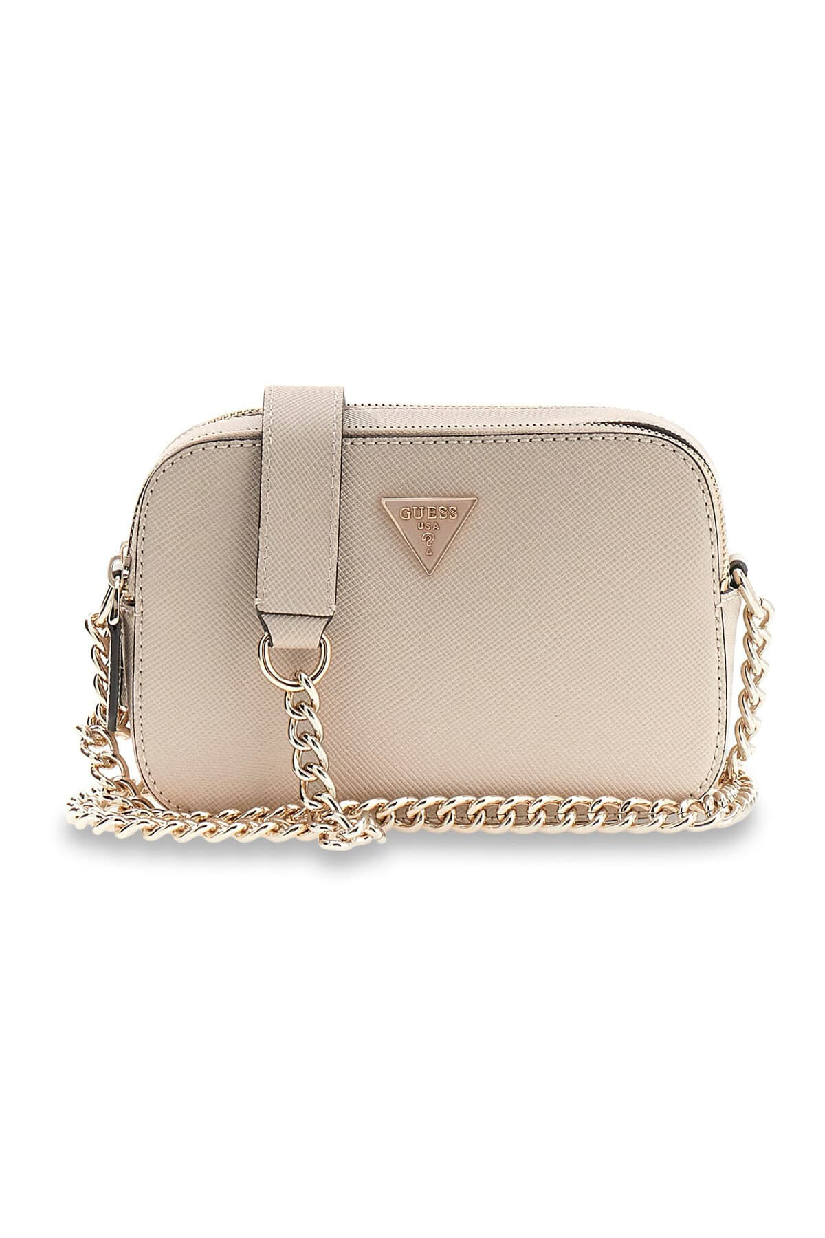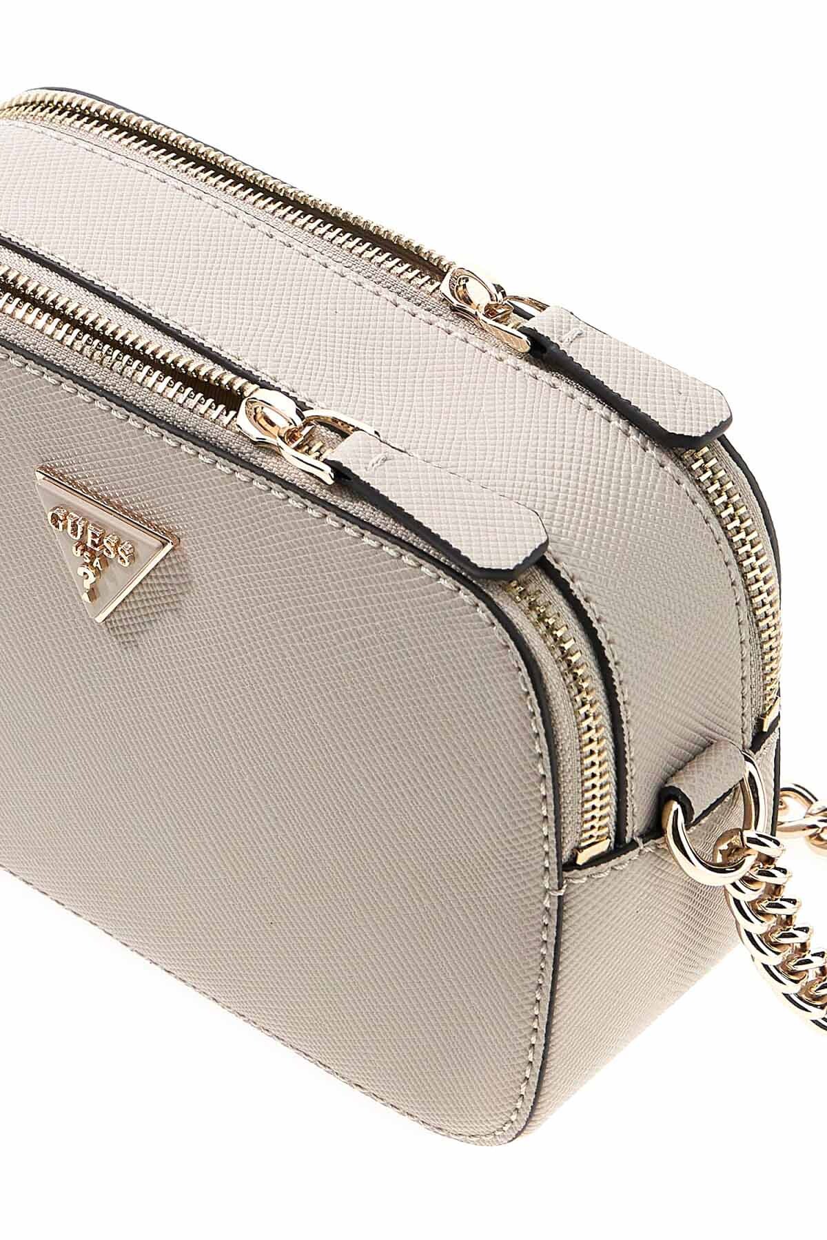 Tasarım & Ekstra Detay: Eşyalarınızı dış etkenlere karşı tam koruyan çift metal fermuarlı bağımsız ana bölmeler, ön merkezde üçgen formlu metal donanım detayı, altın renkli zincir eklentili sabit çapraz taşıma askısı, yüzeye ekstra dayanıklılık katan çapraz (Saffiano) doku
