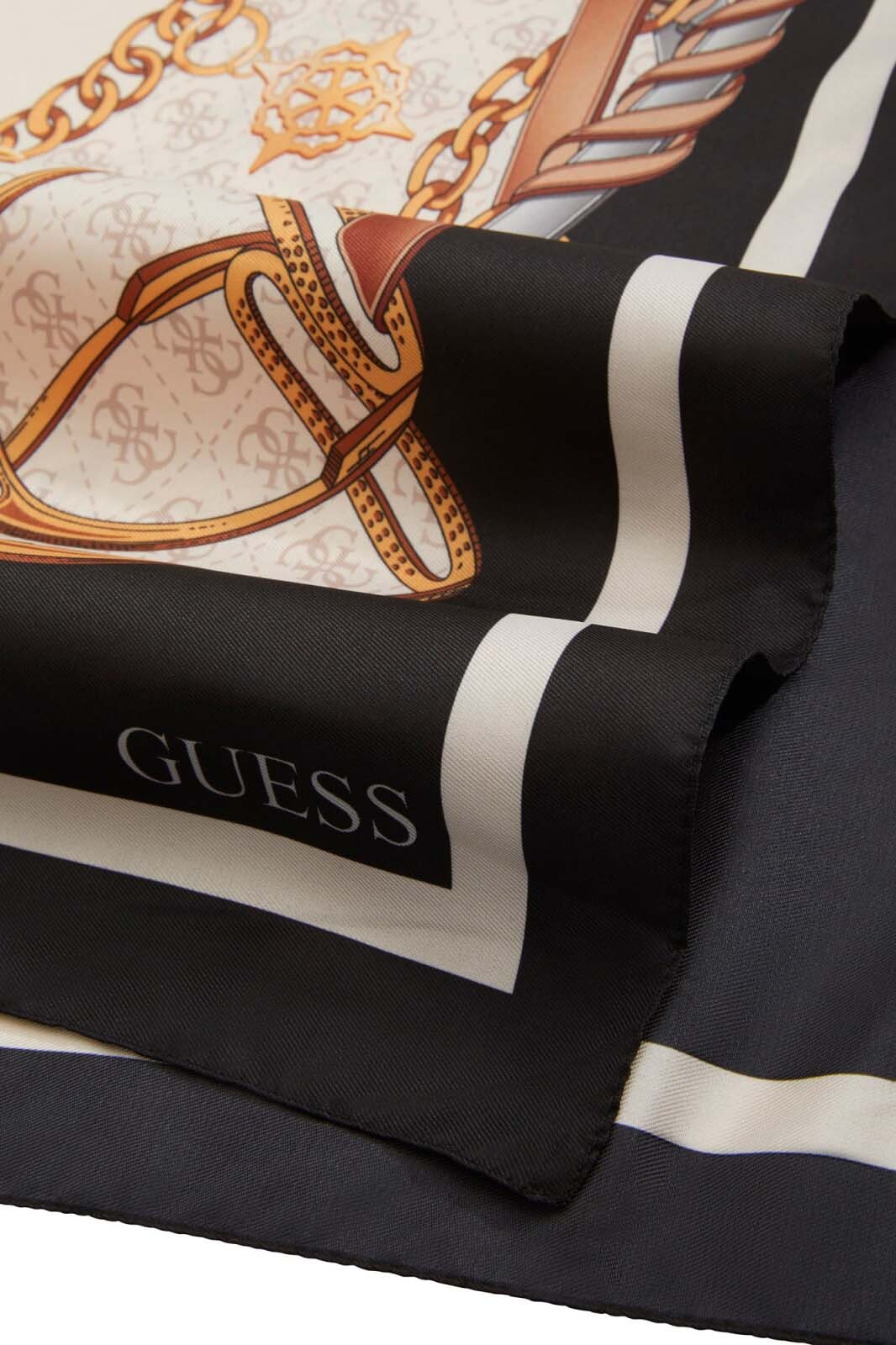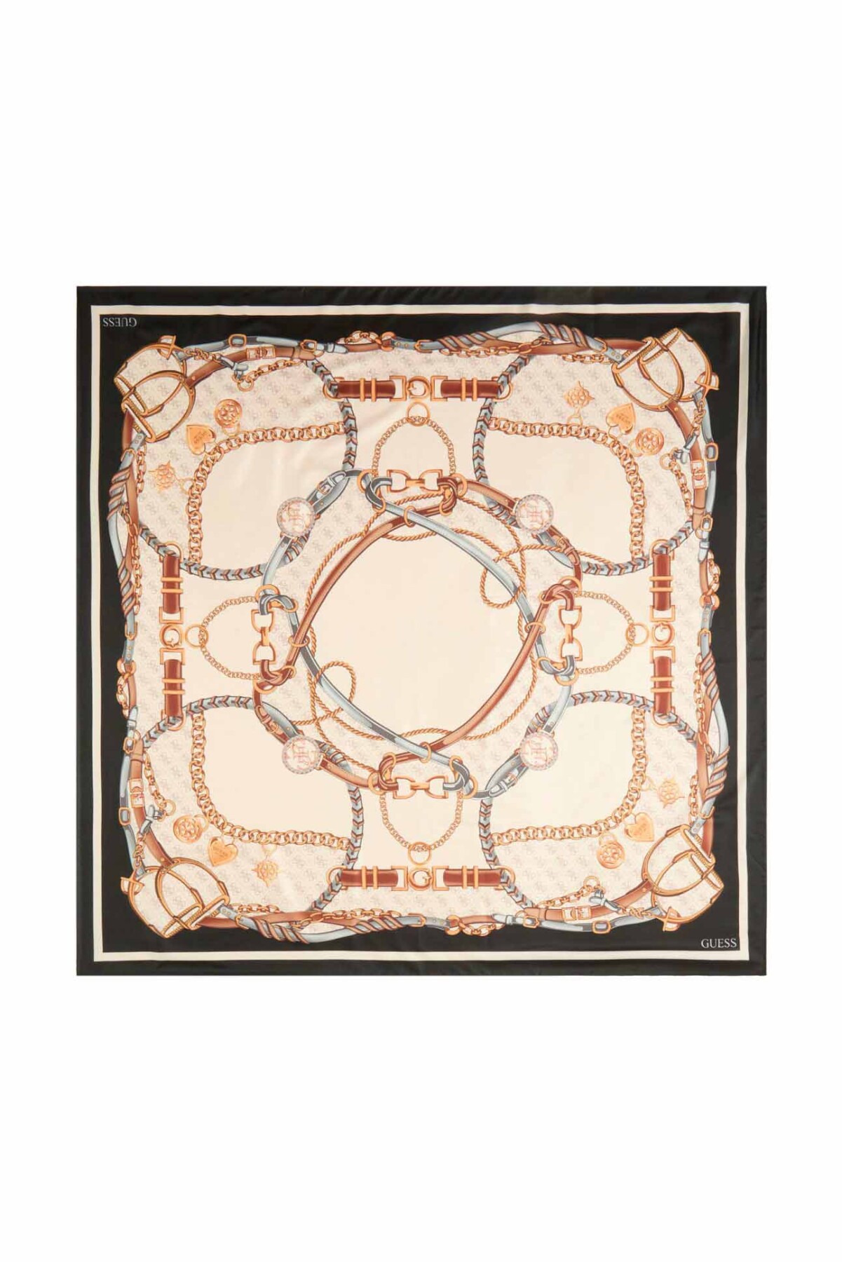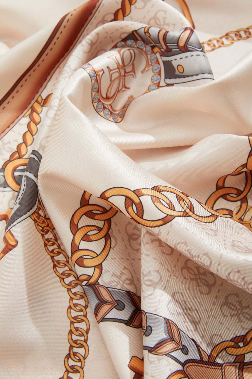 Zengin desenleri ve kontrast renk paletiyle öne çıkan bu eşarp, stilinize klasik ve sofistike bir dokunuş katıyor. %100 polyester kumaş yapısı sayesinde hafif bir dokuya ve ipeksi bir parlaklığa sahip olan model, uzun ömürlü ve pratik bir kullanım sunuyor. Siyah, bej ve altın tonlarının hakim olduğu tasarım; dore zincirler, kemer motifleri ve merkezdeki dairesel logo figürüyle zenginleştirilmiş karakteristik bir estetik sergiliyor. Kenarlarındaki siyah kalın çerçeve detayı, modelin görsel bütünlüğünü tamamlarken her türlü günlük ve şık kombin için ideal bir aksesuar seçeneği oluşturuyor.