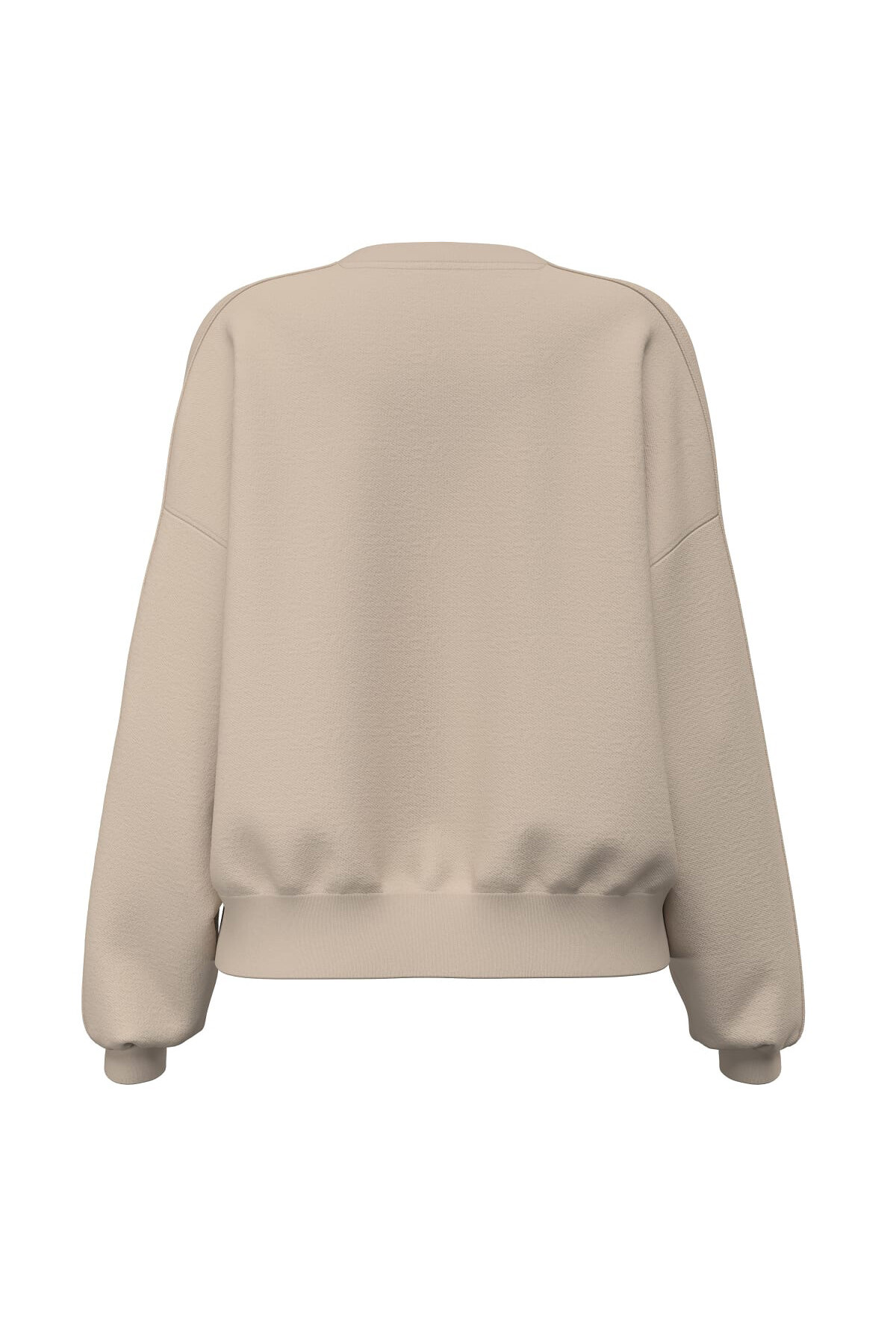 Modern ve minimal bir estetiği konforla birleştiren bu sweatshirt, bej tonunun yarattığı doğal ve soft görünümle günlük stilinize sofistike bir dokunuş katıyor. Polyester, viskoz ve elastan karışımlı özel kumaş yapısı, teninizde yumuşak bir his bırakırken esnek dokusuyla gün boyu özgürce hareket etmenizi sağlıyor. Düşük omuz dikişleri ve dökümlü kesimiyle çağdaş bir silüet çizen model, göğüs kısmında yer alan zarif taşlı marka logosuyla şıklığını tamamlıyor. Bisiklet yaka tasarımı, esnek manşetleri ve bel kısmındaki ribana detaylarıyla hem aktif spor kombinlerinde hem de şehir hayatının temposunda size eşlik edecek işlevsel bir parça olarak öne çıkıyor.