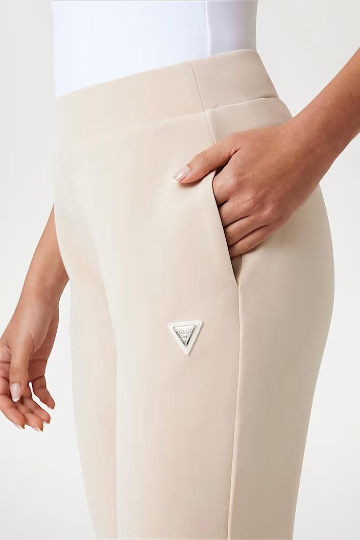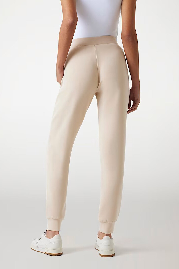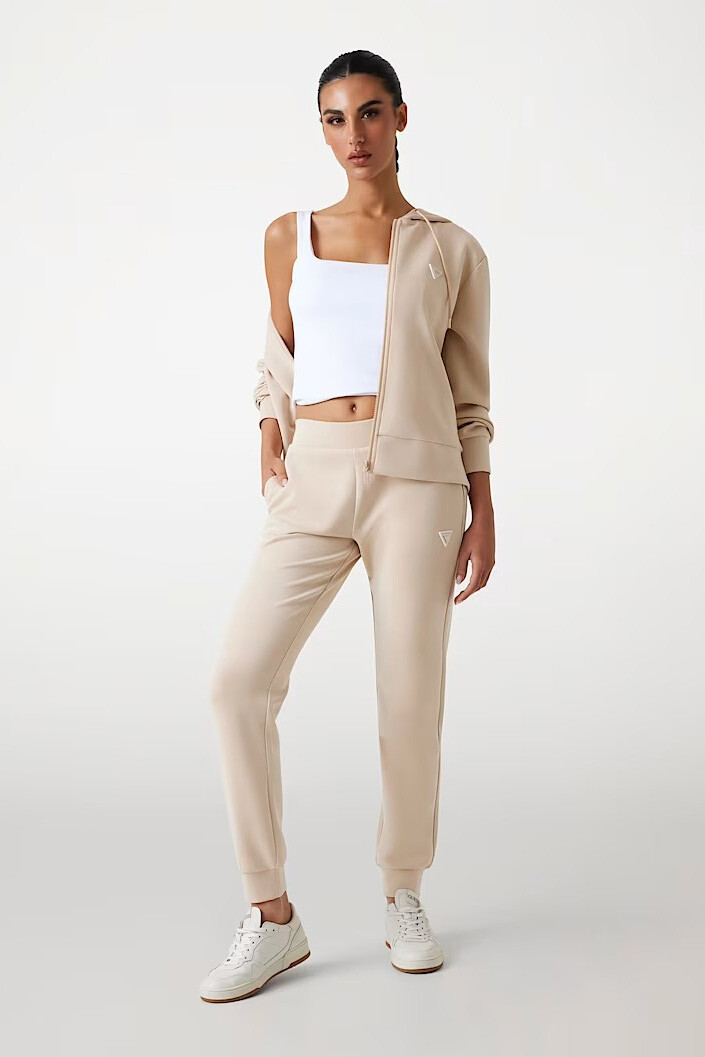 Scuba kumaşın pürüzsüz ve tok duruşuyla buluşturan Olympe pantolon, ev giyiminin rahatlığını sokak şıklığına taşıyor. %47 polyester, %42 modal ve %11 elastan karışımından oluşan zengin içeriği; modal liflerinin ipeksi yumuşaklığını teknik kumaşın esnekliğiyle birleştirerek gün boyu süren bir konfor sunuyor. Ürün teknik olarak tayt kategorisinde yer alsa da; yan cepleri, hafif dökümlü kesimi ve paça kısmındaki geniş manşet detaylarıyla modern bir jogger silüeti sergiliyor. Sol bacakta yer alan minimalist üçgen logo detayı, tasarıma zarif bir marka imzası katıyor.
