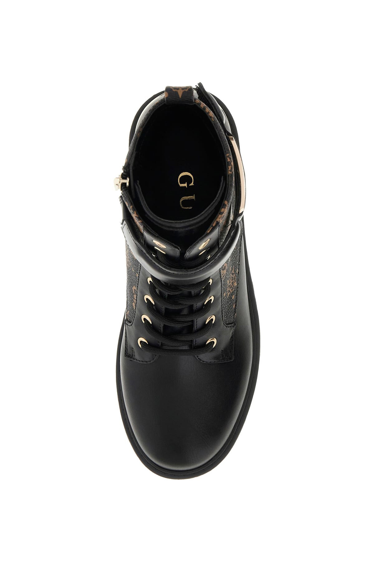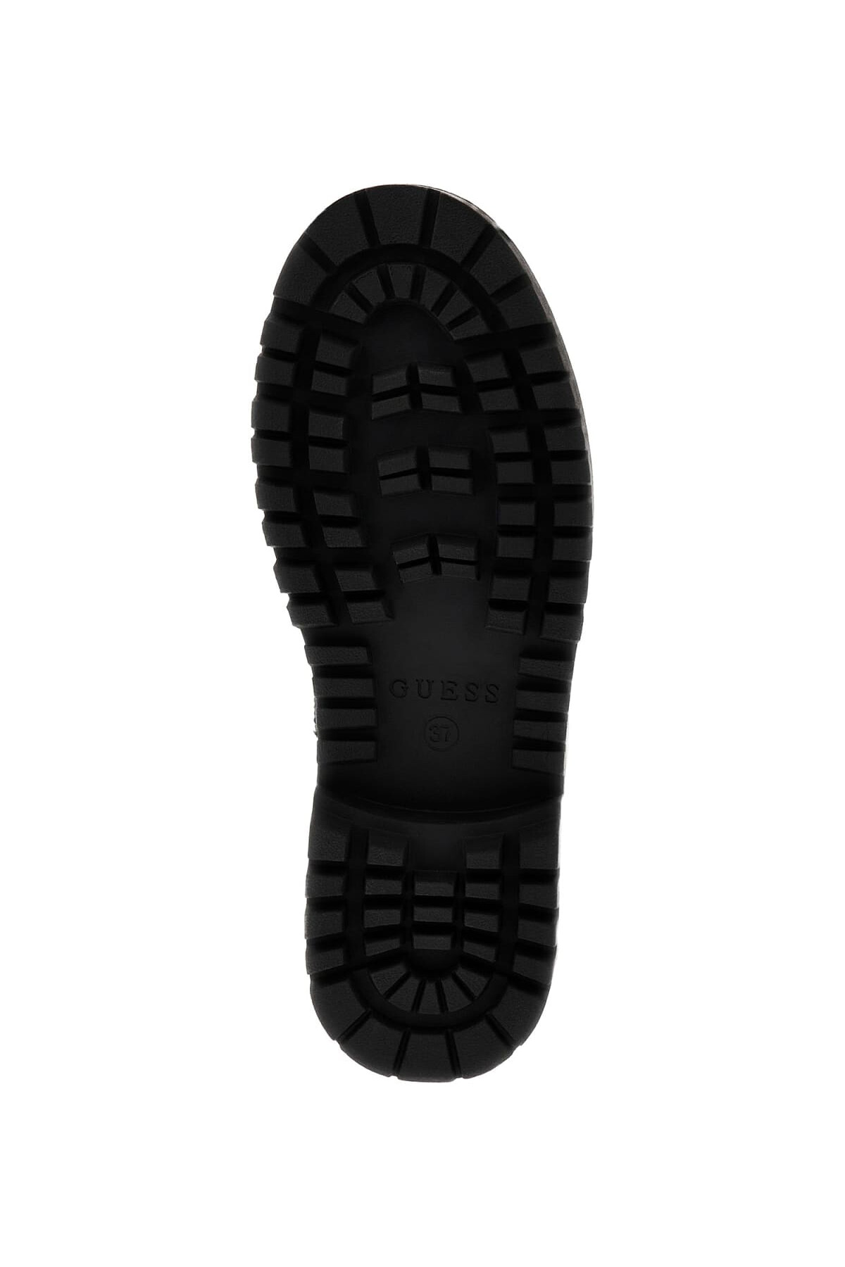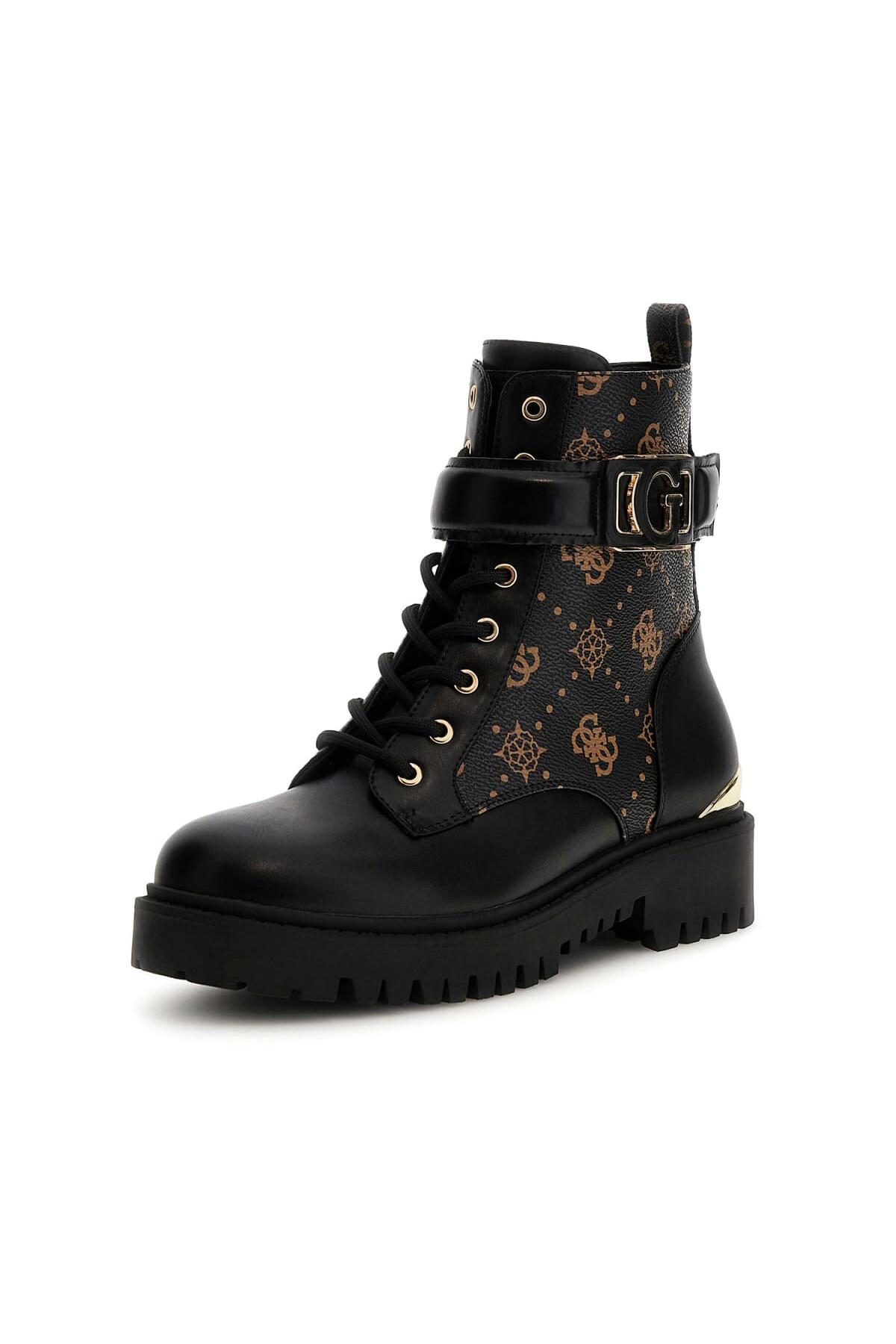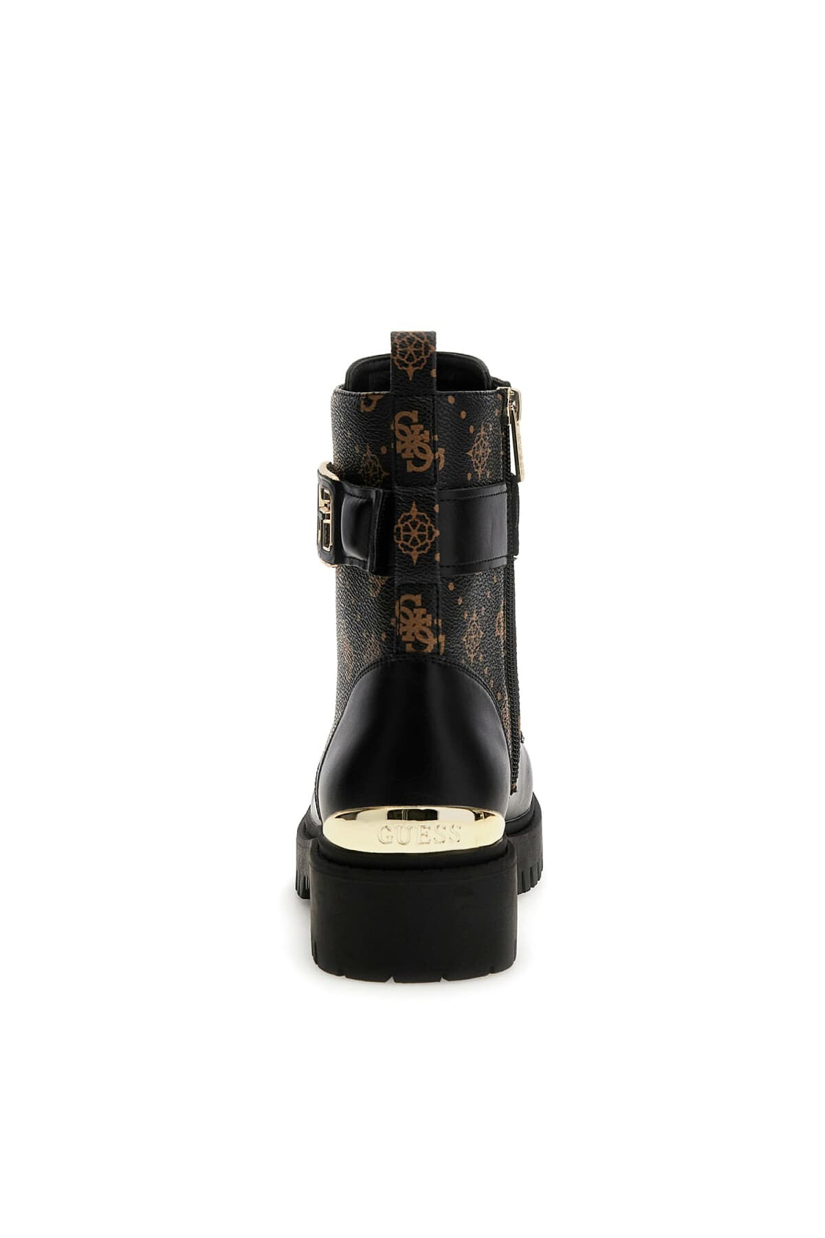 Klasik postal silüetini lüks ve modern detaylarla birleştiren bu bot, stil sahibi bir duruş sergiler. Siyah suni deri gövde, yanlardaki monogram desenli panellerle hareket kazanır. Bileği saran ve büyük bir metal harf aksesuarına sahip olan toka detaylı bant, modelin en dikkat çekici unsurudur. Topuktaki altın rengi metal plaka lüks bir vurgu yaparken, kalın traktör tabanı tasarıma güçlü bir karakter katar. İç kısmındaki fermuar ise pratik bir kullanım sunar.