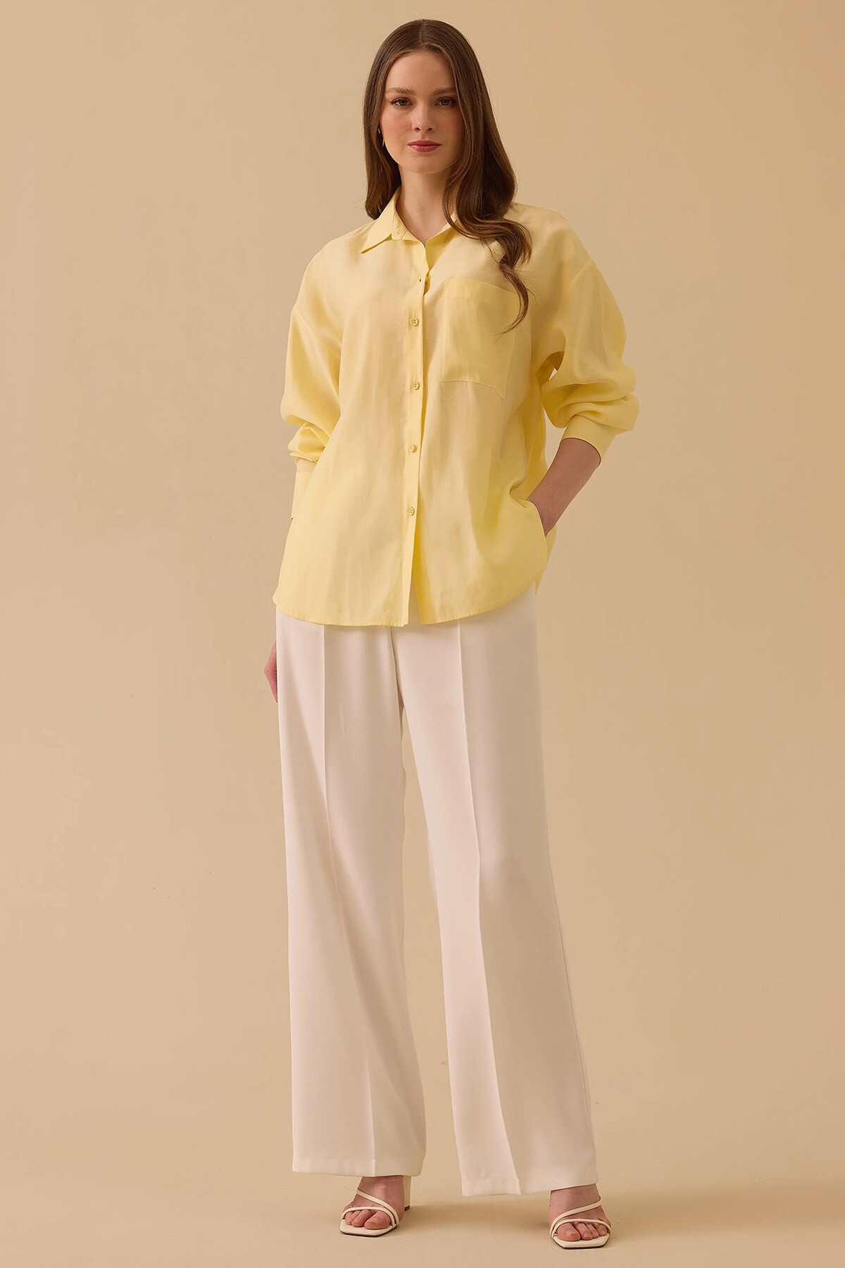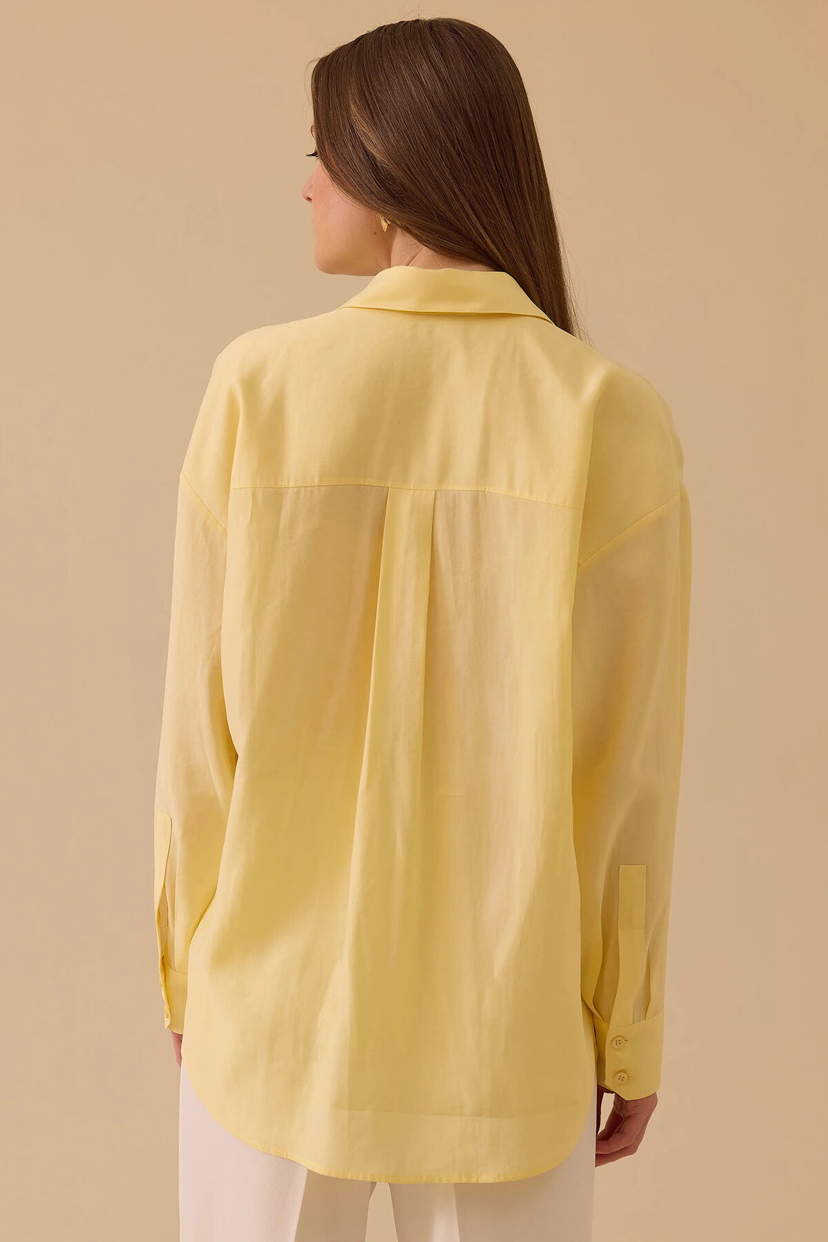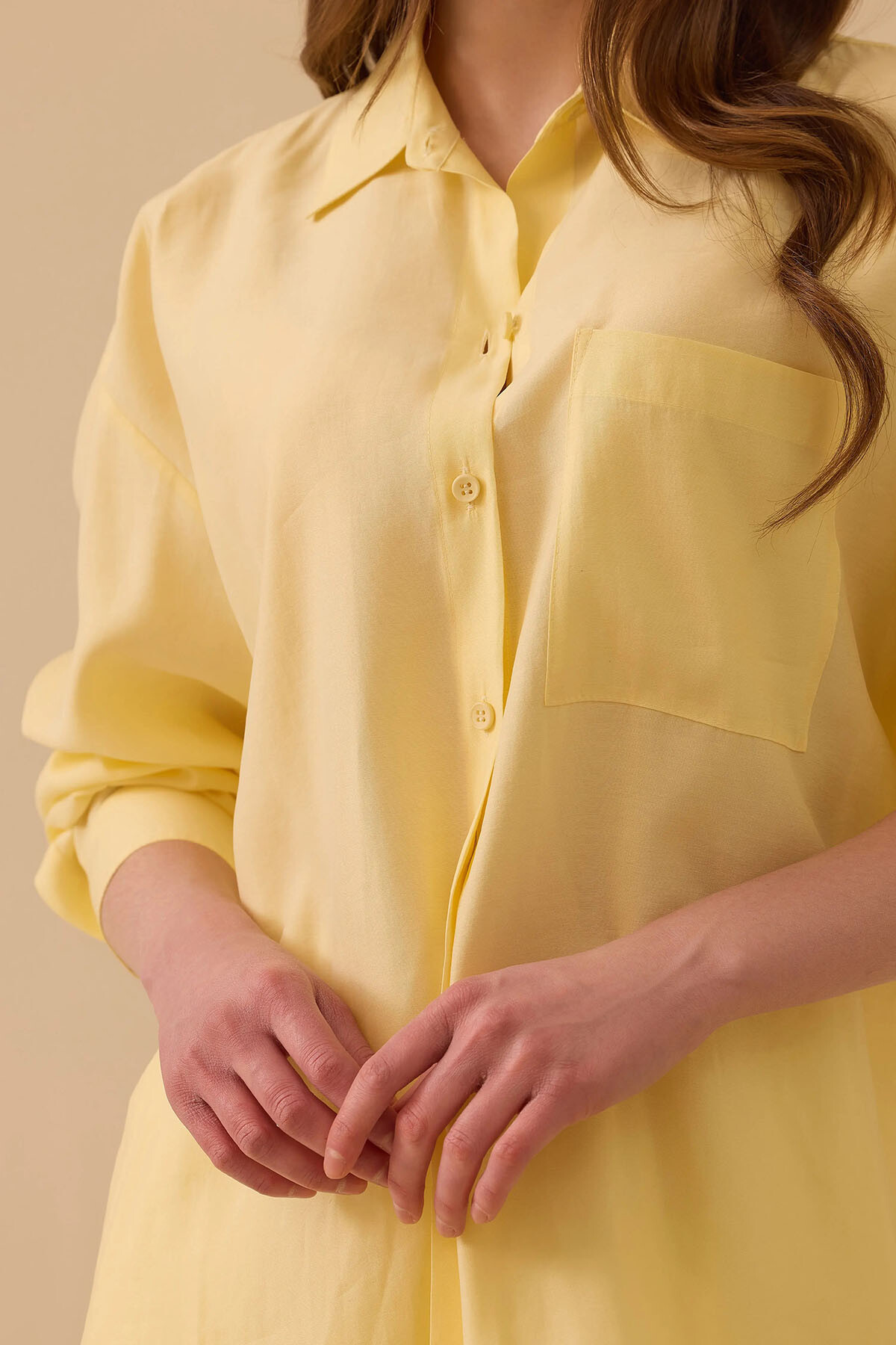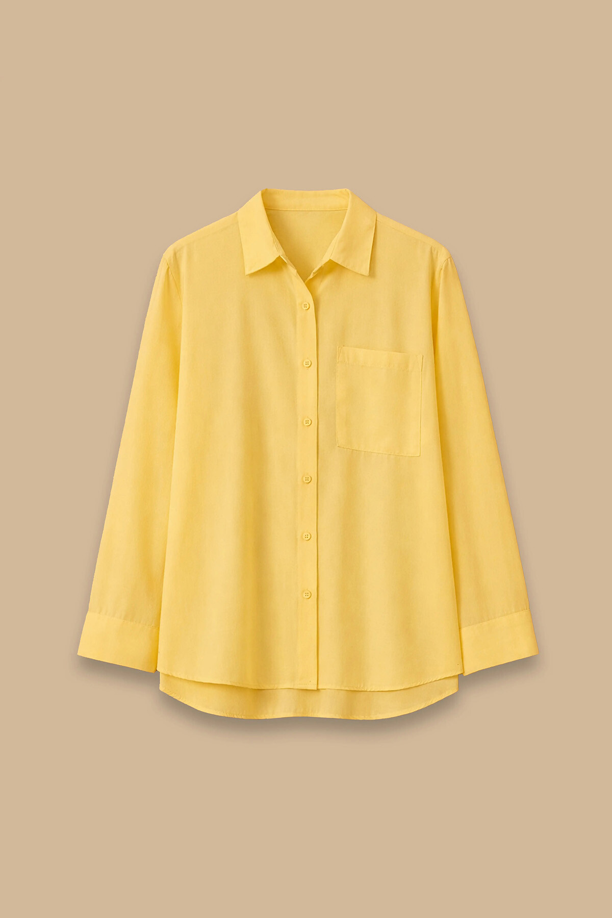 Sarı tonunun enerjik ve tazeleyici ruhunu, "sessiz lüks" akımının çabasız zarafetiyle gardırobunuza taşıyın. Nefes alabilen yüksek modal içerikli pürüzsüz dokusu, gün boyu teninizde üstün bir ferahlık ve konfor hissi bırakır. Düşük omuzlu dökümlü kesimi ve göğüsteki zarif tek cep detayı stili modernleştirirken; sırt kısmındaki roba ve pile tasarımı maksimum hareket özgürlüğü sağlar. Kavisli etek ucu detayıyla, kumaş pantolonlardan hafta sonu jeanlerinize kadar her parçayla kusursuz bir uyum yakalayan pratik ve premium bir kurtarıcıdır.