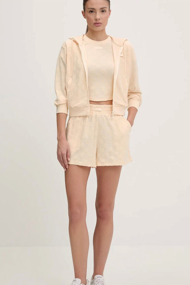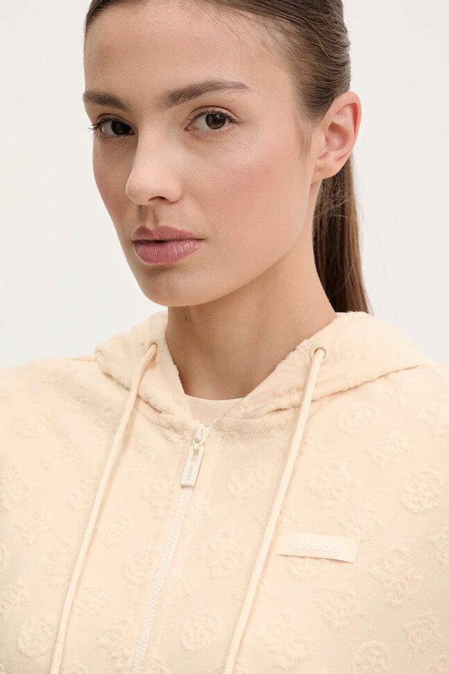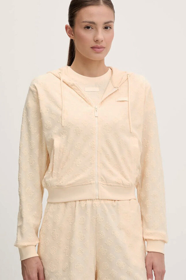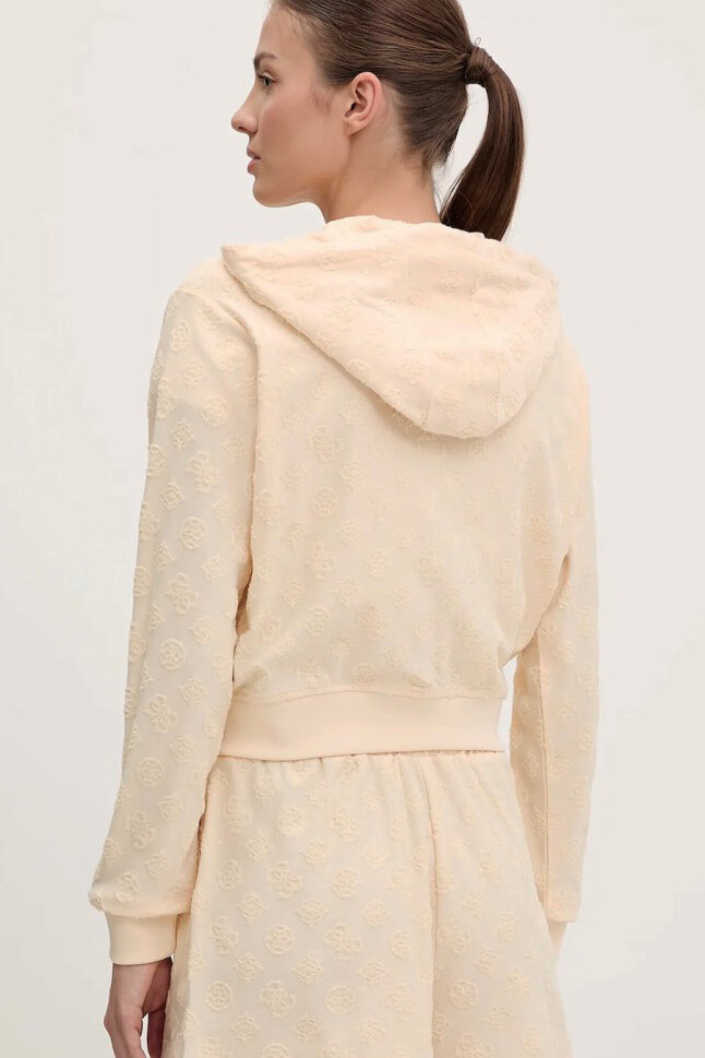 Pastel tonların en zarif halini yansıtan bu sweat, jakar dokuma kumaşının sunduğu zengin dokuyla spor giyime lüks bir yorum getiriyor. Kumaşın tamamına yayılan kabartmalı logo ve desen detayları, tek renkli tasarıma derinlik ve hareket kazandırır. Bel hizasında biten 45 cm'lik modern crop kesimi ve tam boy fermuarlı yapısı, pratik ve dinamik bir kullanım sunar. Kapüşonlu ve ipli yakası sportif ruhu korurken, %75 Polyester ve %25 Pamuk karışımlı tok kumaşı formunu uzun süre muhafaza eder. Astarsız yapısıyla mevsim geçişlerinde hafif bir dış katman olarak veya mont içine giymek için idealdir.