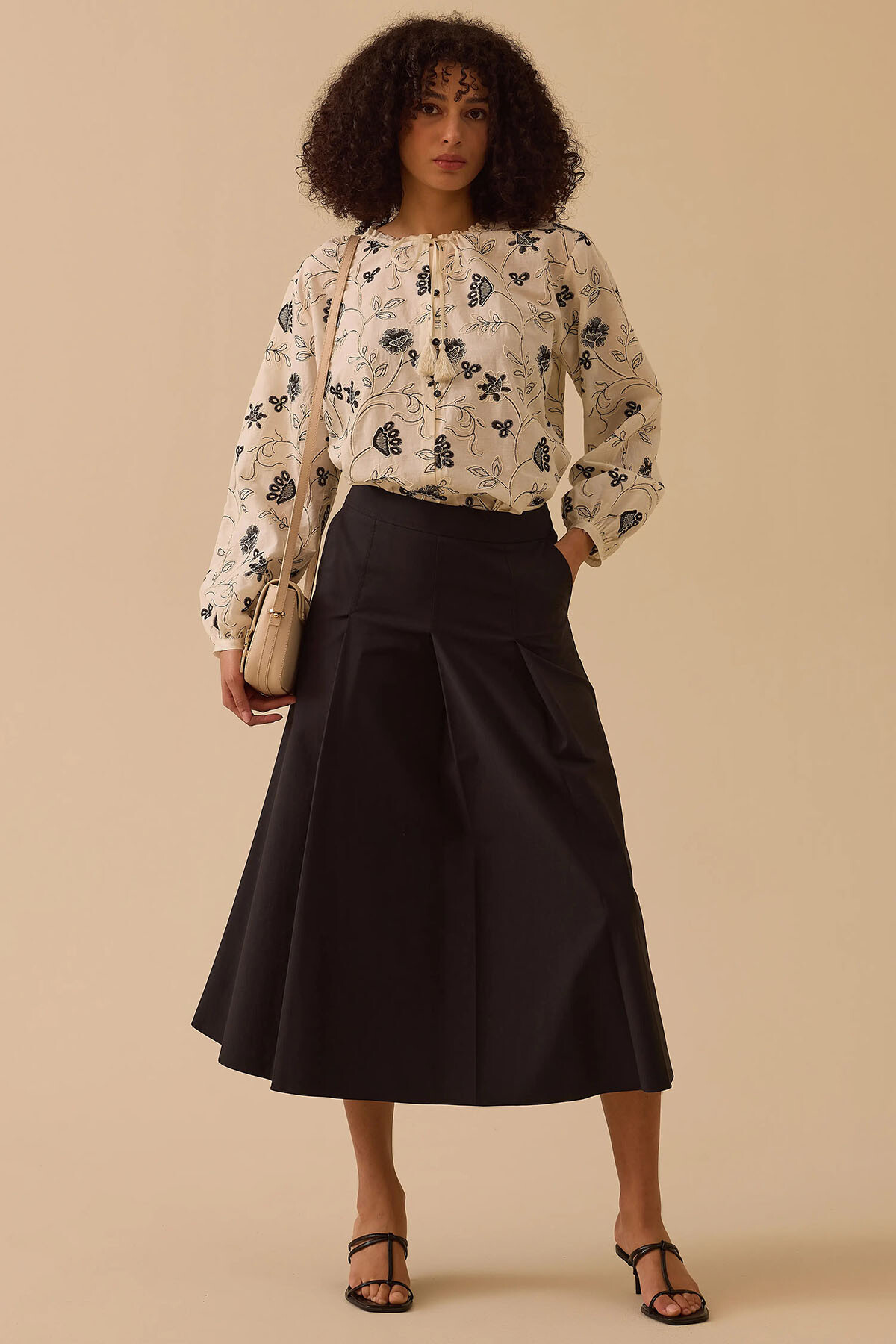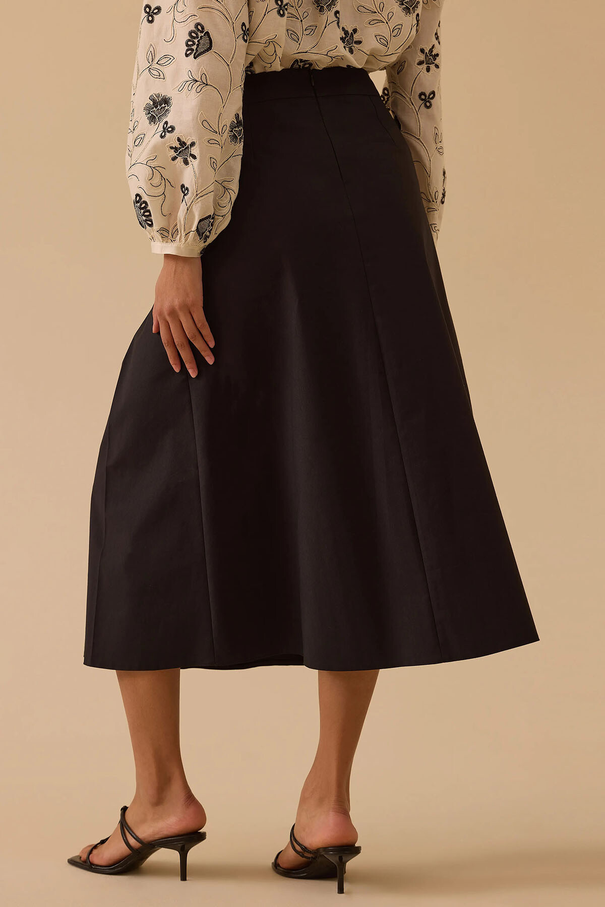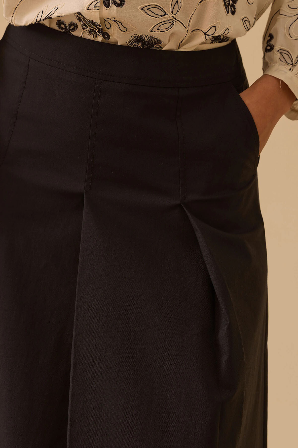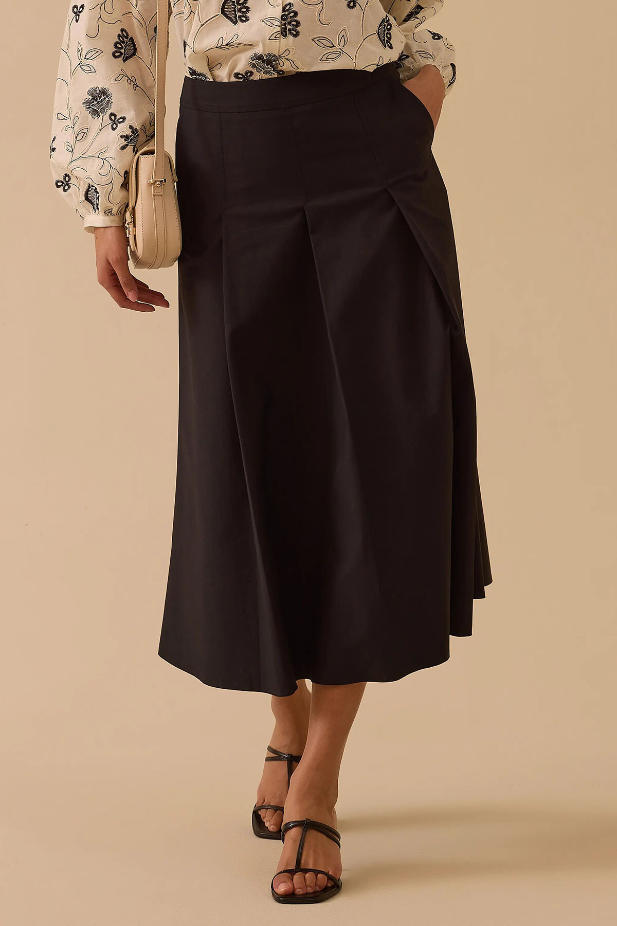 Siyahın zamansız asaletini lüks terzi işçiliğiyle buluşturan bu tasarım, ofis stilinizden şık davetlere kadar en zarif eşlikçiniz olmak için tasarlandı. Pamuk ağırlıklı nefes alabilen dokusu gün boyu üstün konfor sunarken; belden aşağı inen derin pile (katlama) detayları ve işlevsel yan cepleri silüetinize modern bir dinamizm katar. Bele tam oturan fermuarlı yapısı ve aşağı doğru zarifçe genişleyen A kesim dökümlü midi boyuyla, her adımınızda premium bir duruş sergiler.