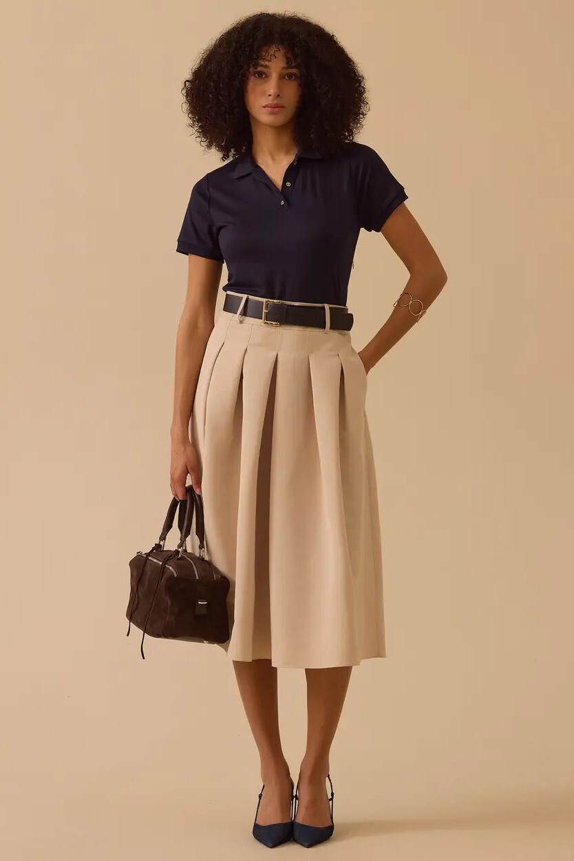 Sportif şıklığı klasik detaylarla harmanlayan bu lacivert elbise, çift parça görünümü veren özgün tasarımıyla hem ofis stilinizde hem de günlük kullanımda fark yaratır. Keskin hatlara sahip polo yakası ve düğmeli üst gövdesi, pileli etek formuyla birleşerek hareketli ve dinamik bir silüet oluşturur.