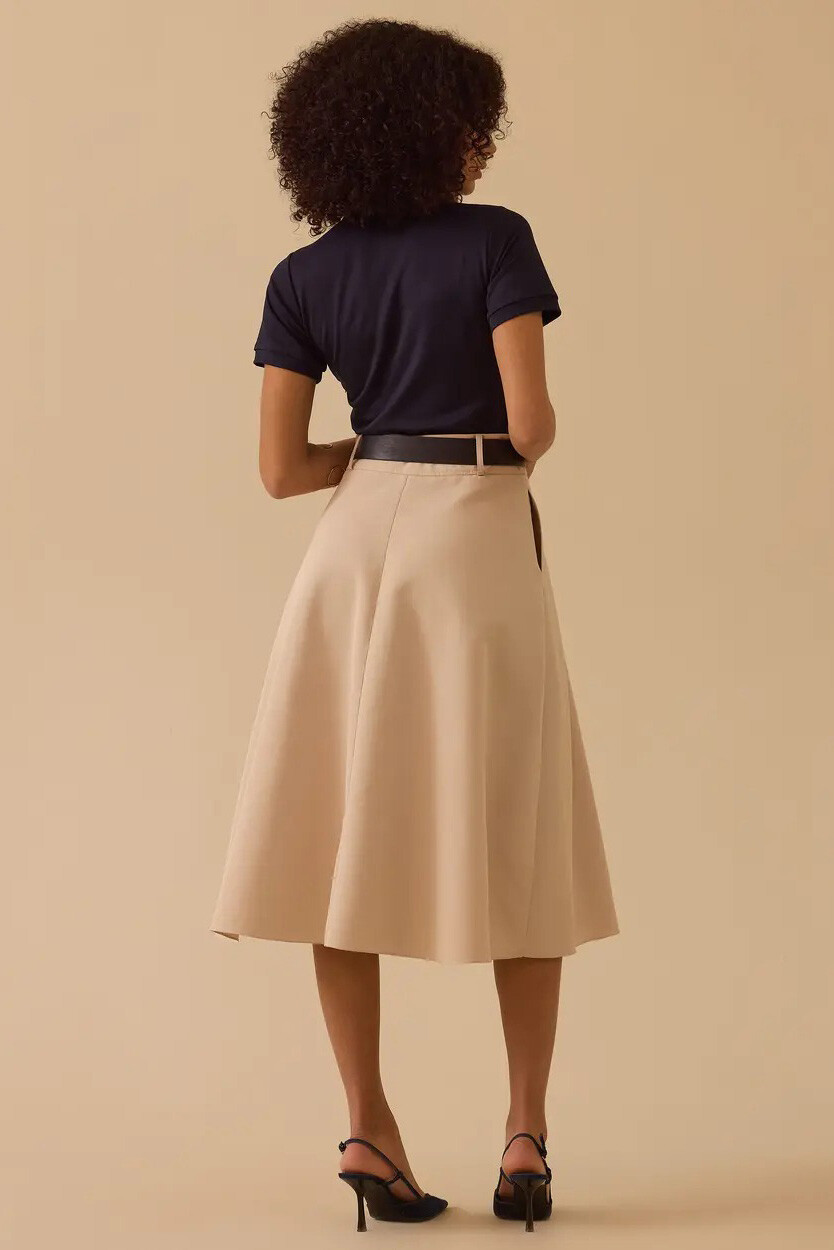 Bele oturan yapısı ve tamamlayıcı kemer detayı sayesinde vücut hatlarınızı zarifçe vurgulayan bu midi boy tasarım, her adımda asil bir döküm sunar. Modern, rahat ve zamansız bir parça arayanlar için stil sahibi bir tercih.