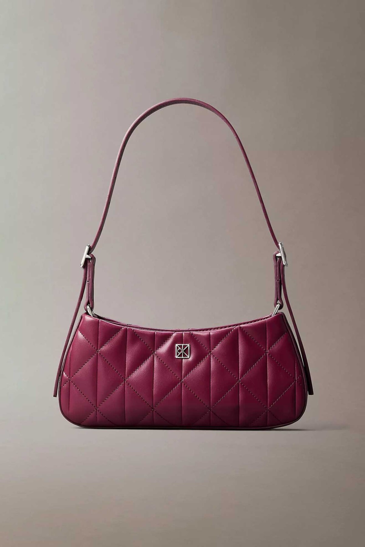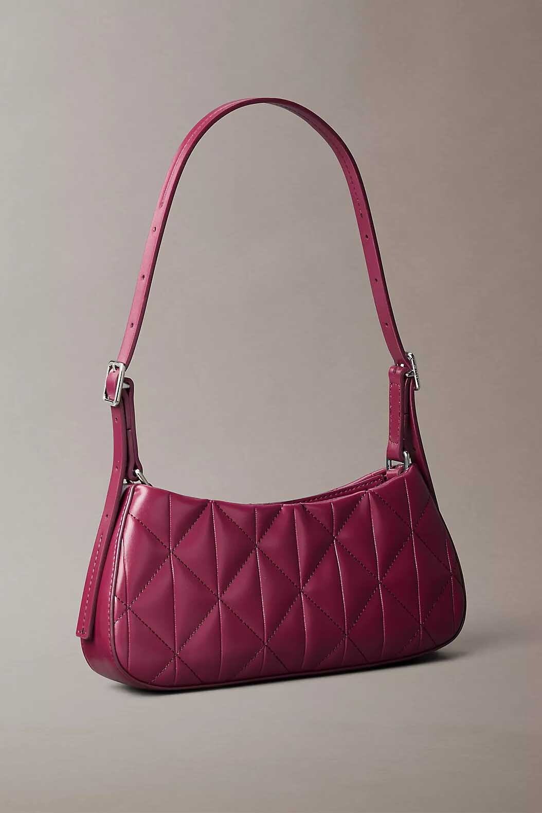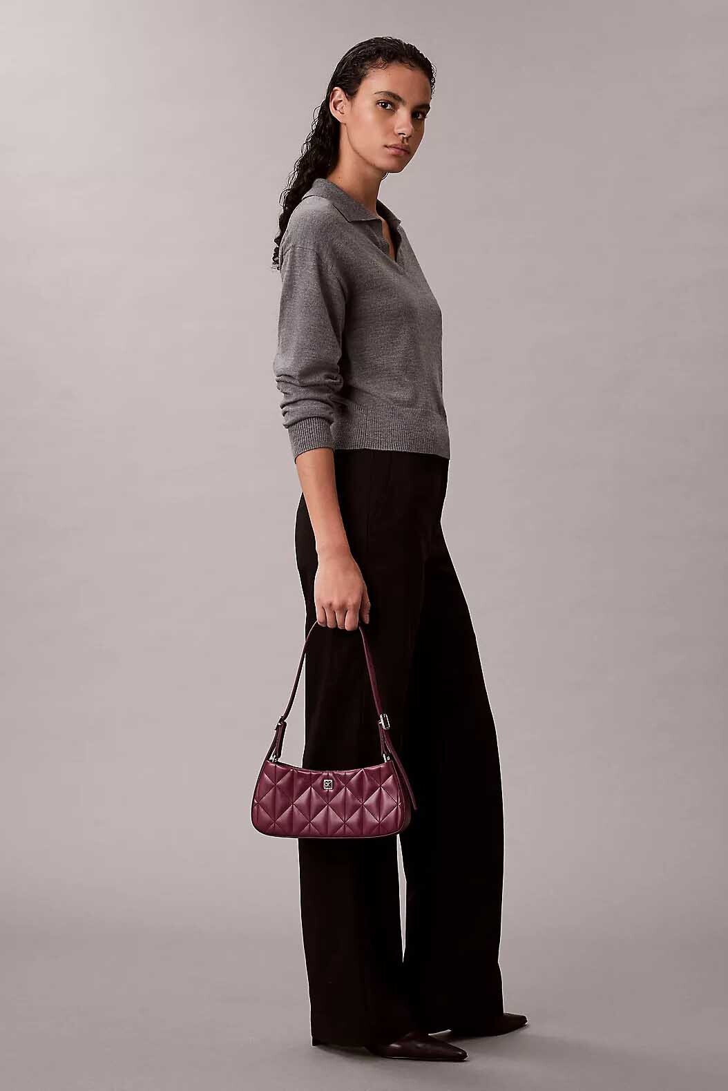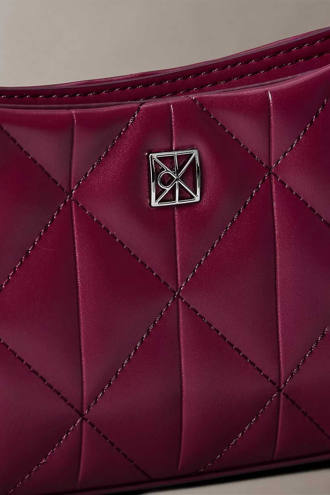 Zarif kapitone dokusunu modern ve kompakt bir silüetle birleştiren bu küçük omuz çantası, günlük stilinize sofistike bir renk katıyor. %100 poliüretan malzemeden üretilen pürüzsüz dış yüzeyi, derin mürdüm tonuyla birleşerek şık bir görünüm sunar. Ön panelde yer alan geometrik baklava desenli kapitone dikişler ve minimal gümüş renkli logo amblemi, çantanın karakteristik tasarımını tamamlar.
