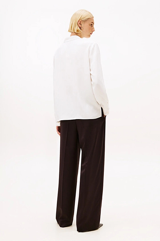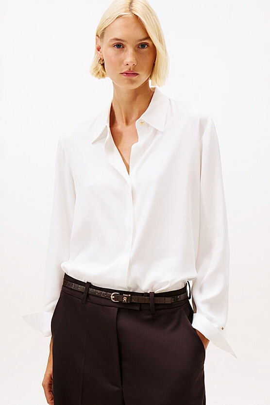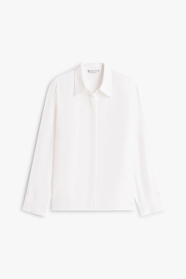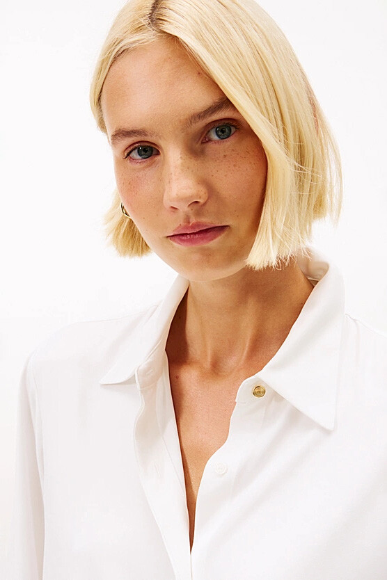 Zarif ve minimalist bir estetik sunan bu gömlek, gardırobunuzun en zamansız parçalarından biri olmaya adaydır. Yumuşak dokusu ve dökümlü duruşuyla bilinen kaliteli viskon twill kumaştan üretilmiştir. Tasarımın en dikkat çekici özelliği olan gizli düğme patı, gömleğe pürüzsüz, net ve sofistike bir görünüm kazandırır. Hem ofis şıklığında hem de günlük kombinlerde rahatlıkla kullanabileceğiniz bu parça, her stile zahmetsizce uyum sağlar.