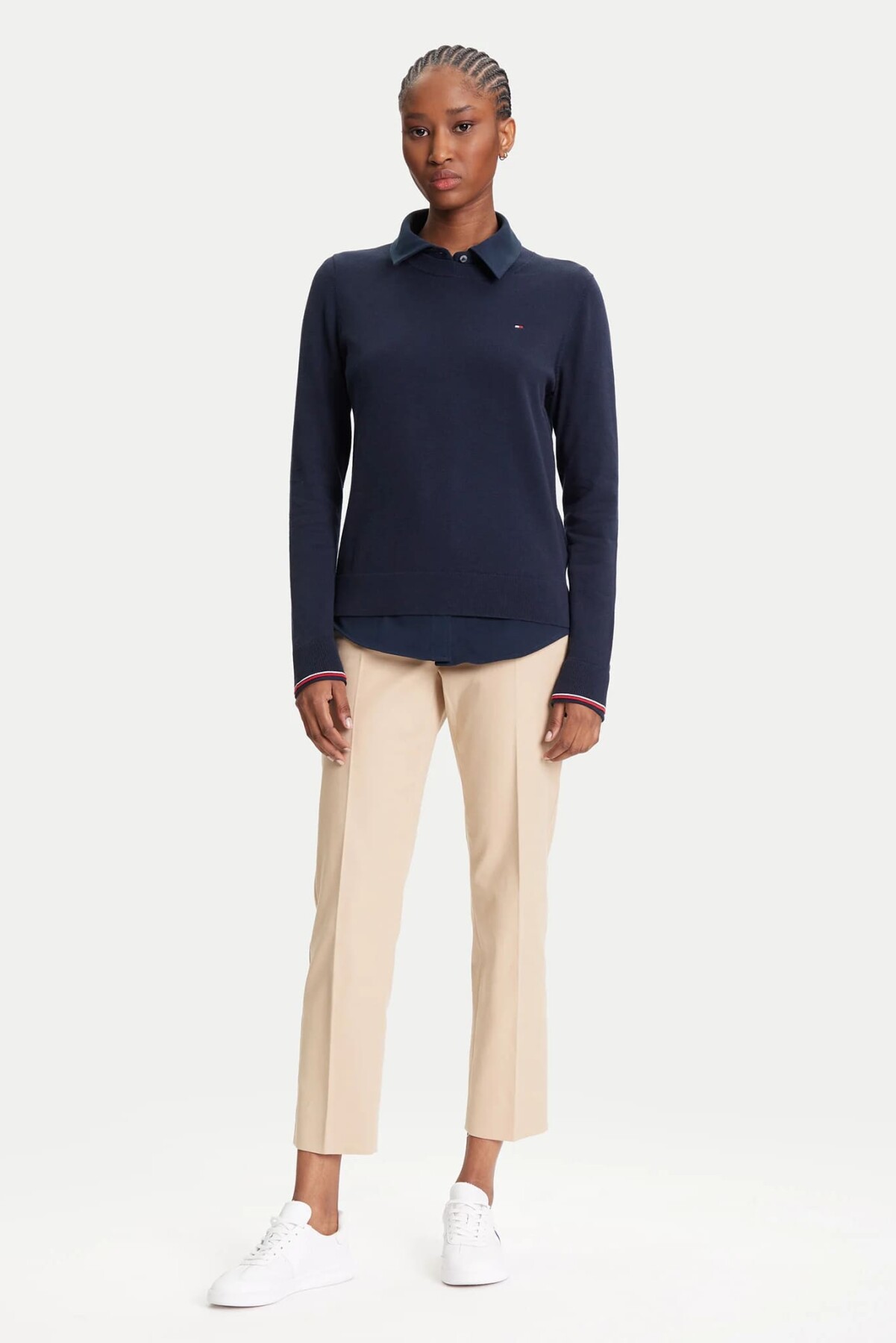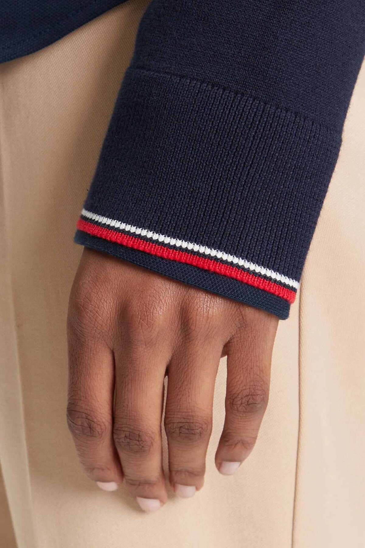 Klasik ve sofistike bir stilin vazgeçilmezi olan bu triko kazak, gardırobunuza zamansız bir şıklık katıyor. Yumuşak pamuk karışımlı dokusuyla gün boyu konfor sunarken, katlandığında ortaya çıkan renkli çizgilere sahip manşetleri tasarıma sürpriz ve şık bir dokunuş ekliyor. Regular fit (tam kalıp) kesimi sayesinde hem tek başına hem de, görseldeki gibi, gömlekler üzerine rahatlıkla giyilebilir.