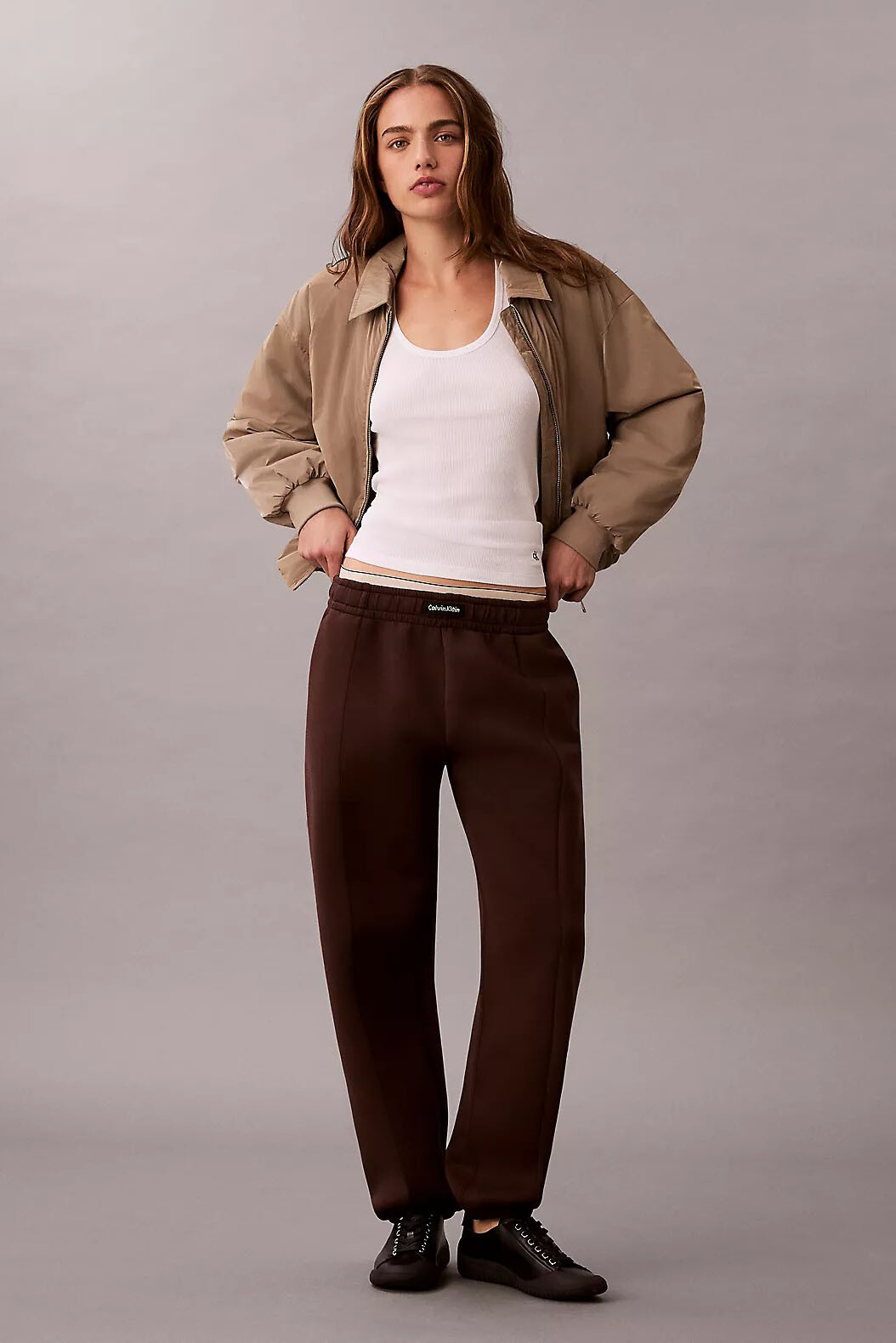 Tasarımın ön kısmında yer alan dikey dikiş (çıma) detayları, jogger formuna yapılandırılmış bir pantolon havası kazandırırken silüeti daha zarif gösterir. Elastik bel bandı ve paça kısımlarındaki ribana detayları vücuda tam uyum sağlarken hareket özgürlüğü sunar. Arka bel panelinde yer alan ikonik marka ibareli siyah etiket, tasarıma sofistike bir imza katar. Astarsız ve fermuarsız yapısıyla pratik bir kullanım sağlayan bu model, tam kalıp özellikleri ve 96 cm boyuyla modern bir görünüm vadeder.