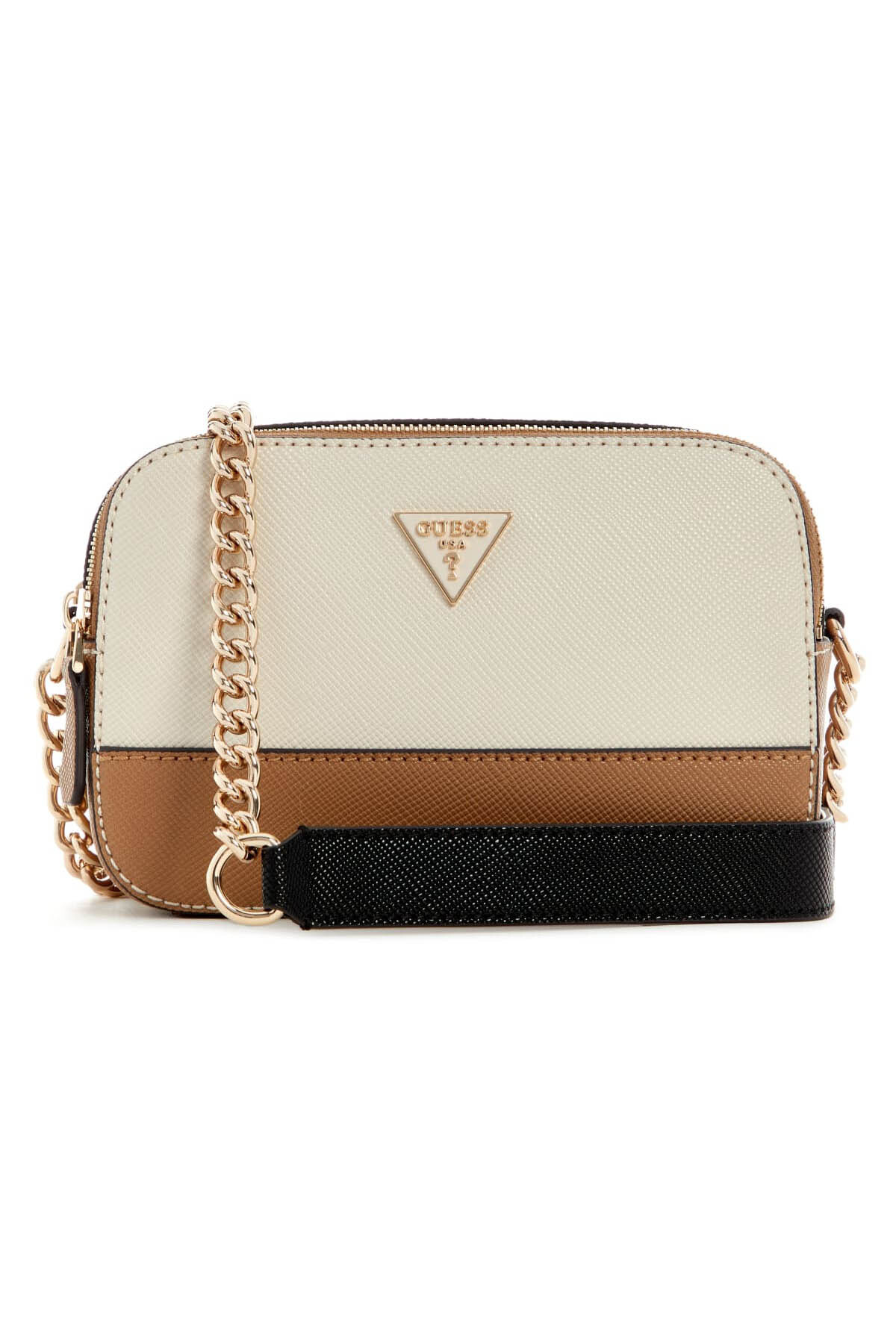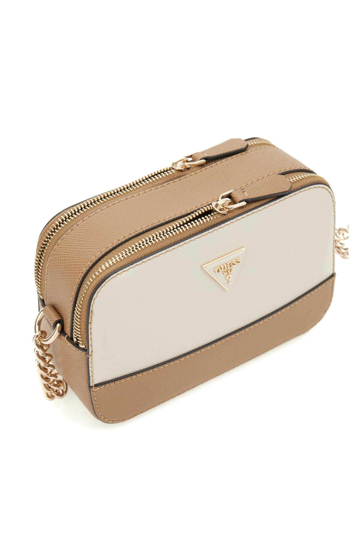 Hem şık hem de son derece fonksiyonel olan bu çapraz askılı çanta, popüler "kamera çantası" silüetini renk bloklu bir tasarımla birleştirir. Kırık beyaz ve taba renkli paneller, çantaya modern ve dinamik bir görünüm kazandırır. Dokulu poliüretan yüzeyi ve parlak altın tonlarındaki metal aksesuarları, sofistike bir uyum yakalar. İki ayrı fermuarlı ana bölmesi sayesinde eşyalarınızı düzenli ve güvenli bir şekilde saklama imkanı sunar.
