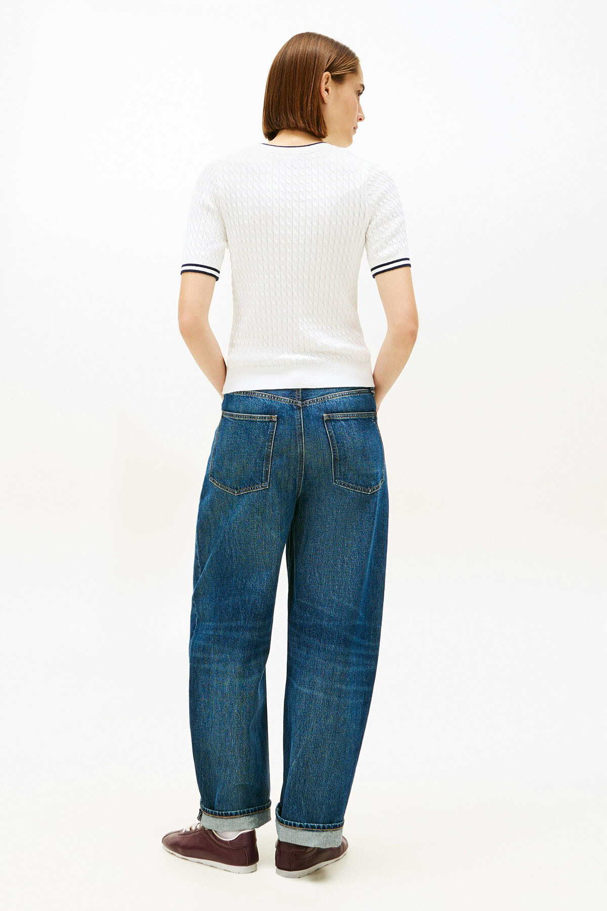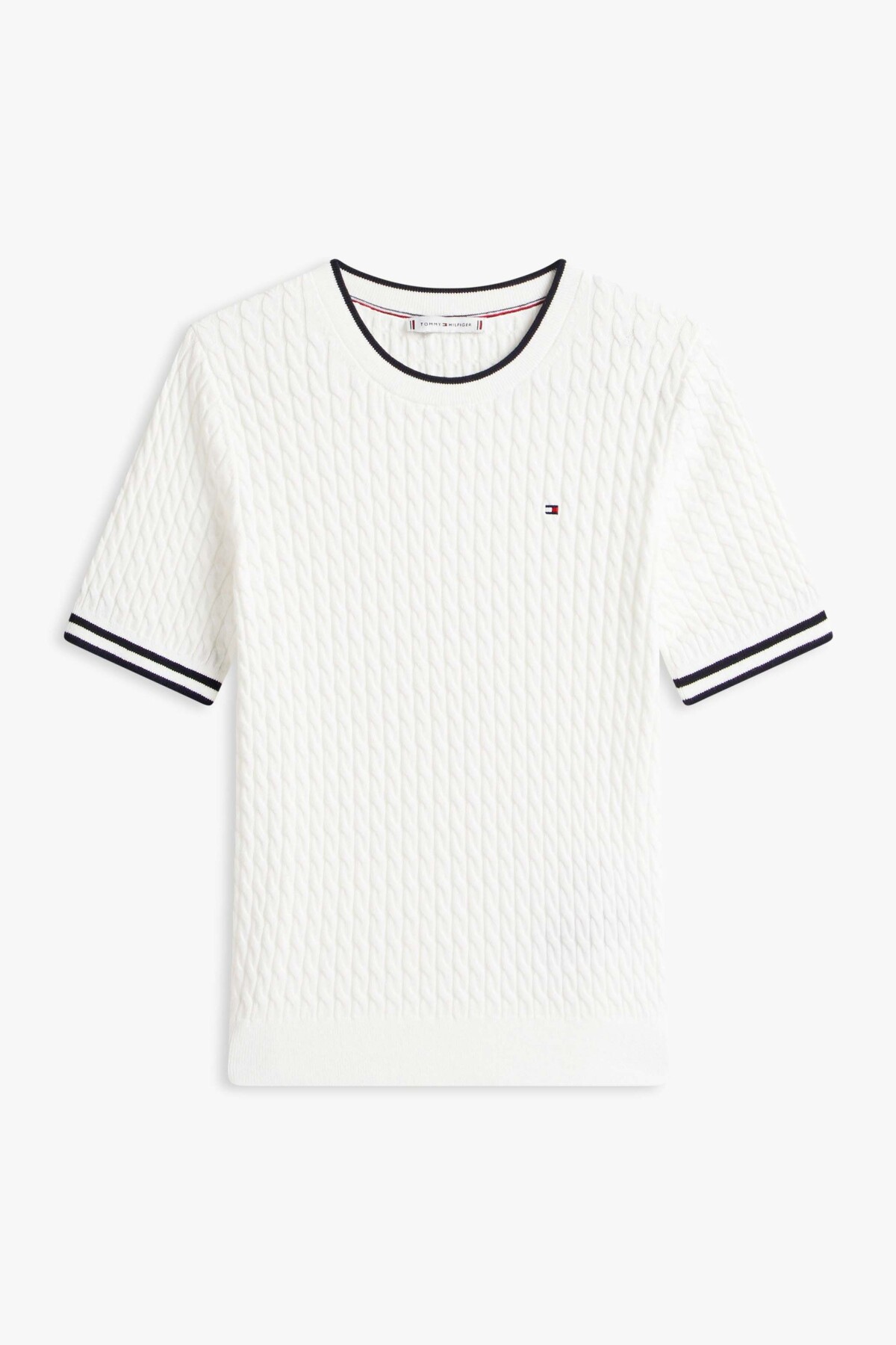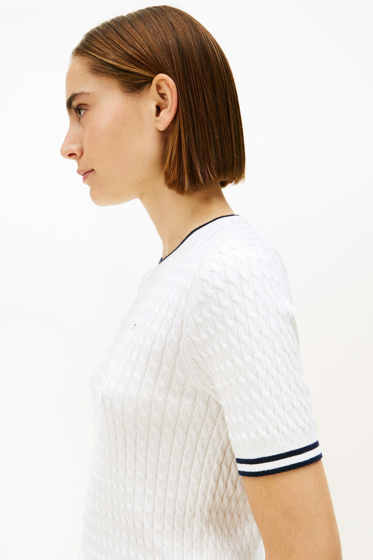 %100 pamuklu yumuşak dokusu ve klasik saç örgü deseniyle zamansız bir şıklık sunar. Bisiklet yaka ve manşetlerdeki kontrast şerit detayları, sade tasarıma modern ve sportif bir hava katarak kolej stili esintileri taşır. Vücudu nazikçe saran yapısı ve kısa kollu tasarımı sayesinde mevsim geçişlerinde tek başına veya ceket içlerinde katmanlı olarak kullanılabilir. Göğüs kısmındaki minimalist nakış logo, zarif bir tamamlayıcı olarak öne çıkar.