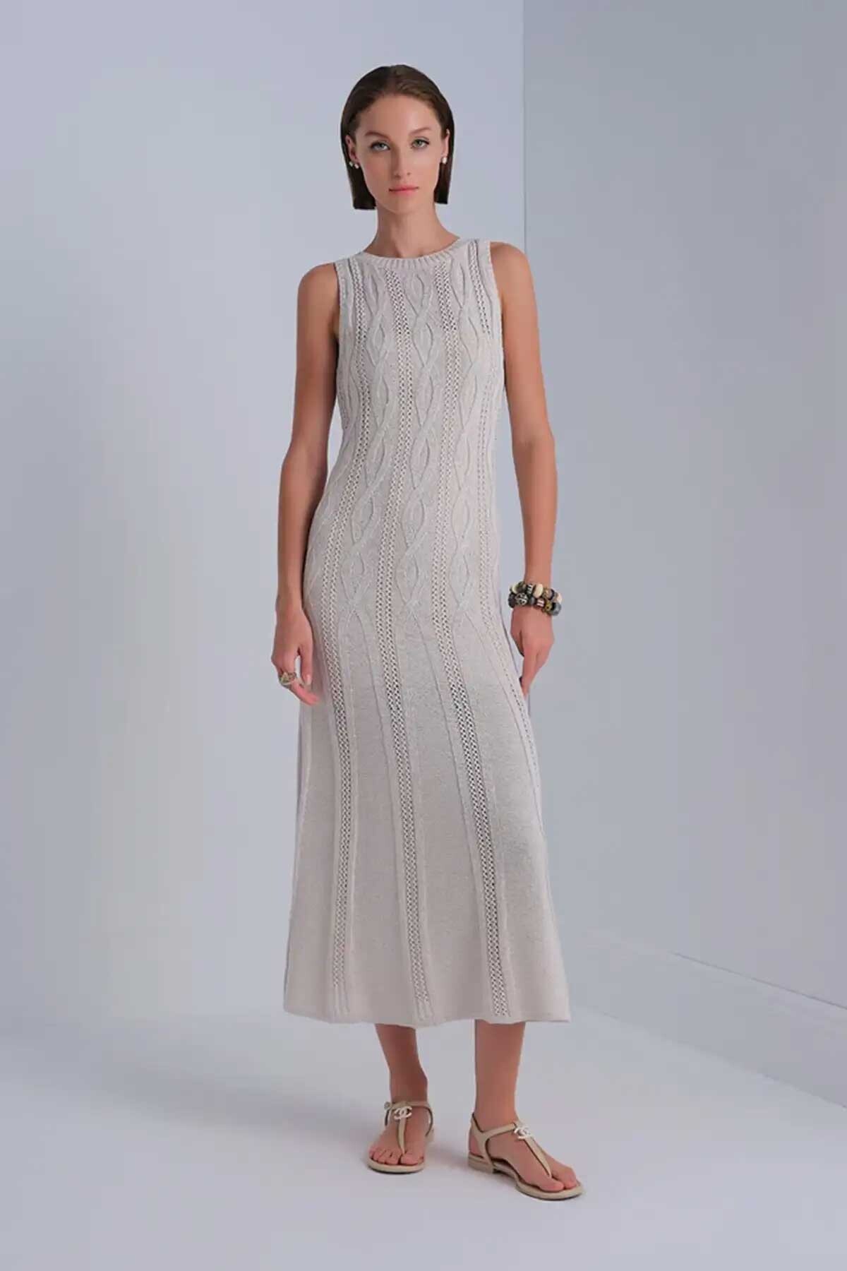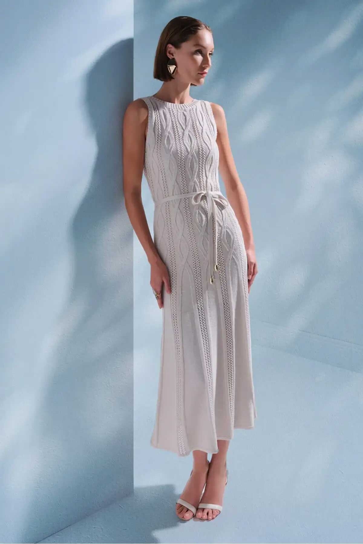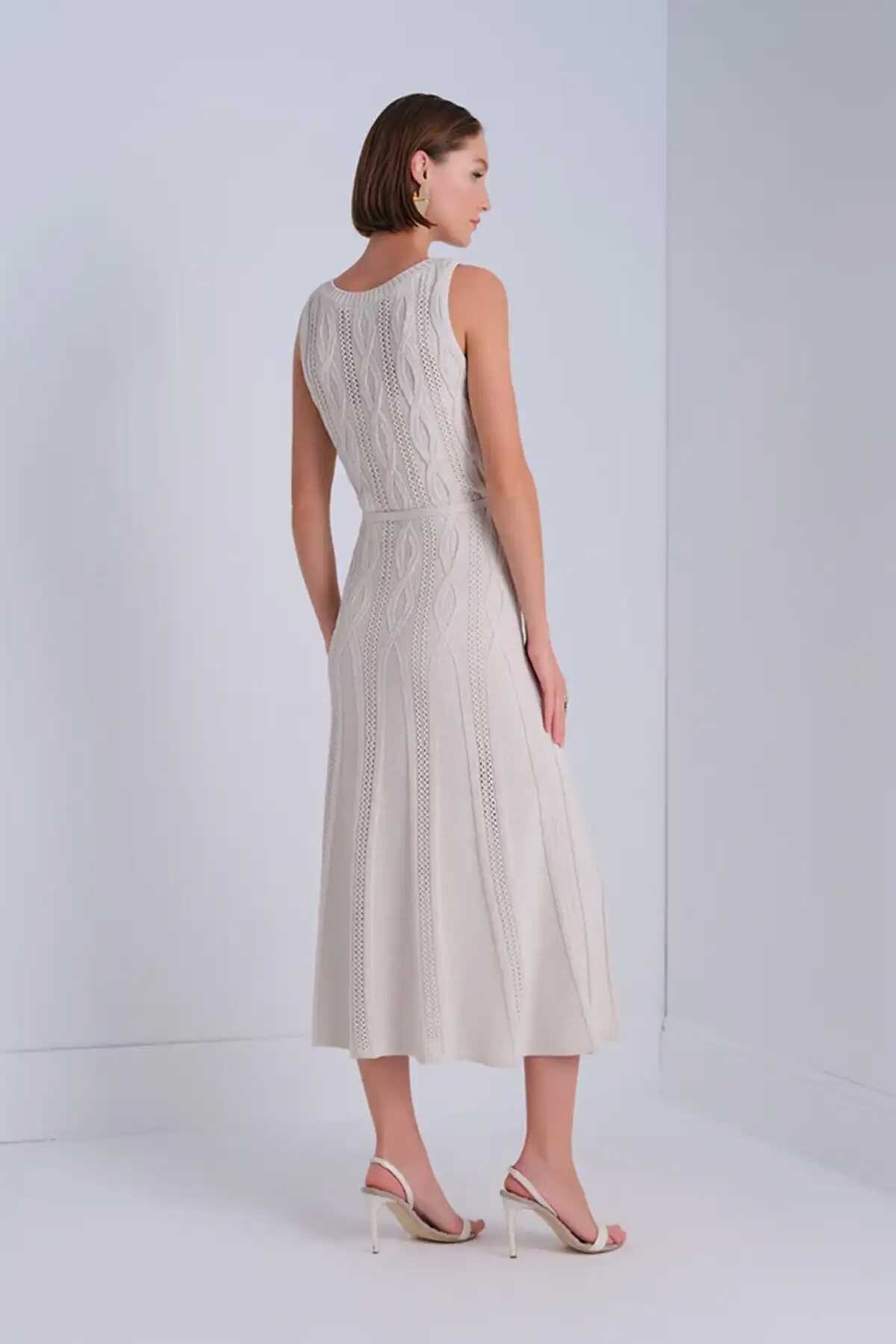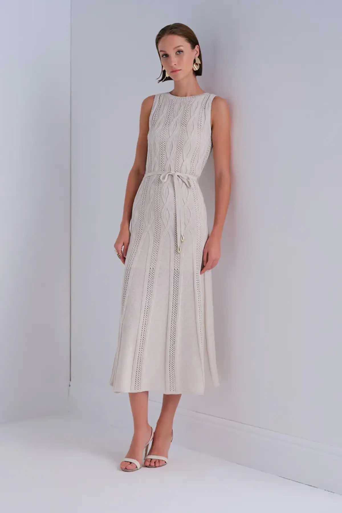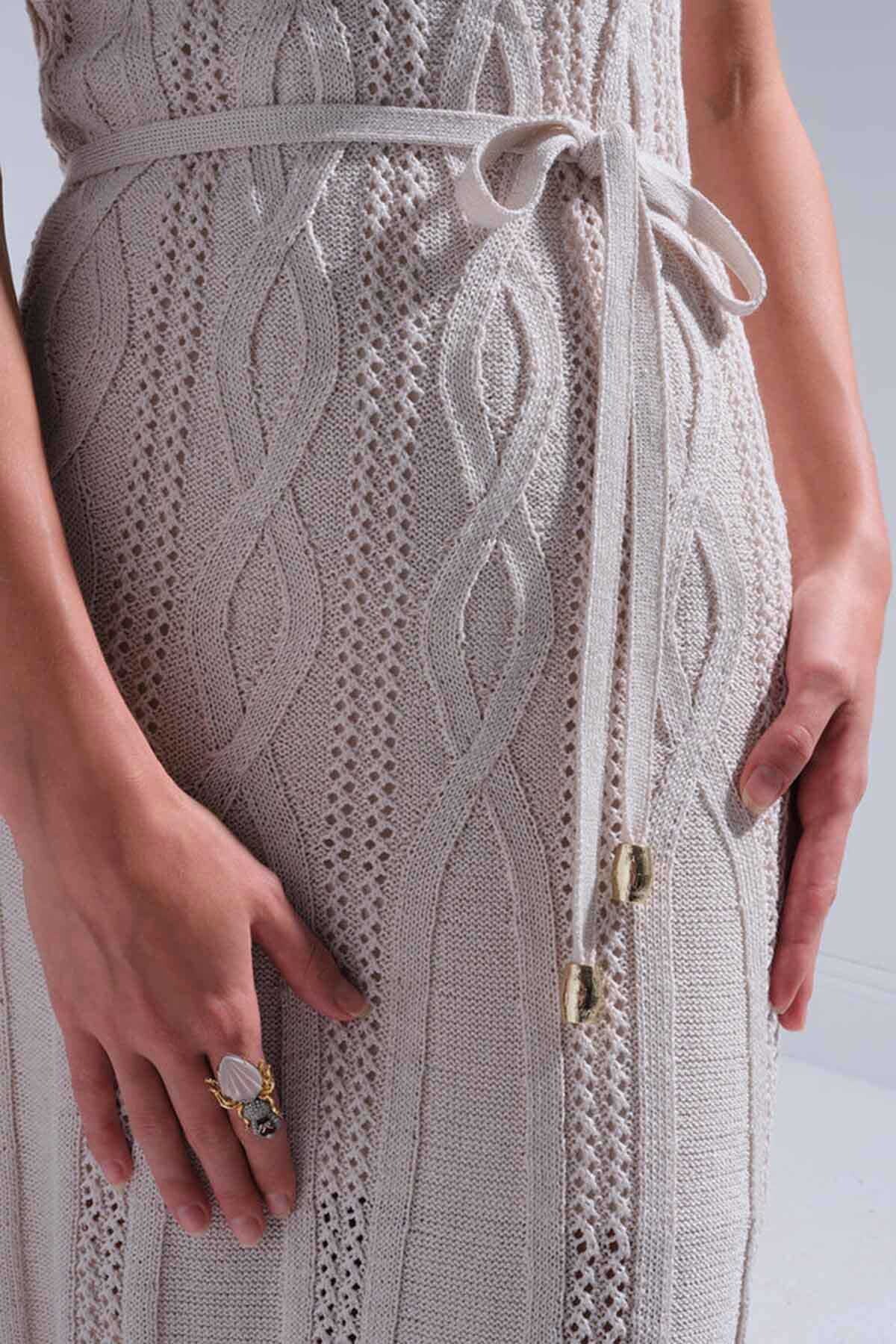 Kadın Saç Örgü Detaylı Kuşaklı Midi Elbise - Bej